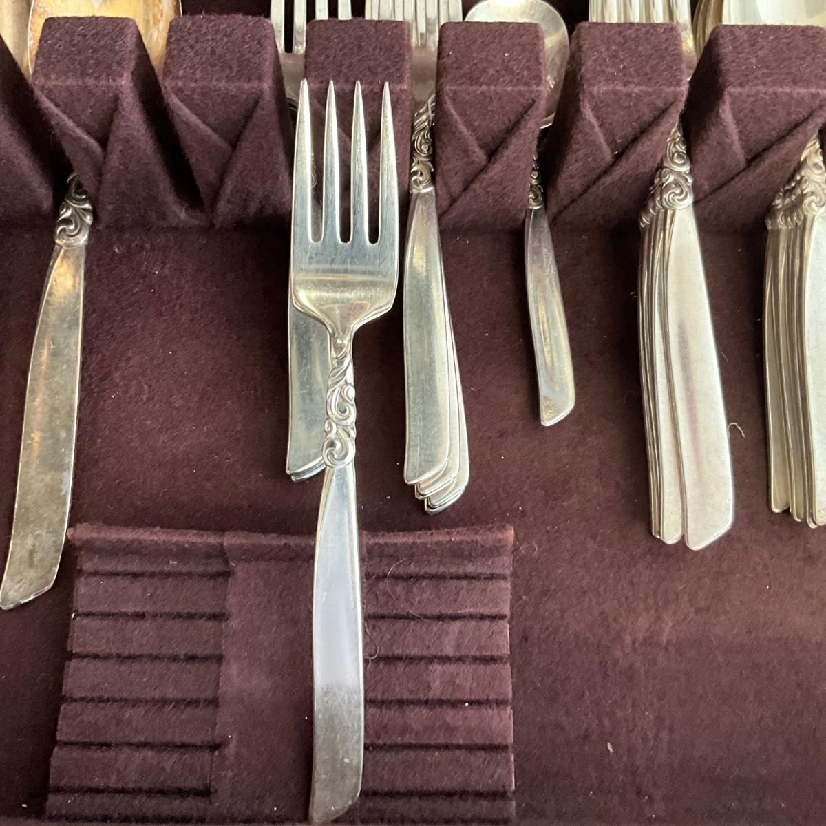 8- salad forks, 1 sugar spoon, 7 dinner forks, 7 tablespoons, 16 teaspoons, 8 knives, 2 large serving spoons