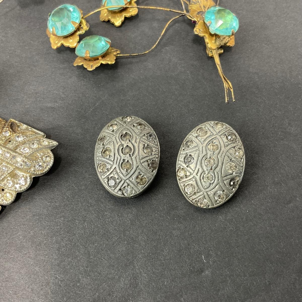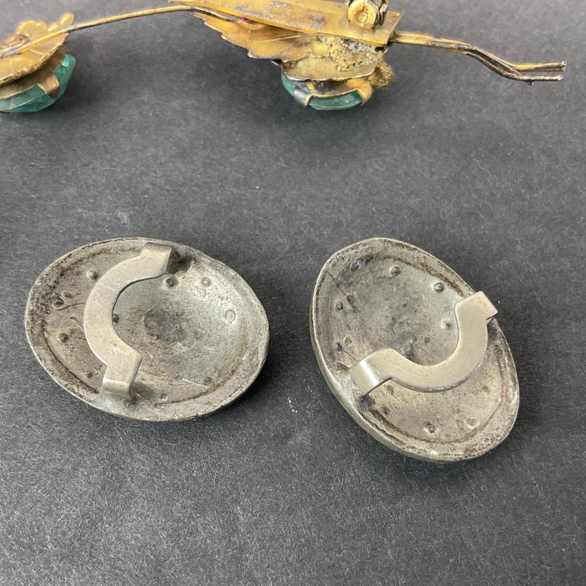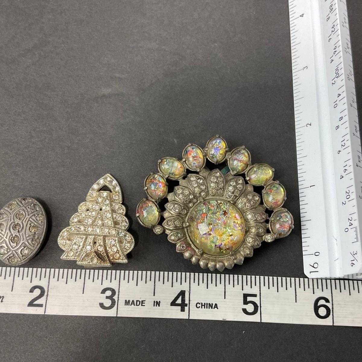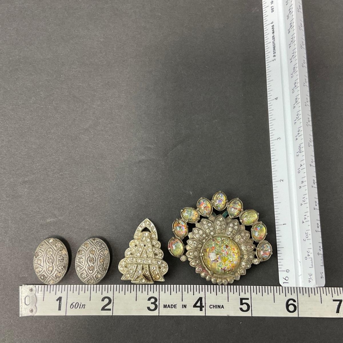 This is a lot of assorted bits and pieces including two vintage show clips two button covers, and two believed to be sterling wire pin back pieces. Please see photos for details and condition. Any condition statement is given as a courtesy to a client, is an opinion, and should not be treated as a statement of fact. Reference to condition written, oral or within a condition report shall not be regarded as a full account of condition and may not include all defects, alterations, or restorations. Absence of a condition report does not imply a lot is flawless or lacking imperfections or damage. Katherine’s Auction & Appraisal Service shall have no responsibility for any error or omission. Returns shall not be accepted on the basis of condition. ::: Shipping is available on this lot. If you require shipping you must let us know at the close of the auction. We will coordinate with you after the item has been won. Shipping fees will include insurance up to or exceeding the value of all items being mailed. If you have any questions regarding this lot please contact the auctioneer either via this website, by direct email or by phone. PICK UP TIMES and other important information can be found in the TERMS and DESCRIPTION of the auction. Please take a look for pertinent information. Thanks!