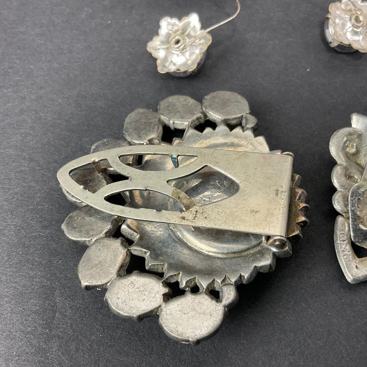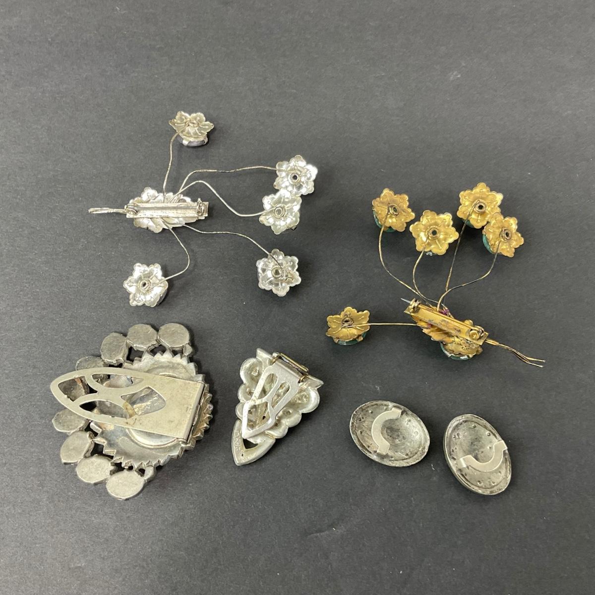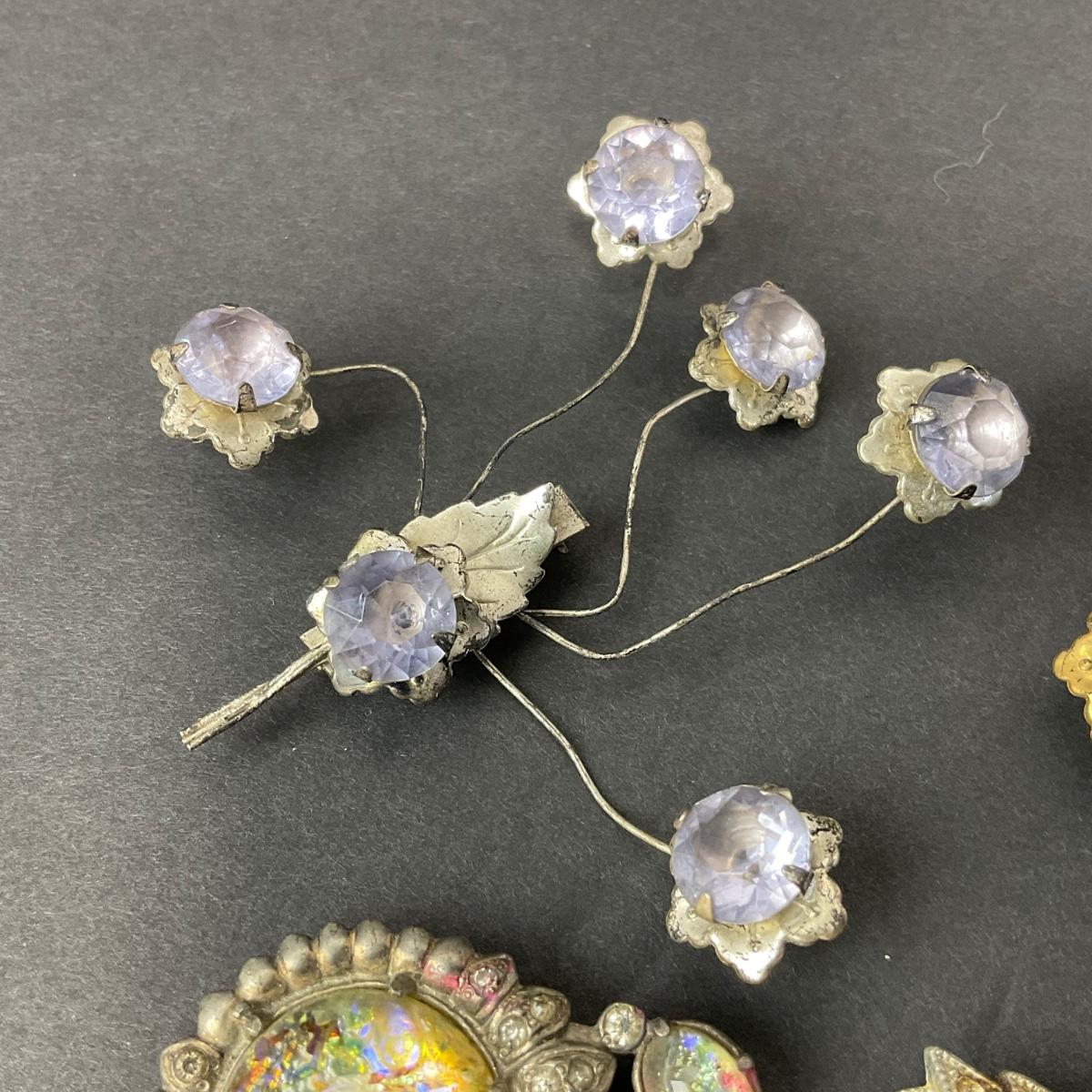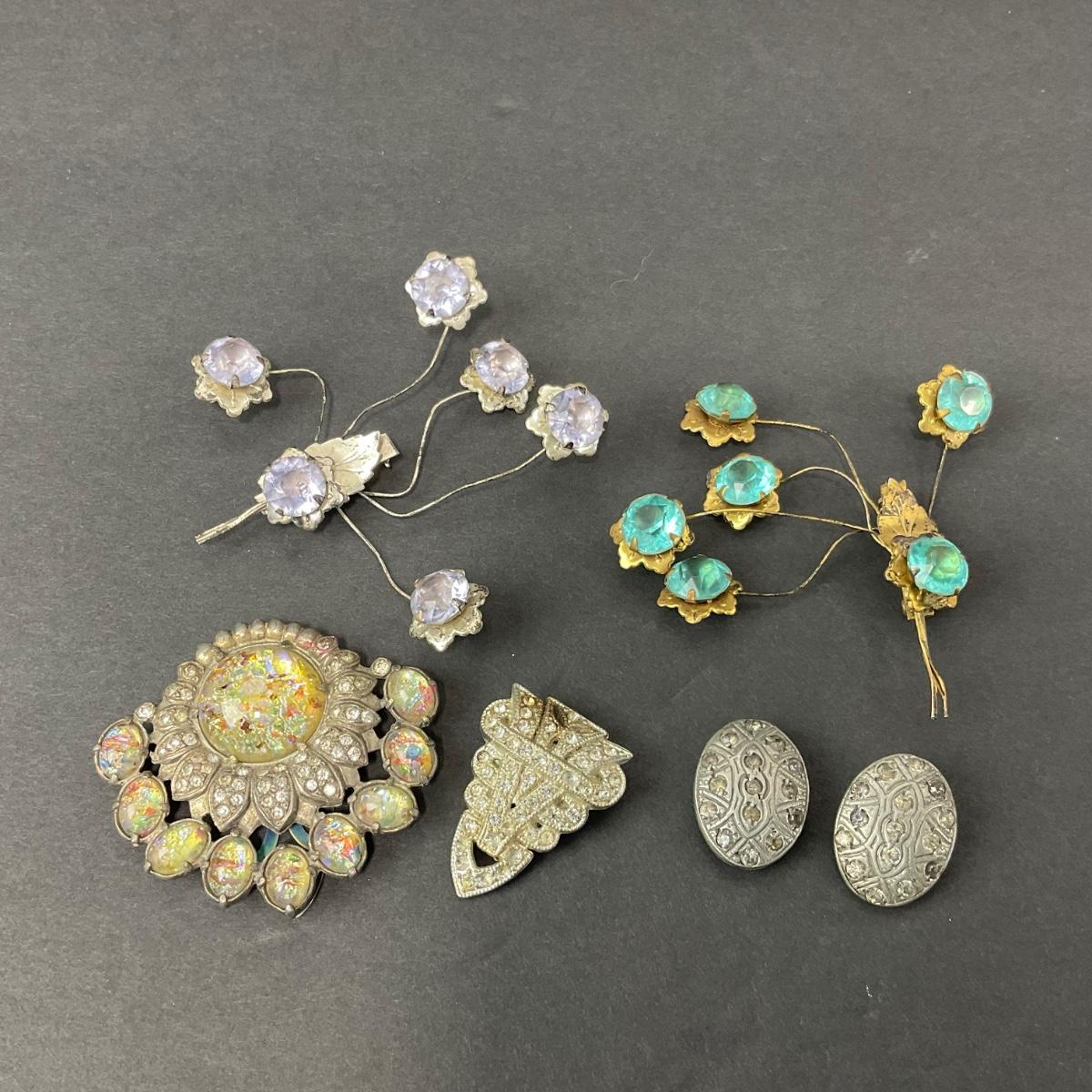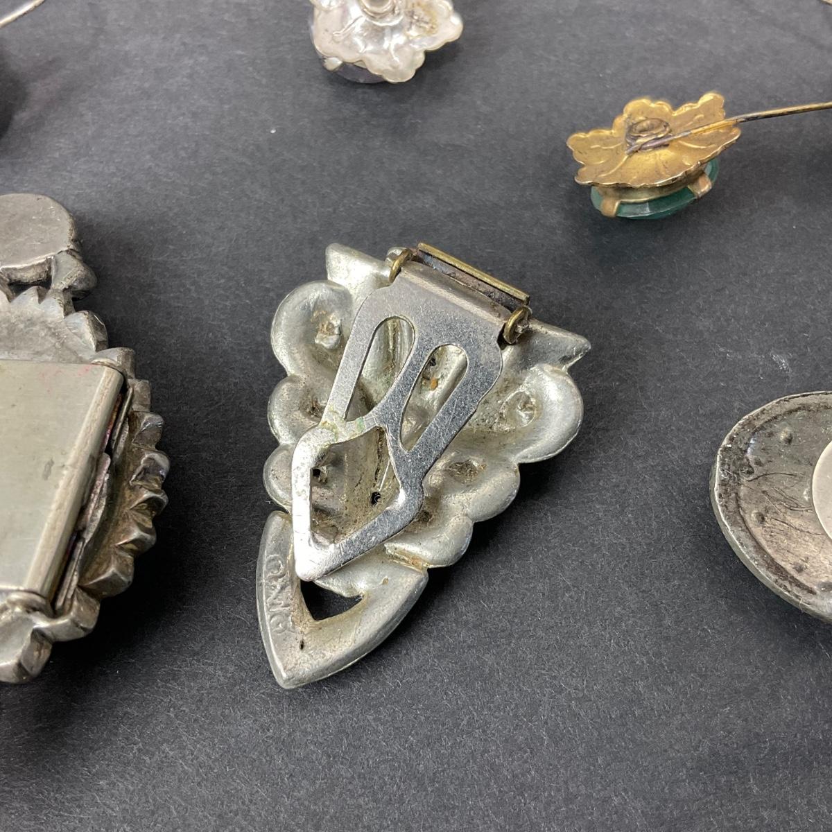This is a lot of assorted bits and pieces including two vintage show clips two button covers, and two believed to be sterling wire pin back pieces. Please see photos for details and condition. Any condition statement is given as a courtesy to a client, is an opinion, and should not be treated as a statement of fact. Reference to condition written, oral or within a condition report shall not be regarded as a full account of condition and may not include all defects, alterations, or restorations. Absence of a condition report does not imply a lot is flawless or lacking imperfections or damage. Katherine’s Auction & Appraisal Service shall have no responsibility for any error or omission. Returns shall not be accepted on the basis of condition. ::: Shipping is available on this lot. If you require shipping you must let us know at the close of the auction. We will coordinate with you after the item has been won. Shipping fees will include insurance up to or exceeding the value of all items being mailed. If you have any questions regarding this lot please contact the auctioneer either via this website, by direct email or by phone. PICK UP TIMES and other important information can be found in the TERMS and DESCRIPTION of the auction. Please take a look for pertinent information. Thanks!