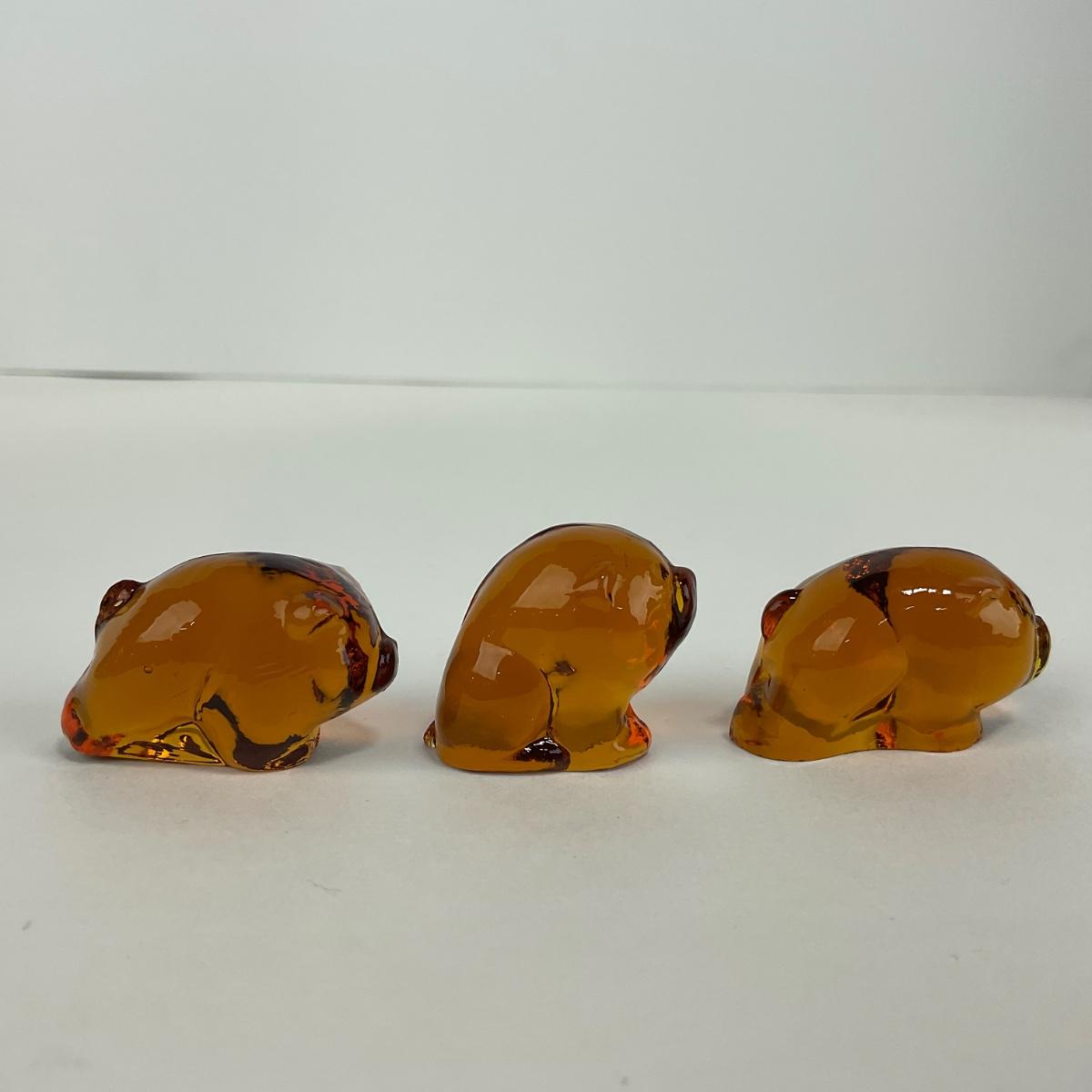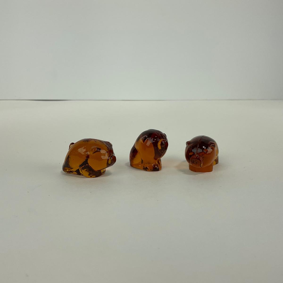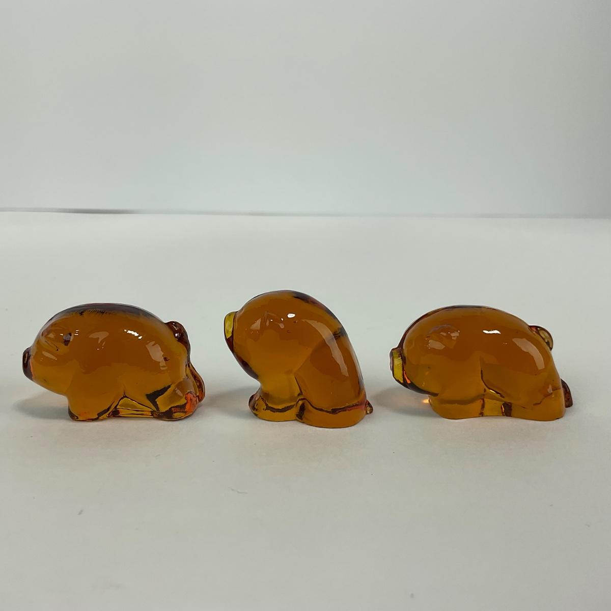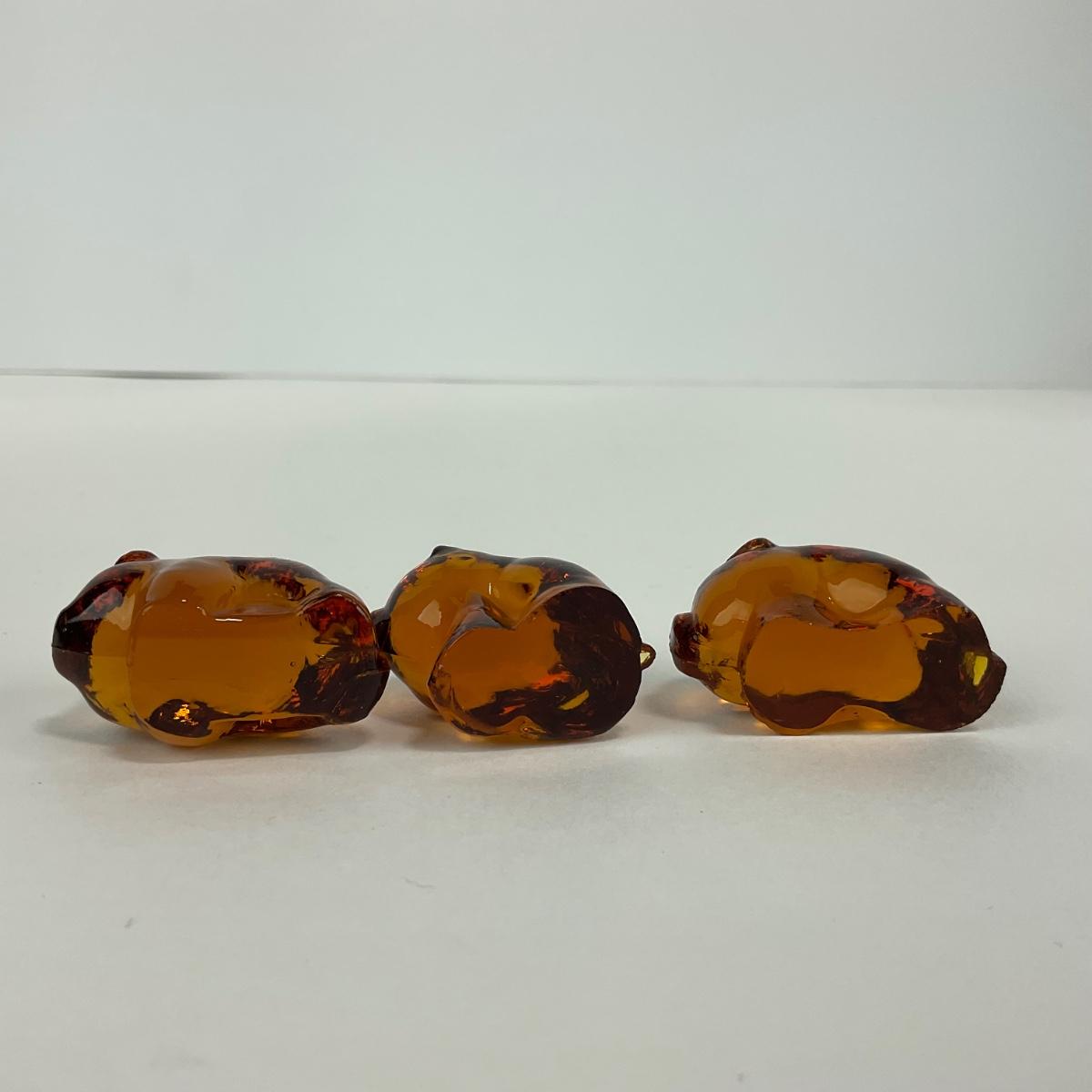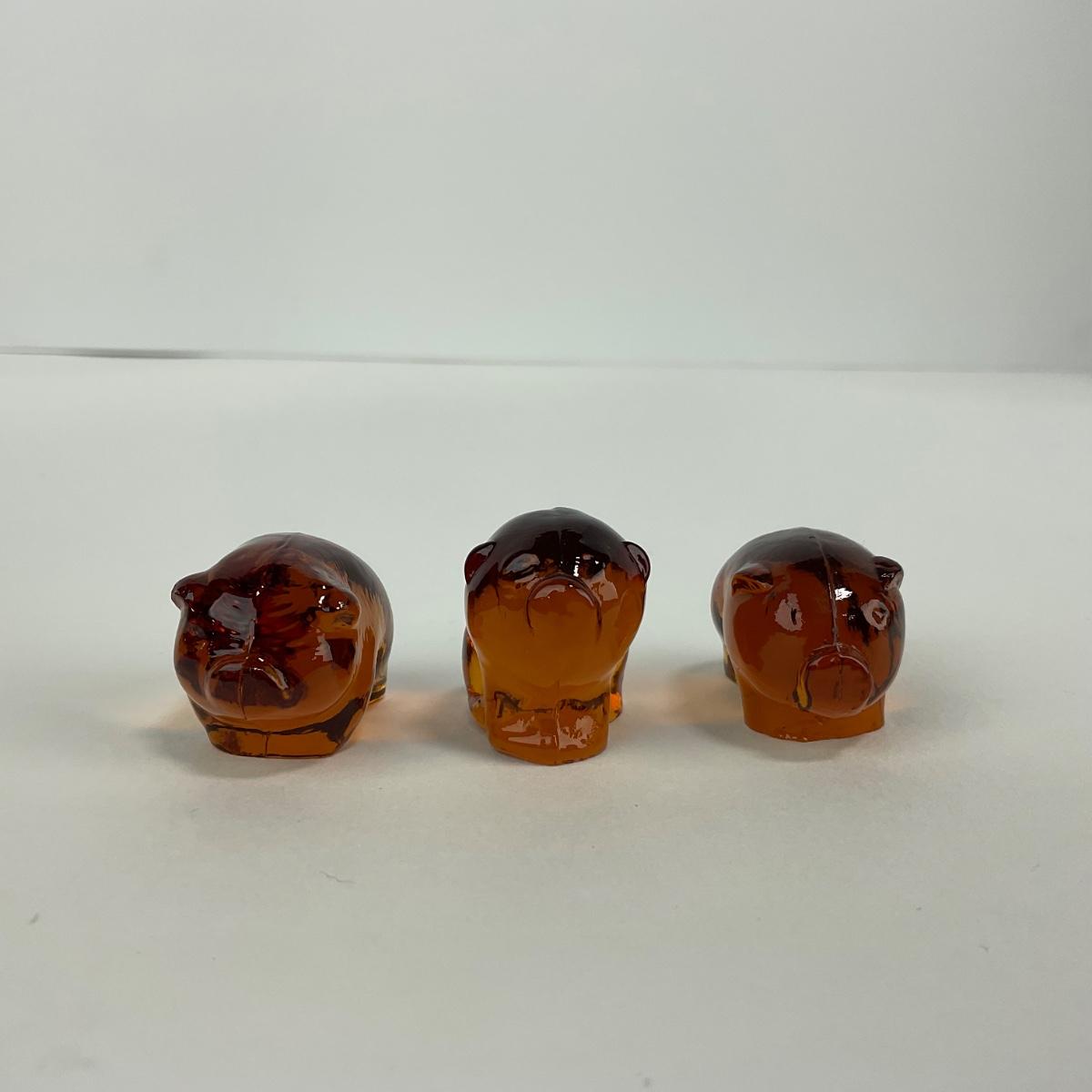 Three vintage Imperial amber piglet figures. Some small chip on the bottom rim. This piece does have some scuffs, scratches, marks, or slight damage, but otherwise appears to be in great shape. Please see photos for details and condition. Any condition statement is given as a courtesy to a client, is an opinion, and should not be treated as a statement of fact. Reference to condition written, oral or within a condition report shall not be regarded as a full account of condition and may not include all defects, alterations, or restorations. Absence of a condition report does not imply a lot is flawless or lacking imperfections or damage. Katherine’s Auction & Appraisal Service shall have no responsibility for any error or omission. Returns shall not be accepted on the basis of condition. ::: Shipping is available on this lot. If you require shipping you must let us know at the close of the auction. We will coordinate with you after the item has been won. Shipping fees will include insurance up to or exceeding the value of all items being mailed. If you have any questions regarding this lot please contact the auctioneer either via this website, by direct email or by phone. PICK UP TIMES and other important information can be found in the TERMS and DESCRIPTION of the auction. Please take a look for pertinent information. Thanks!