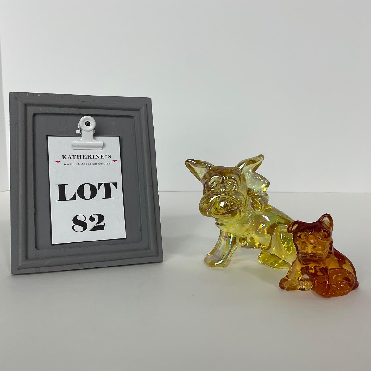 Two pieces including one marked yellow iridescent Imperial Bulldog figure and one smaller unmarked amber colored bulldog with a hole running though its mouth (Intentionally). This piece has no damage, and appears to be in great shape with no visable chips, cracks, or broken pieces. Please see photos for details and condition. Any condition statement is given as a courtesy to a client, is an opinion, and should not be treated as a statement of fact. Reference to condition written, oral or within a condition report shall not be regarded as a full account of condition and may not include all defects, alterations, or restorations. Absence of a condition report does not imply a lot is flawless or lacking imperfections or damage. Katherine’s Auction & Appraisal Service shall have no responsibility for any error or omission. Returns shall not be accepted on the basis of condition. ::: Shipping is available on this lot. If you require shipping you must let us know at the close of the auction. We will coordinate with you after the item has been won. Shipping fees will include insurance up to or exceeding the value of all items being mailed. If you have any questions regarding this lot please contact the auctioneer either via this website, by direct email or by phone. PICK UP TIMES and other important information can be found in the TERMS and DESCRIPTION of the auction. Please take a look for pertinent information. Thanks!