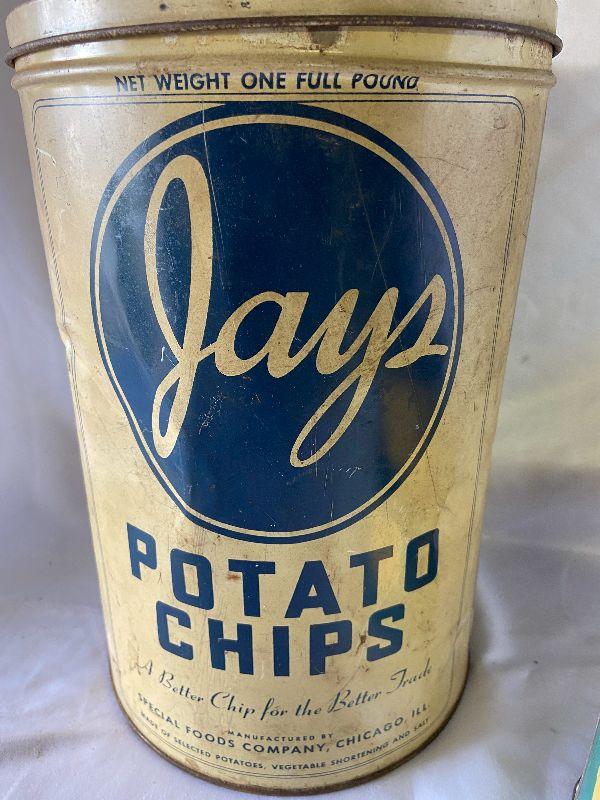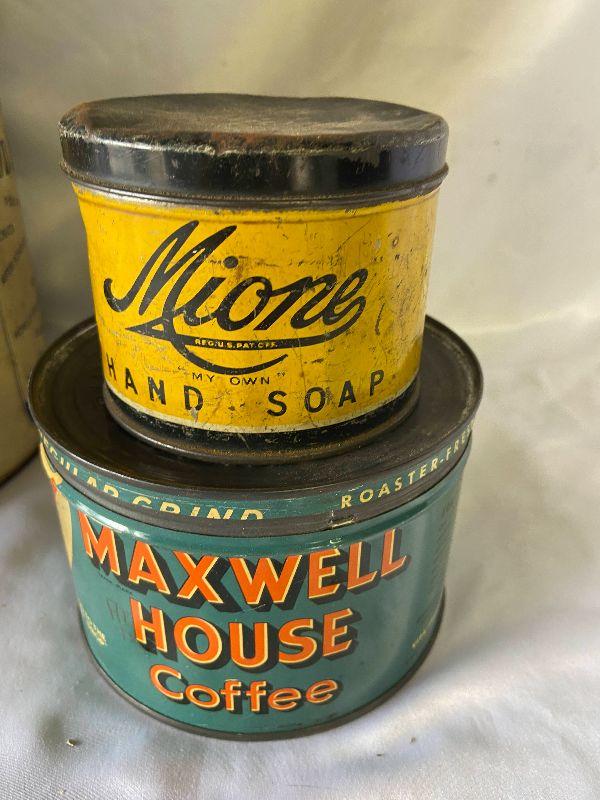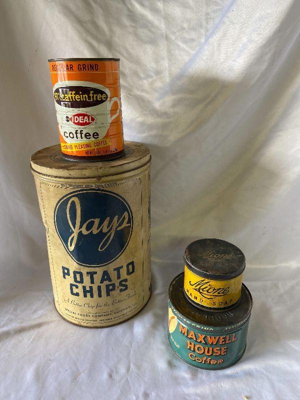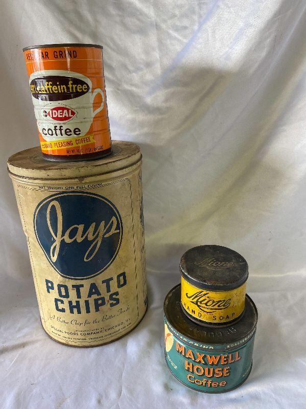 Coffee tin, chip tin and more *Please review all photos for condition and contents of lot.