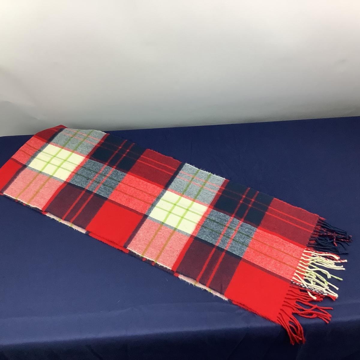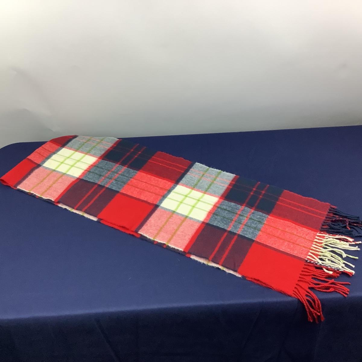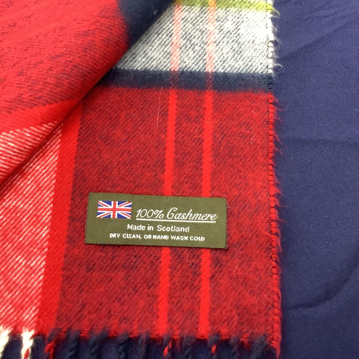 The scarf is red, white and blue, 100% cashmere, made in Great Britain.