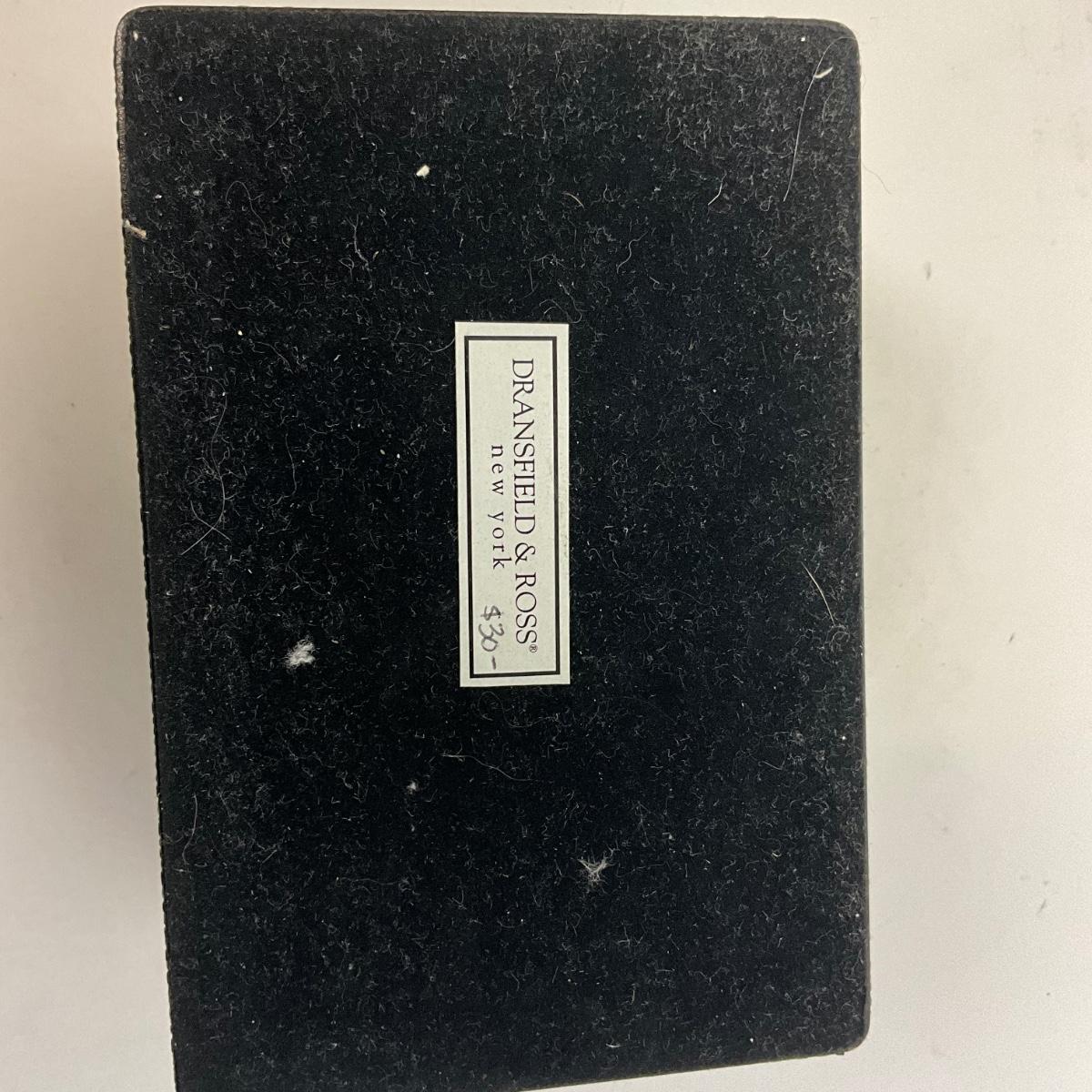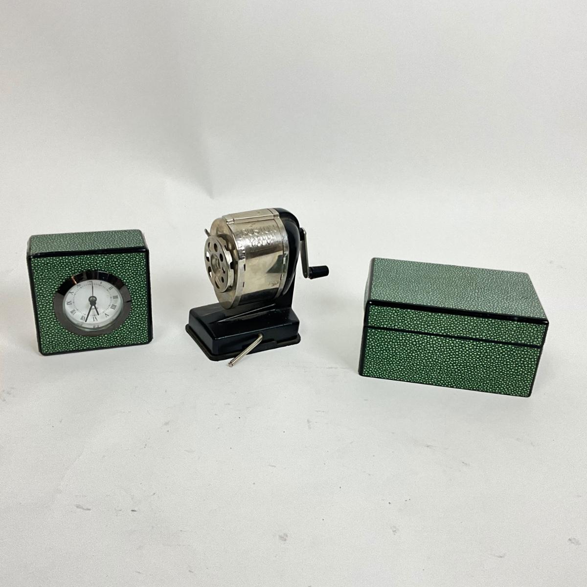 The desk set is matching by Dransfield & Ross-contains covered box that is 6" x 4" x 3", and desk clock that is 4" square and 2" deep. The pencil sharpener is by Boston and vacuum seals to any surface.