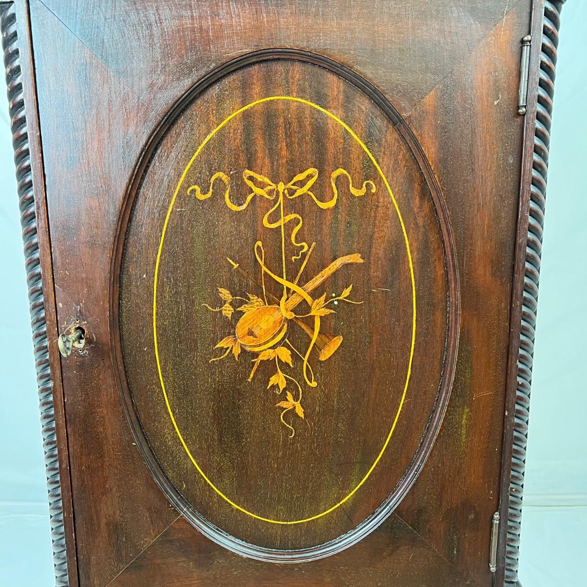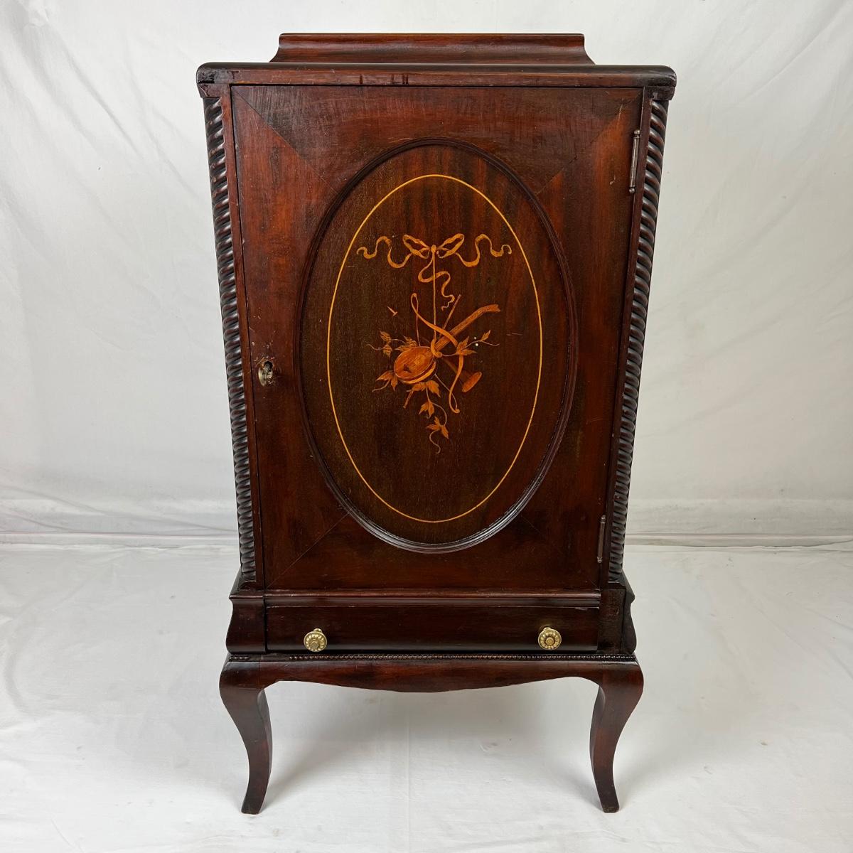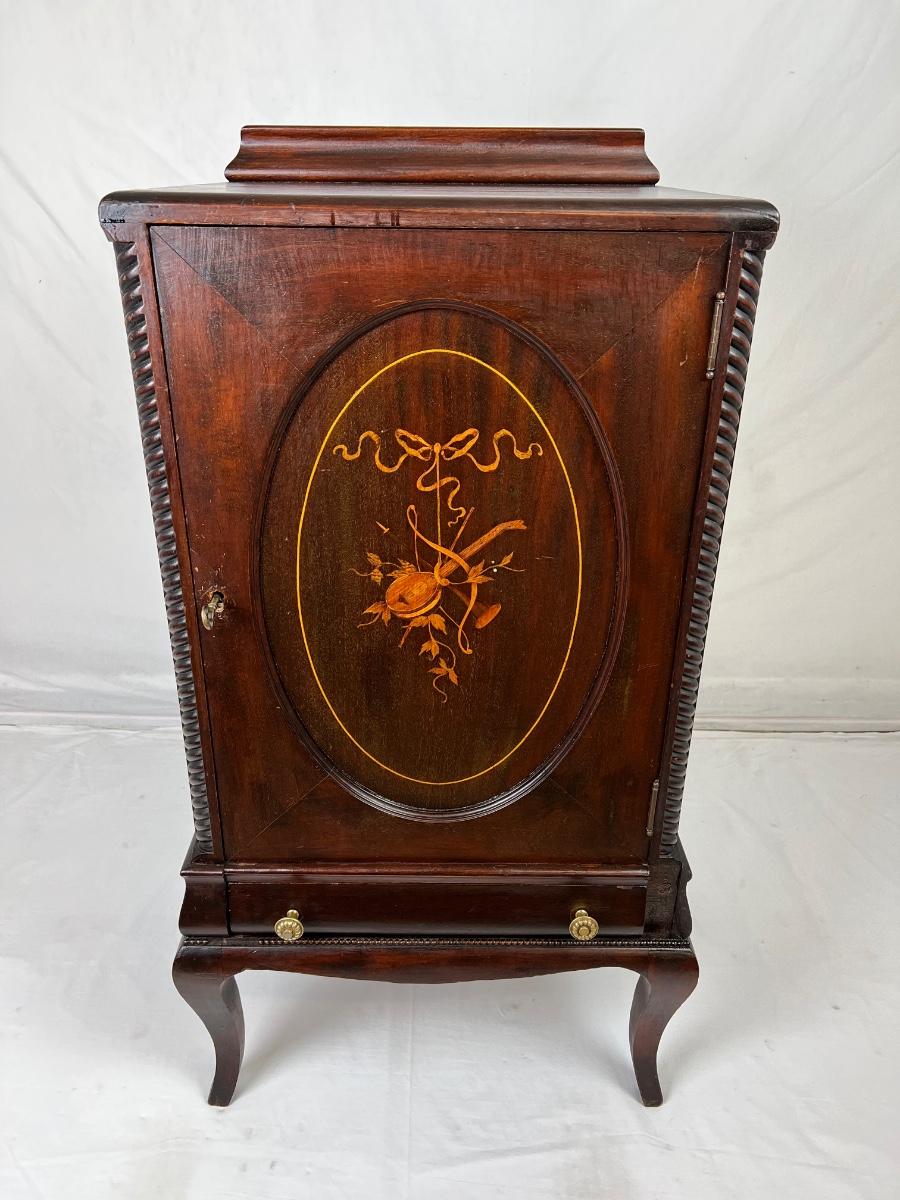 Antique Mahogany Music Cabinet w/Inlay & corner small piece missing.