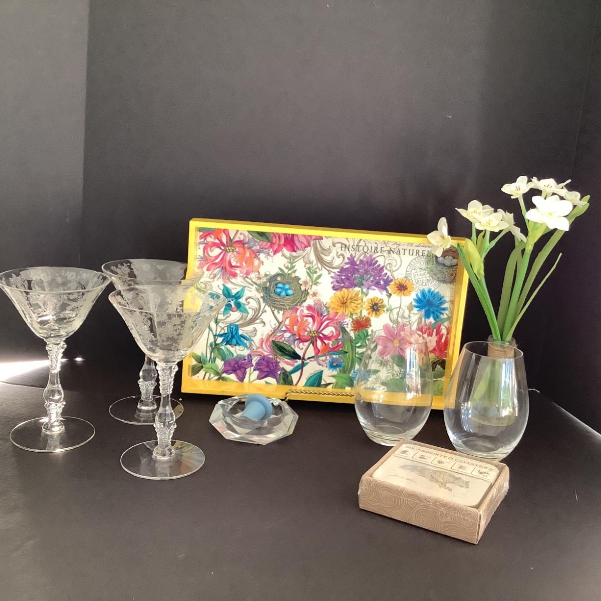 8233 Orrefors Stemless Glassware Fostoria Martini, and Michel Works Tray
