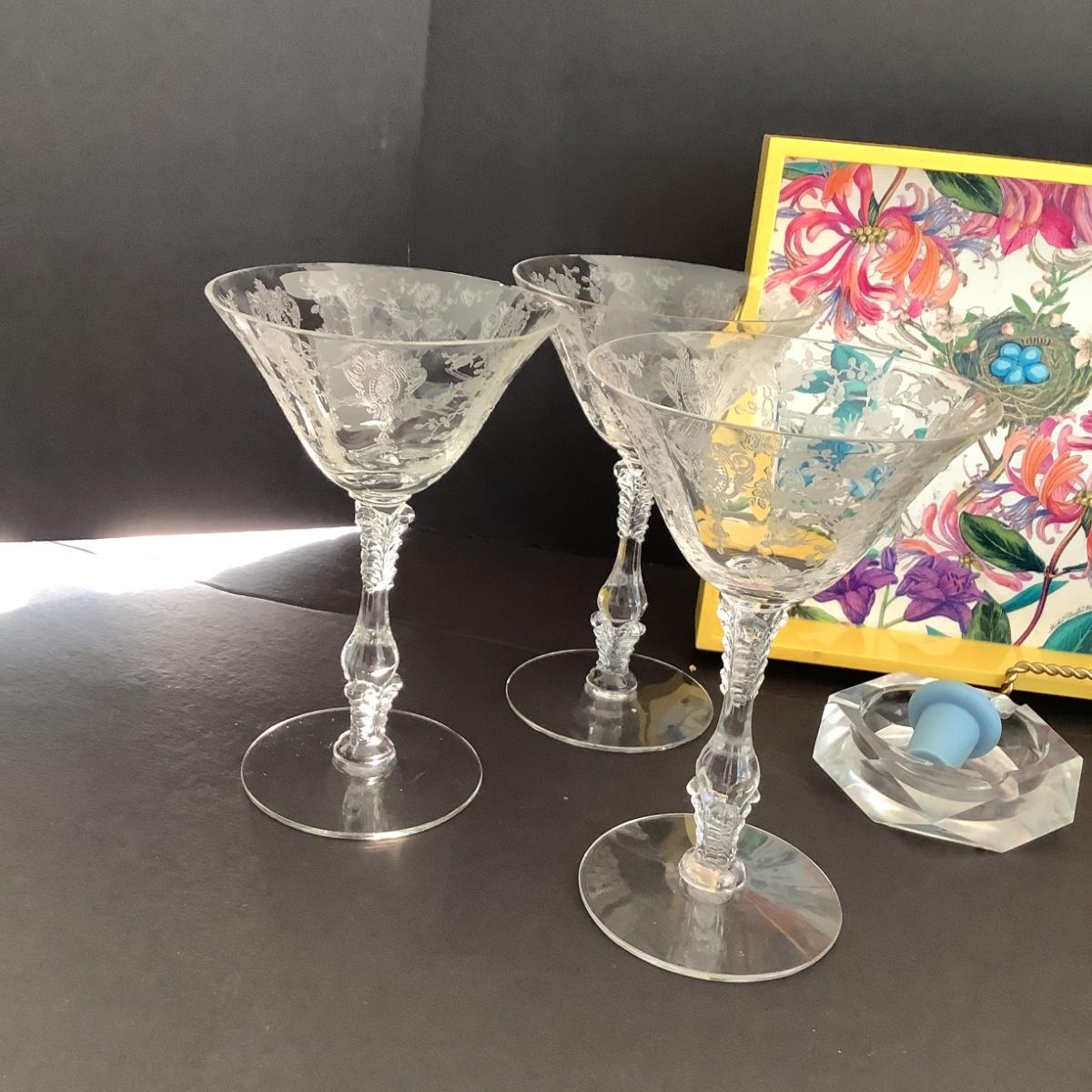 3 fostoria romance martini glasses and 2 stemless orrefors with floral trya by michel design works