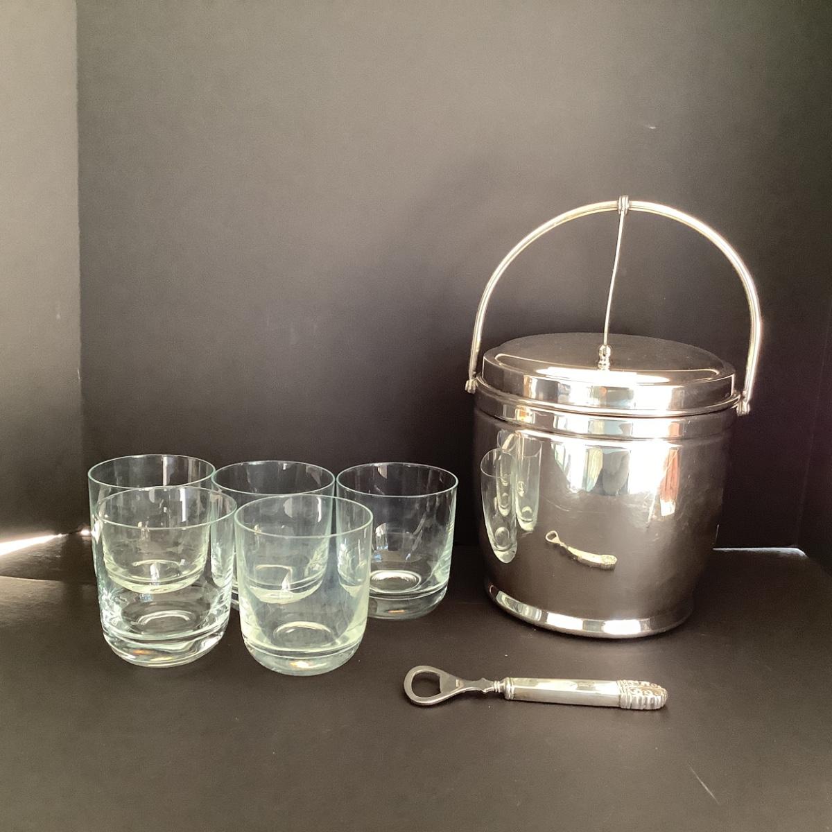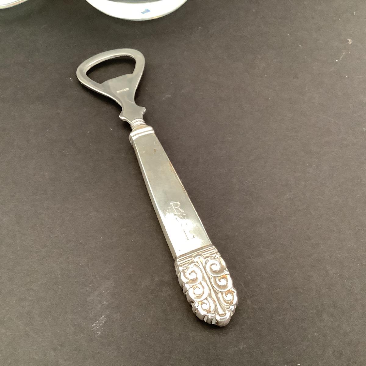 Set of 5 rocks glasses, sterling handled bottle opener ( Handle is Loose)