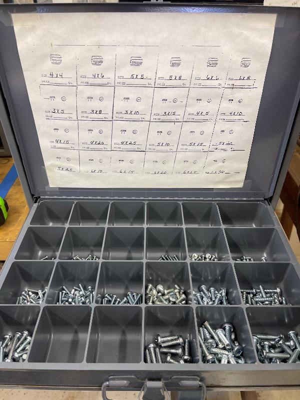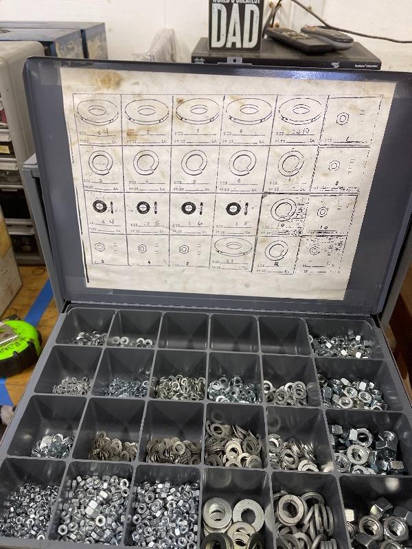 Great inventory of specialized bolts-standard & high end tension Allen blackened hardened steel bolts. All included hardware is organized and each section has sizes marked accordingly. Each drawer has a cover and is removable.