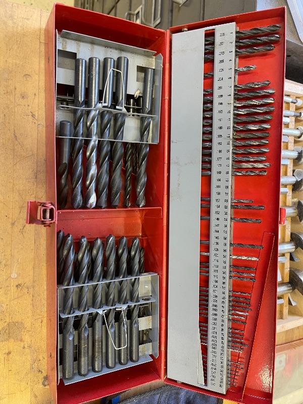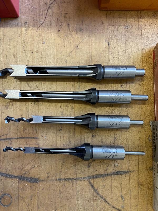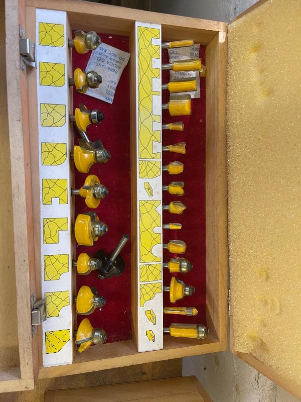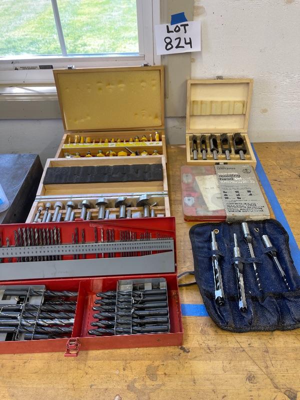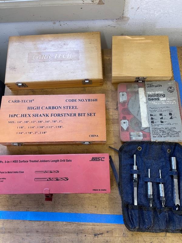 Carb Tech 24 piece router bit set, 16 piece hex shank fastener bit set, large standard drill bit set-some sizes missing, qty (2h specialized drill bit set, Craftsman triple cutter mounding head set-7” cutting diameter