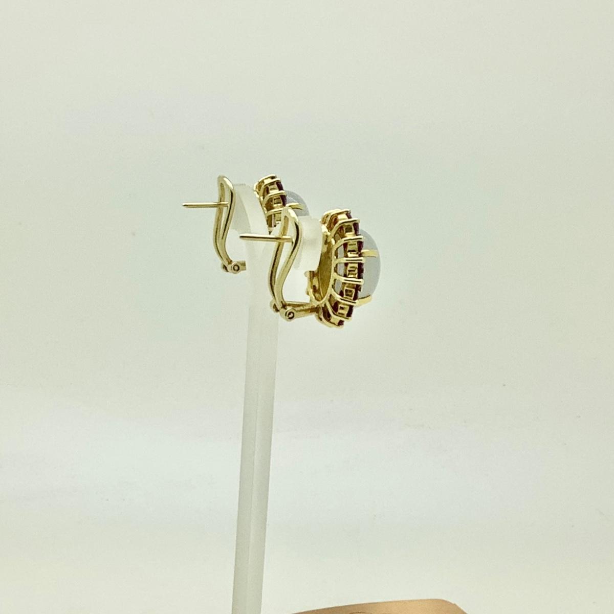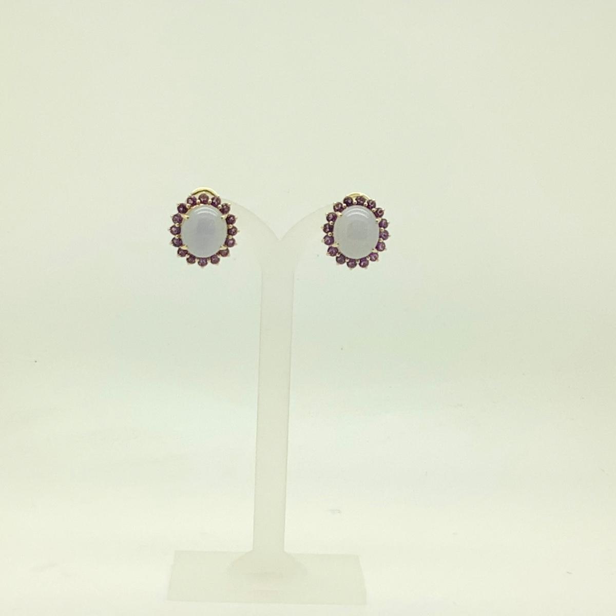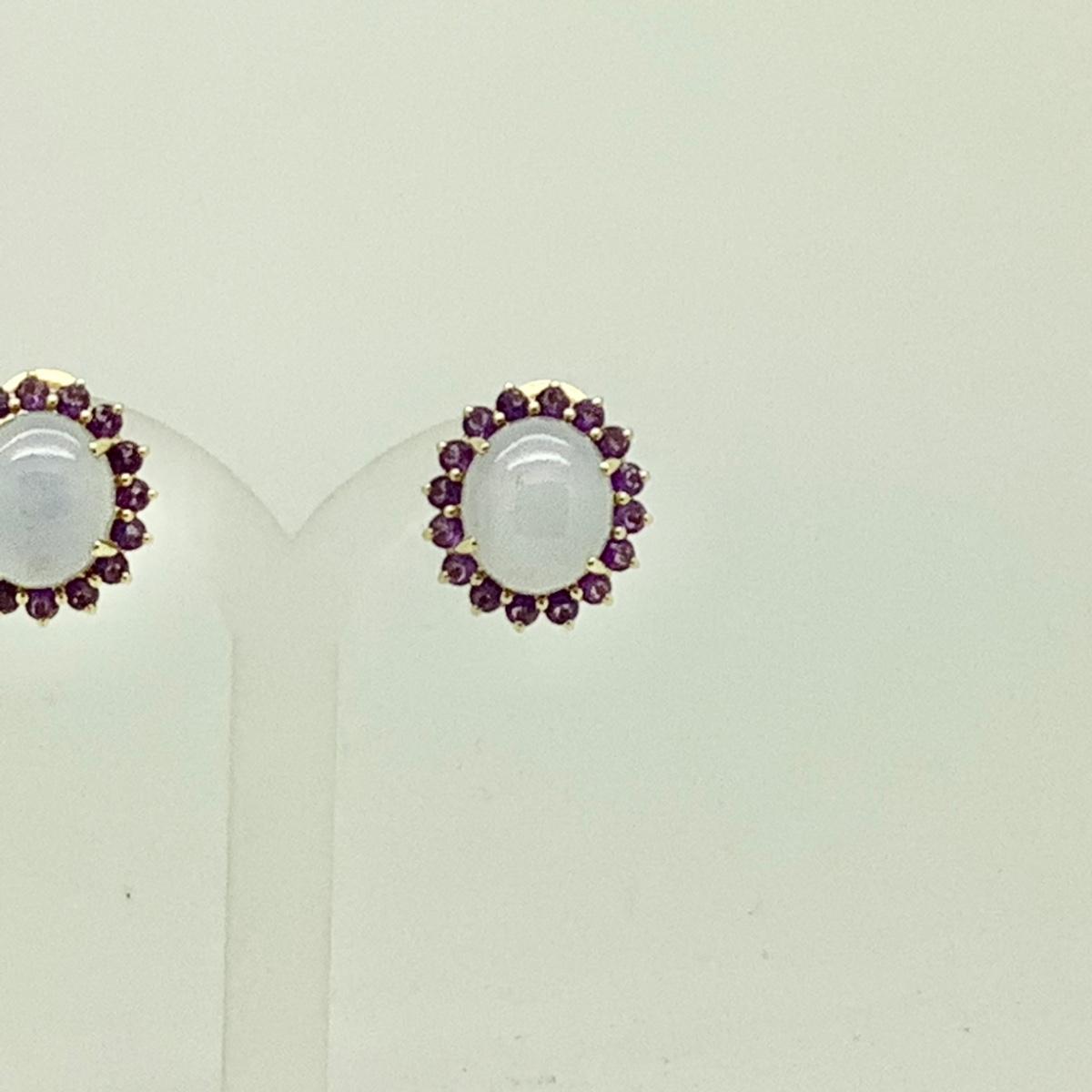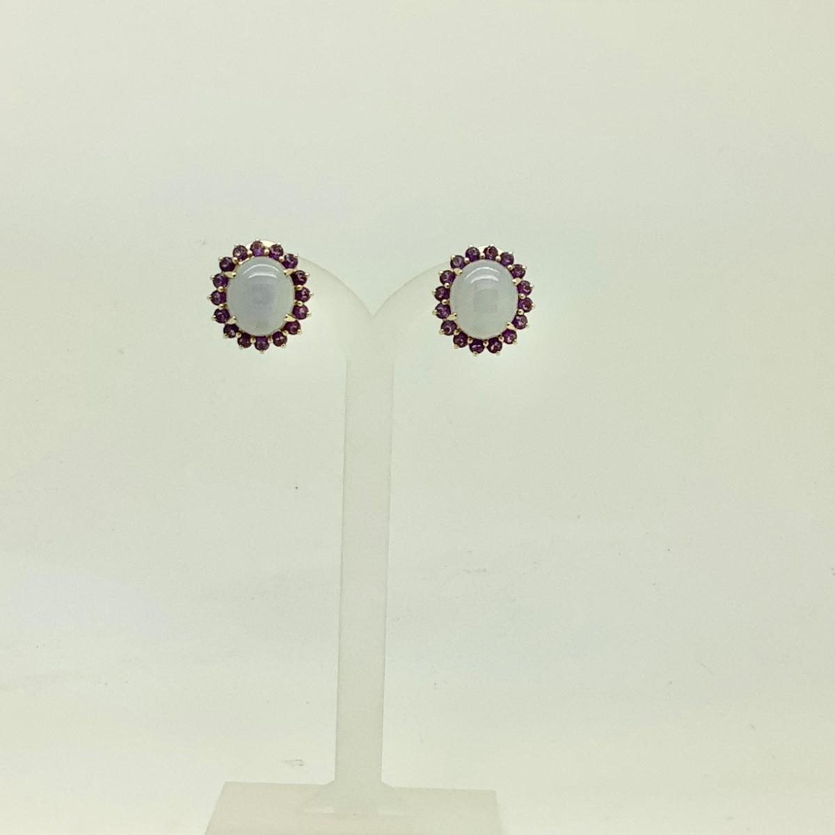 14k yellow gold post/lever earrings with 2 oval purple jades and 32 round amethysts, 3/4" long x 5/8" wide, weighing 13gr.