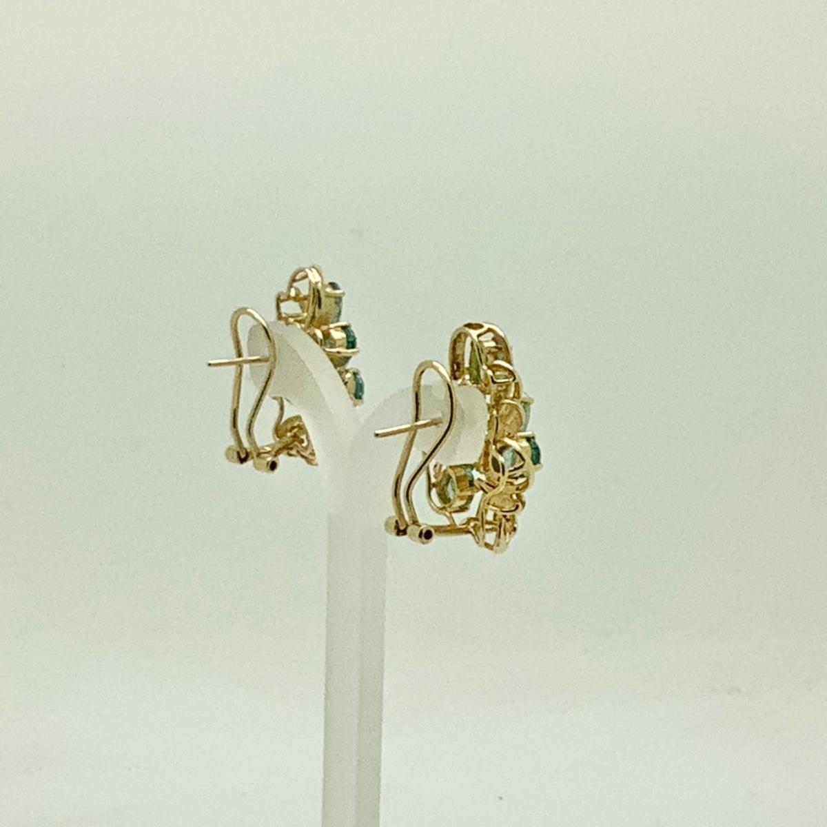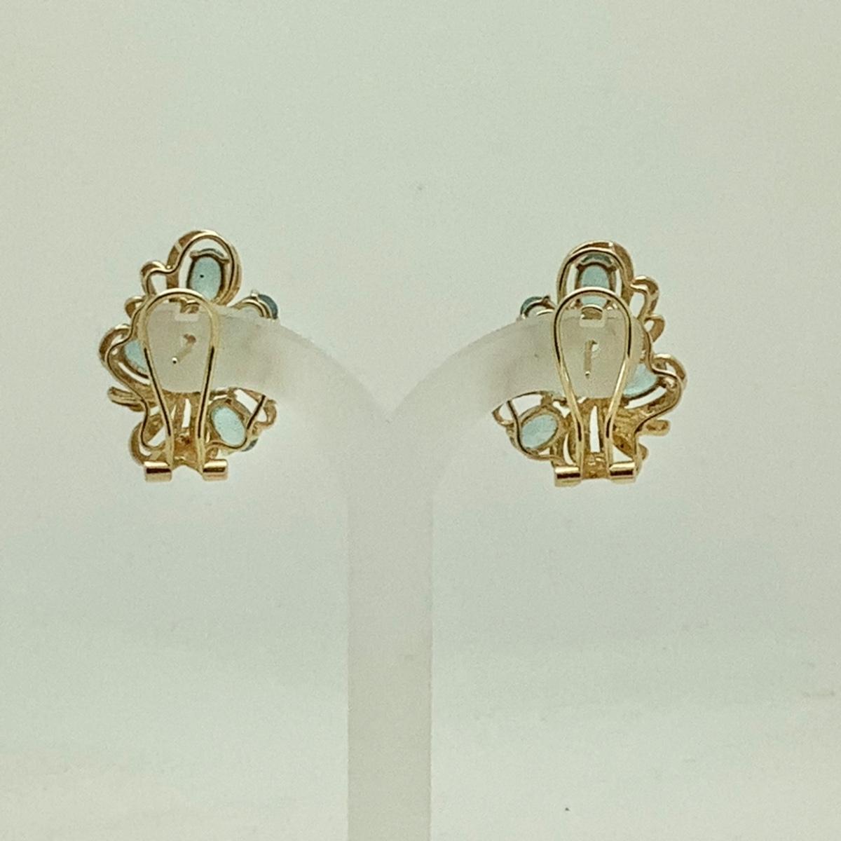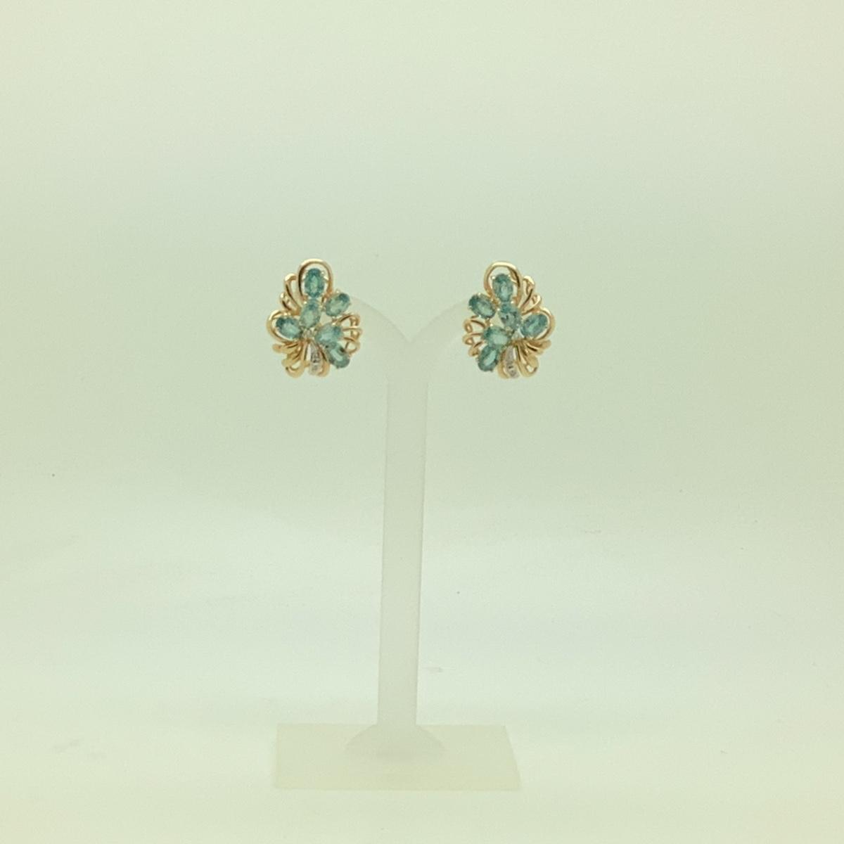 14k yellow gold floral cluster earrings with 12 oval blue topaz and 6 small round diamonds, post/lever backs, measuring approx 1" long, 3/4" wide, weighing 8.8gr.