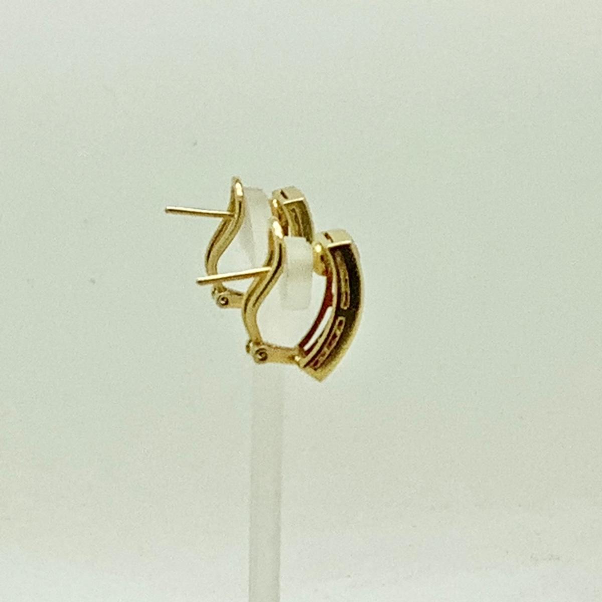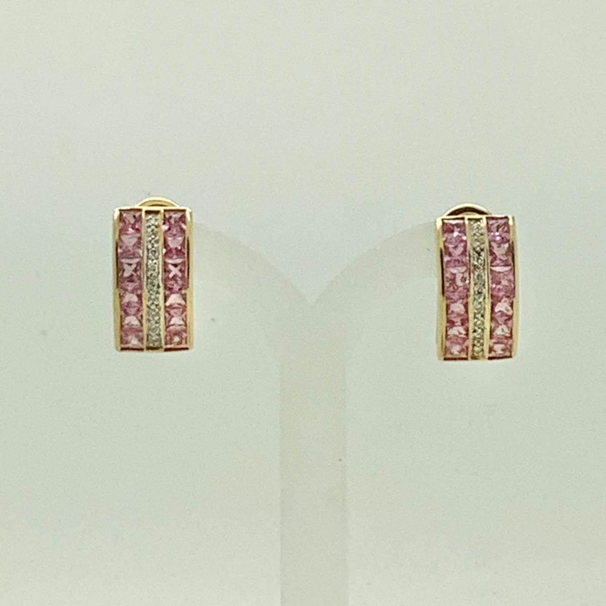18k yellow gold band hoop earrings with 24 square cut pink sapphires and 18 small round diamonds, post/lever backs, 11/16" long x 3/8" wide, weighing 10.5gr.