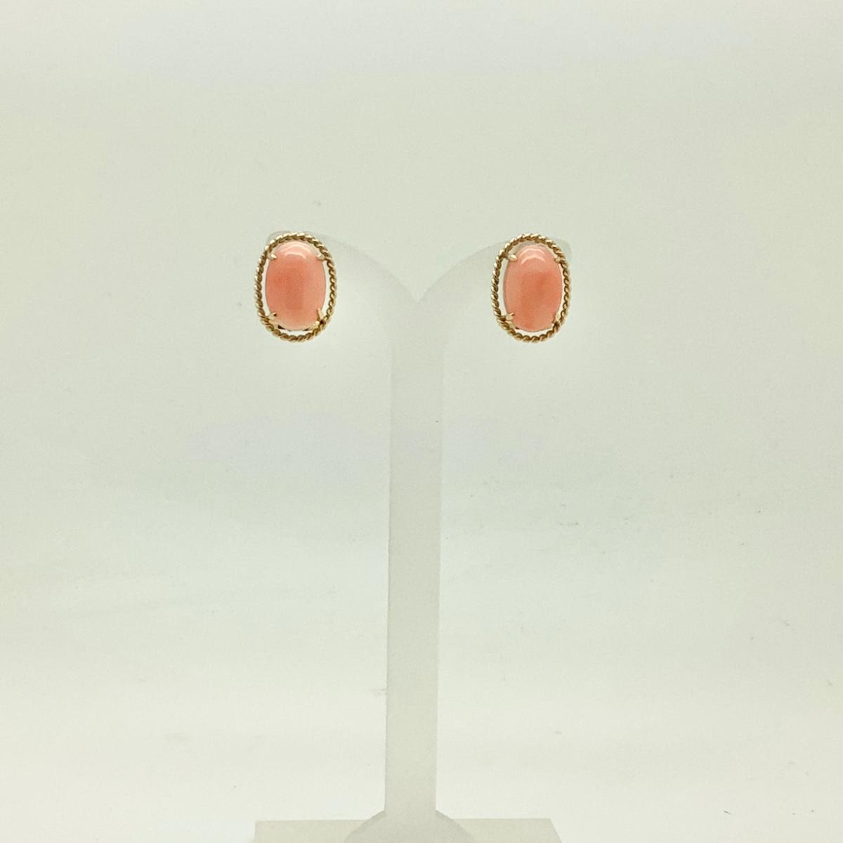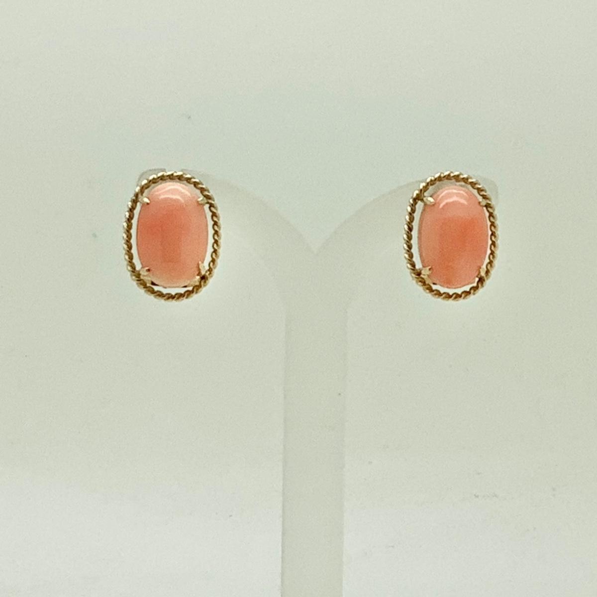 14k yellow gold clip-on earrings with 2 prong set oval coral stones, twist rope frame, approx 5/8" long x 1/2" wide, weighing 5.1gr.