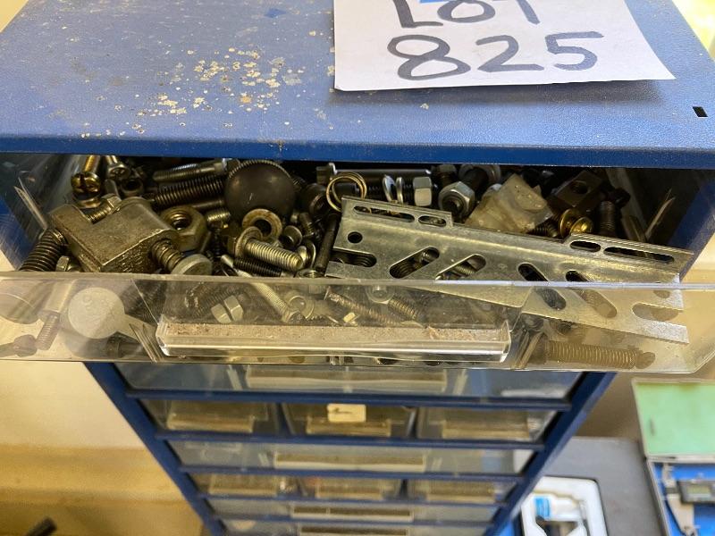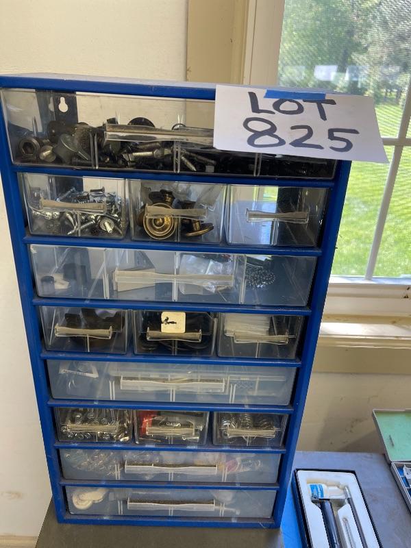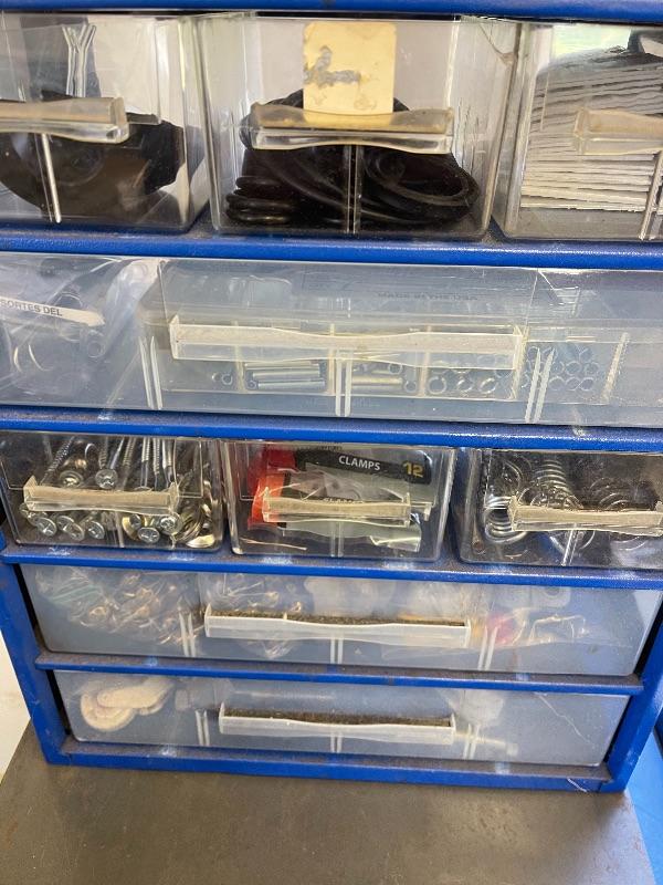 14 drawer hardware storage stocked with hardware, screws, springs, etc...see pics. 22”H x 12”W x 6”D