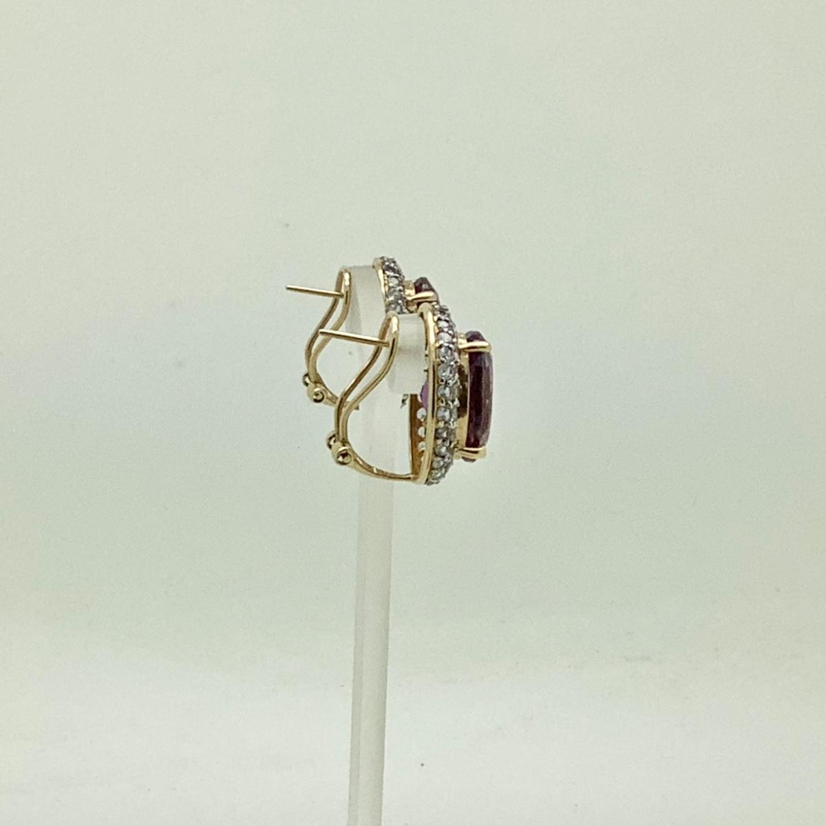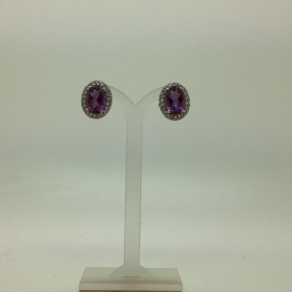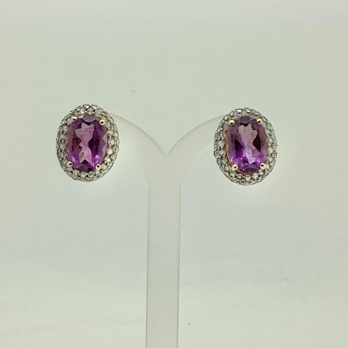 14k yellow gold post/lever back earrings with 2 oval amethysts weighing approx 12ct total, surrounded by 2 rows of small round tanzanites, approx 3/4" long x 5/8" wide, weighing 7.9gr.
