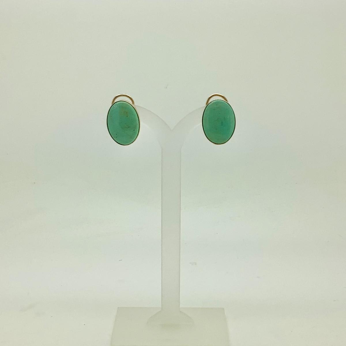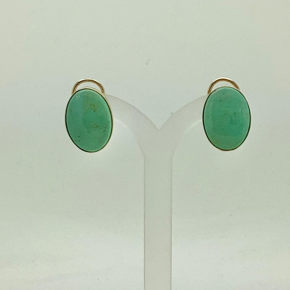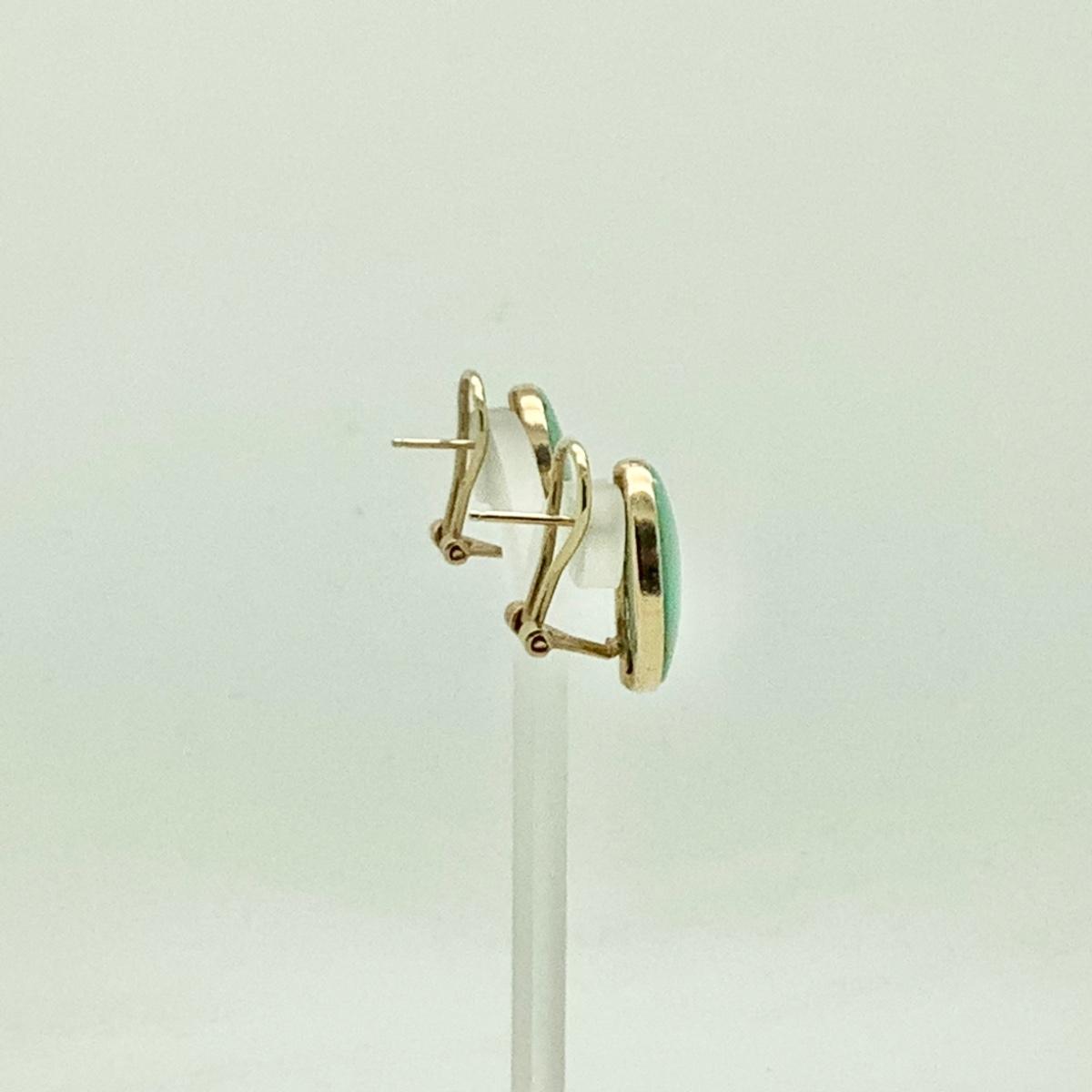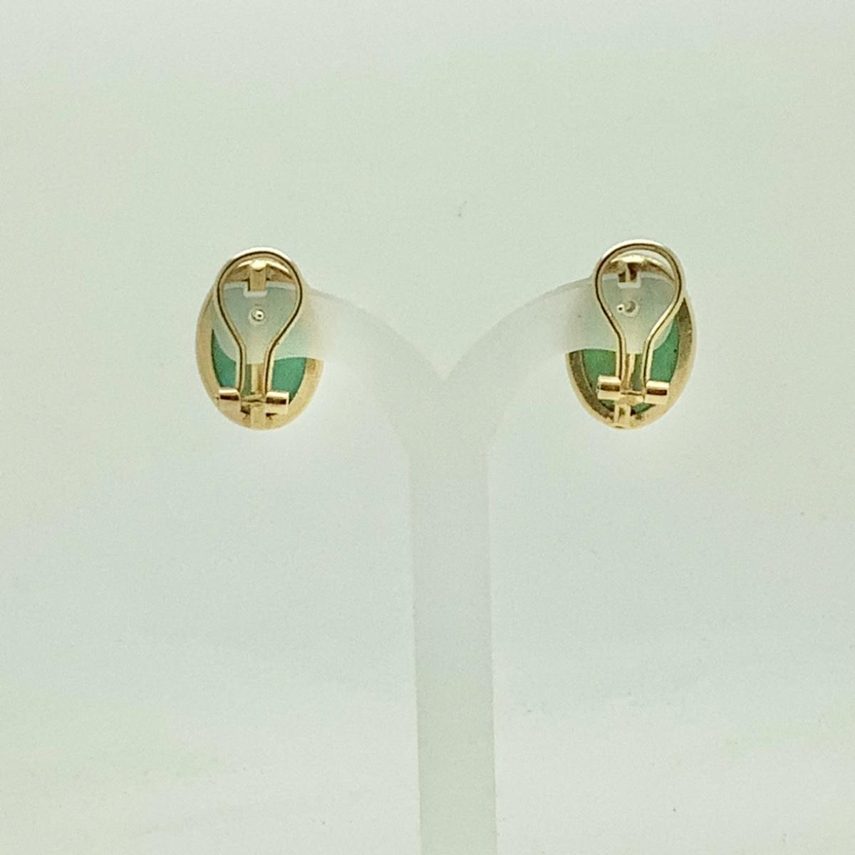 14k yellow gold post/lever back earrings with 2 bezel set oval jades. Measuring 3/4" long x 1/2" wide, weighing 4.9gr.