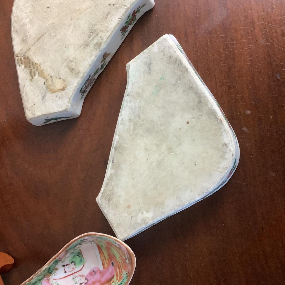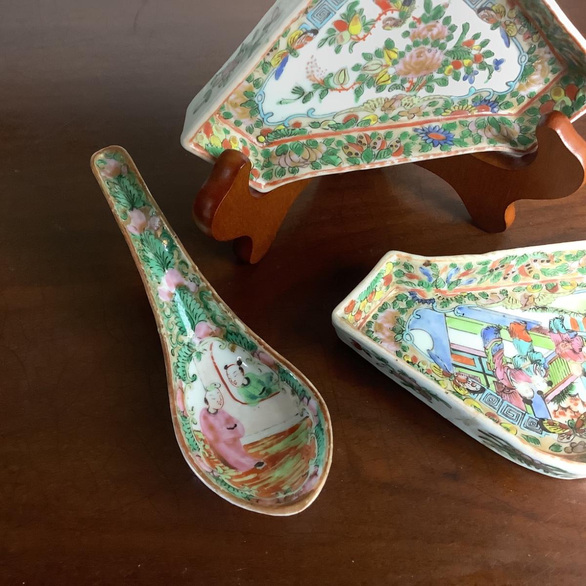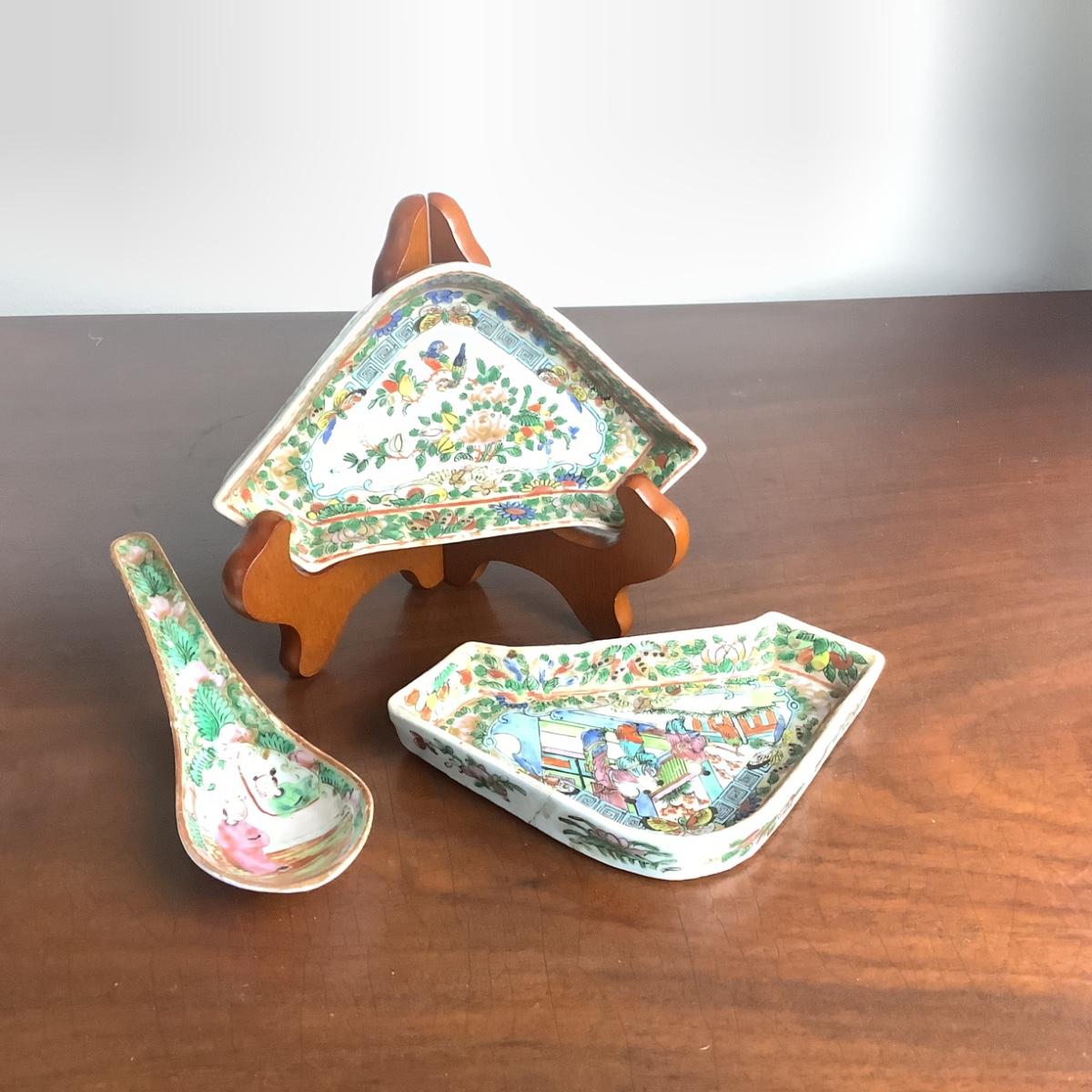 One plate has a crack and has been repaired. Both dishes measure 6" wide x 3.5" high. The spoon measures 6"