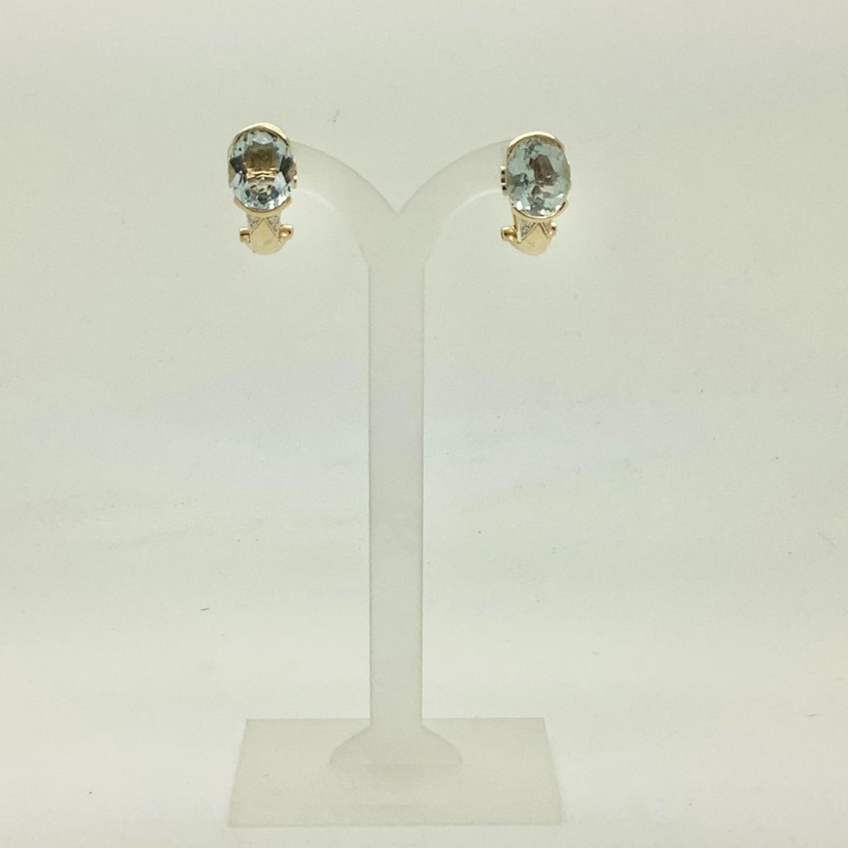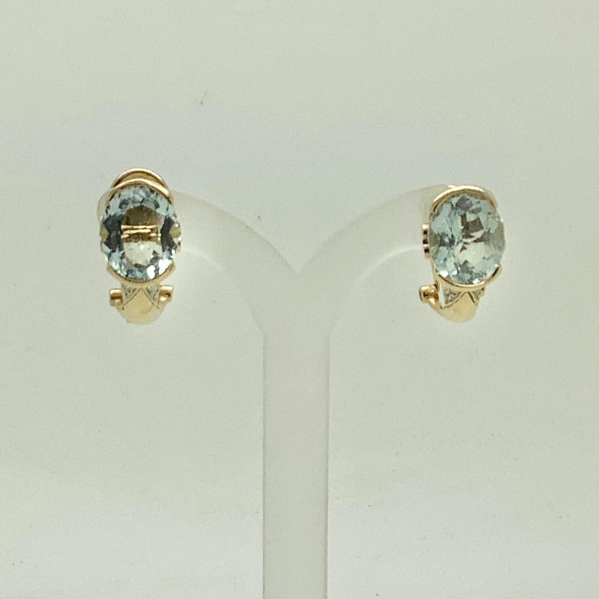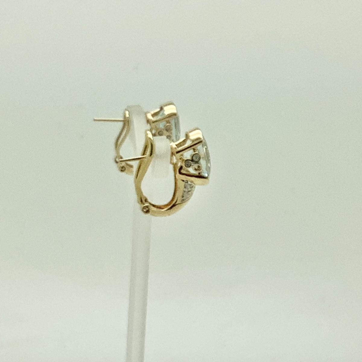 14k yellow gold post/lever back earrings with 2 bezel set oval aquamarines (approx 5-6ct total weight) and 24 round diamonds (approx .50ct total) prong and bezel set. Measuring approx 3/4" long x 7/16" wide, weighing 6.5gr.