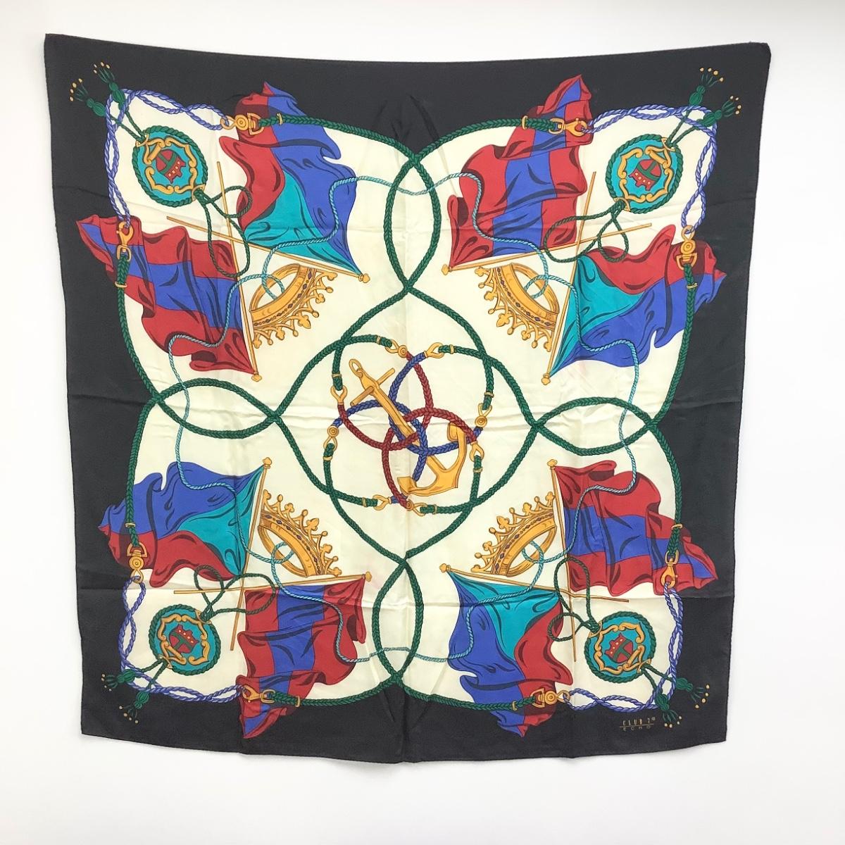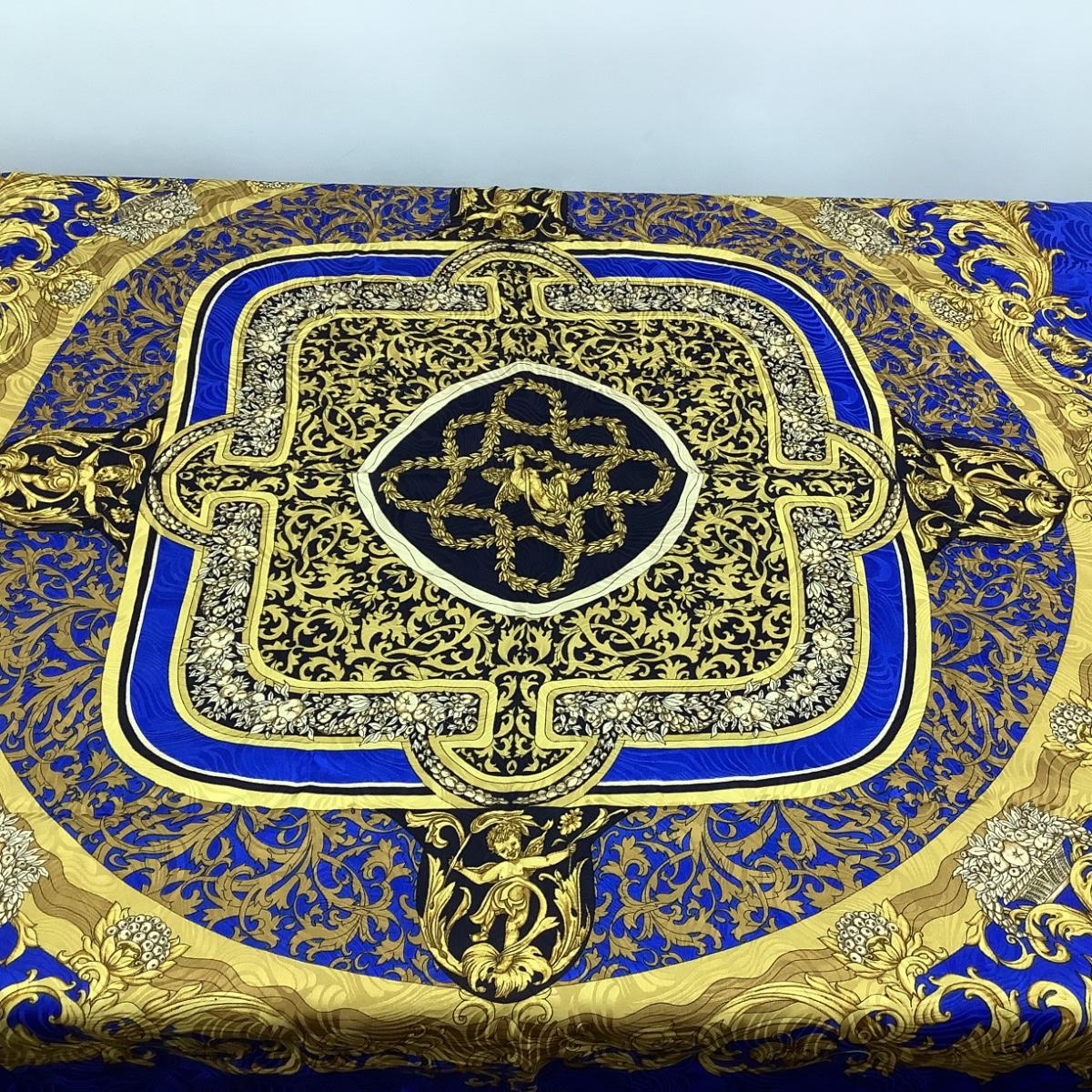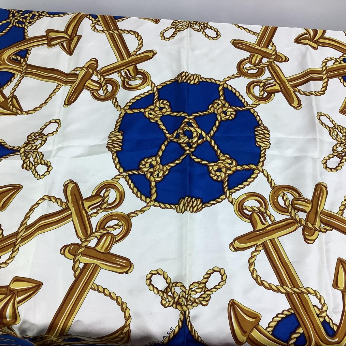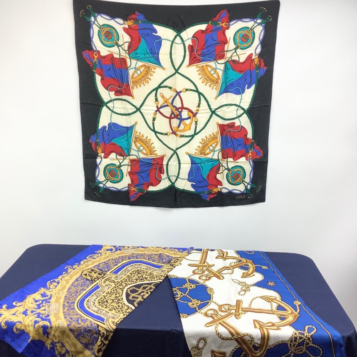 There are 3 scarves in this lot, Echo golden anchors, Casca with flags and crowns, Blue and gold baroque style. They all measure 34" square.