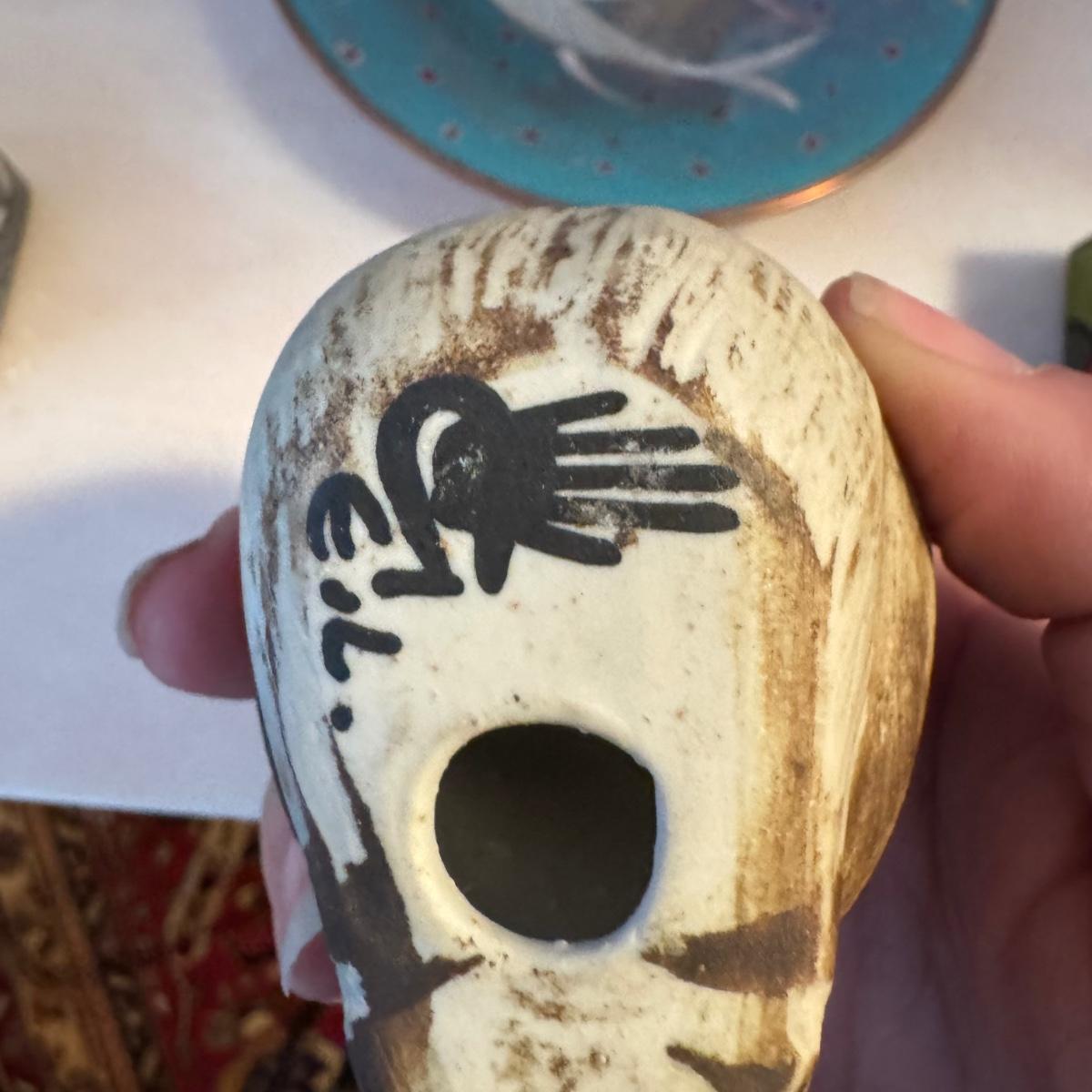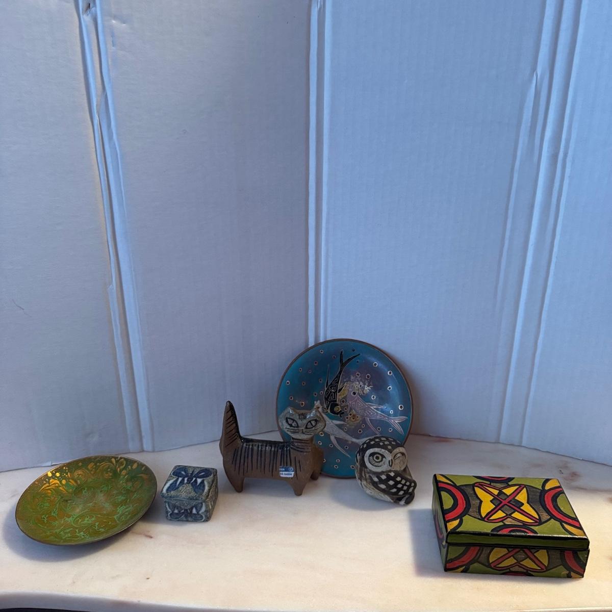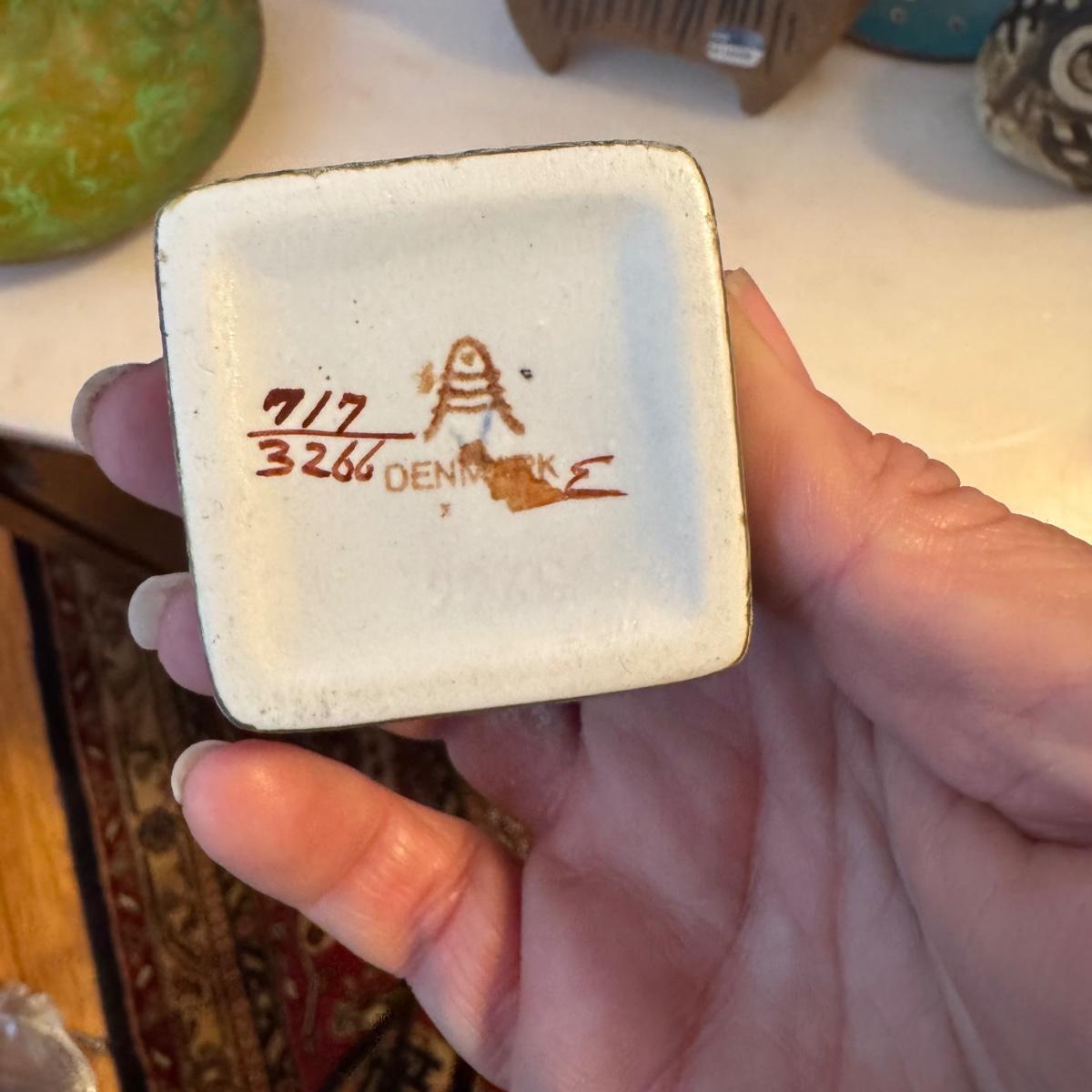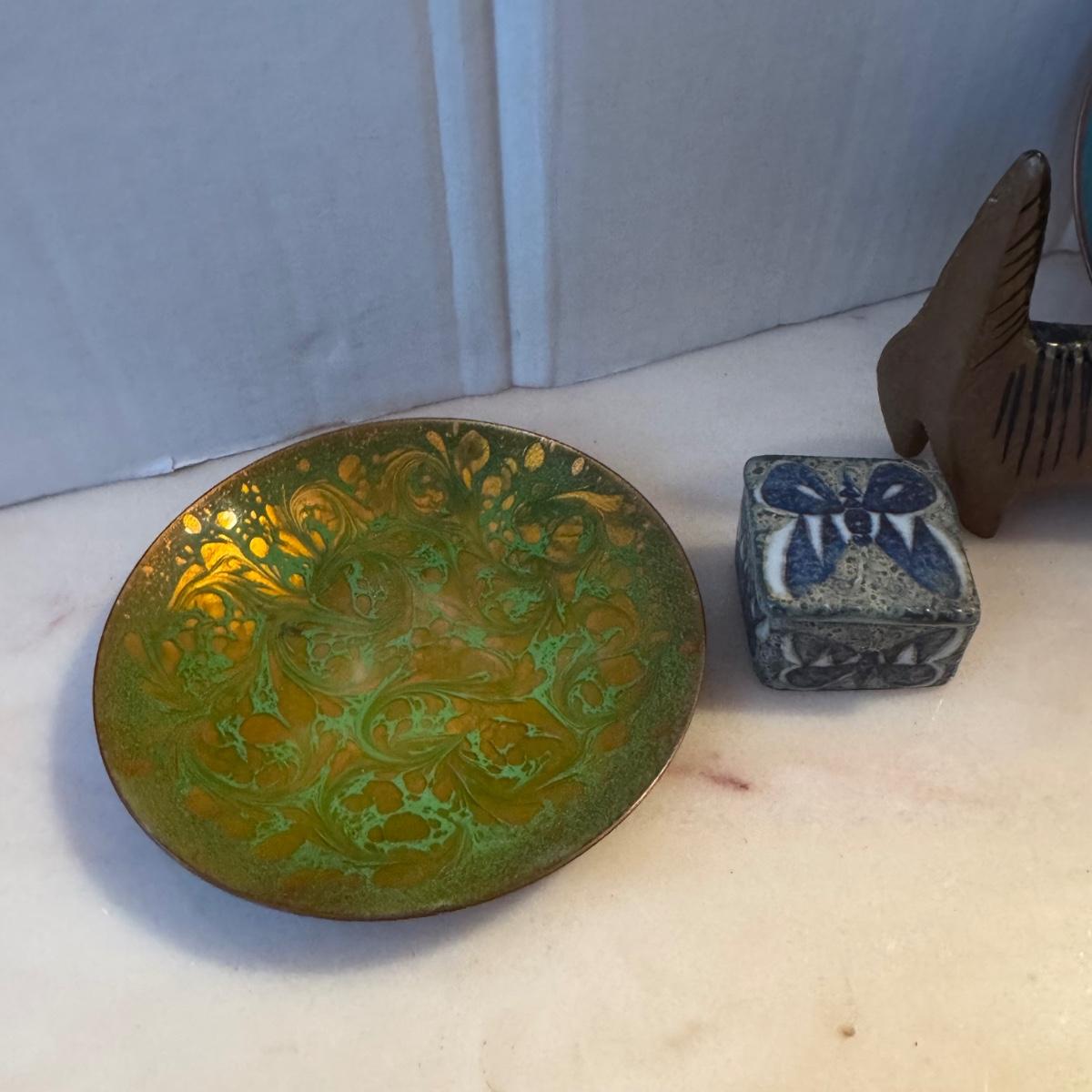 Covered Copenhagen box , owl is Ewald Lindahl, Godfrey signed enamel plate measuring 5” diameter