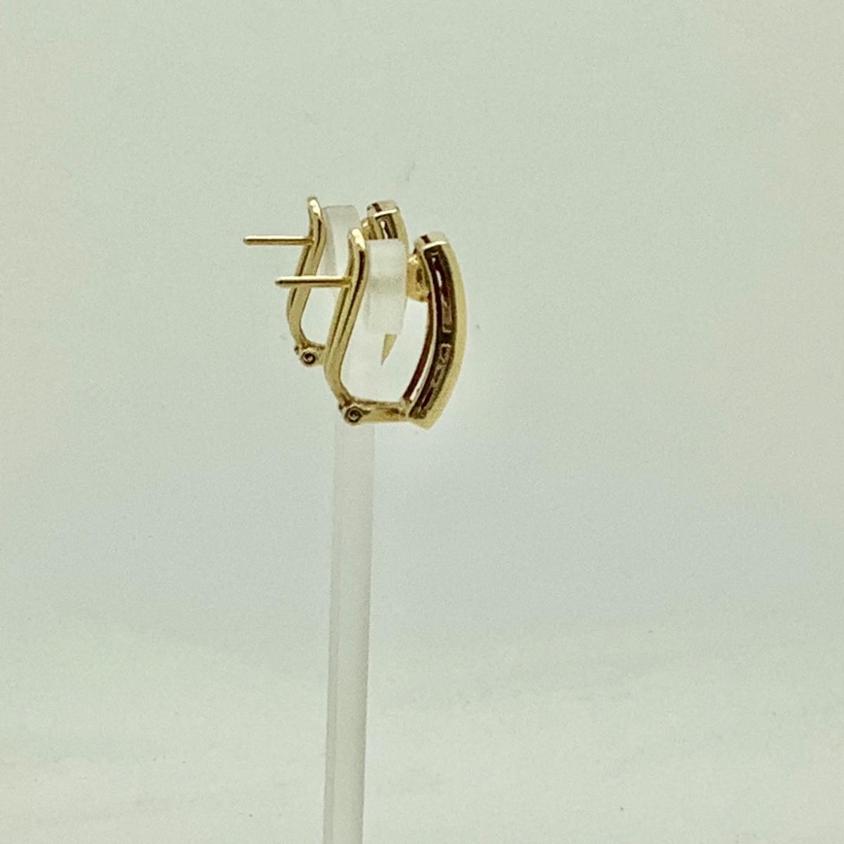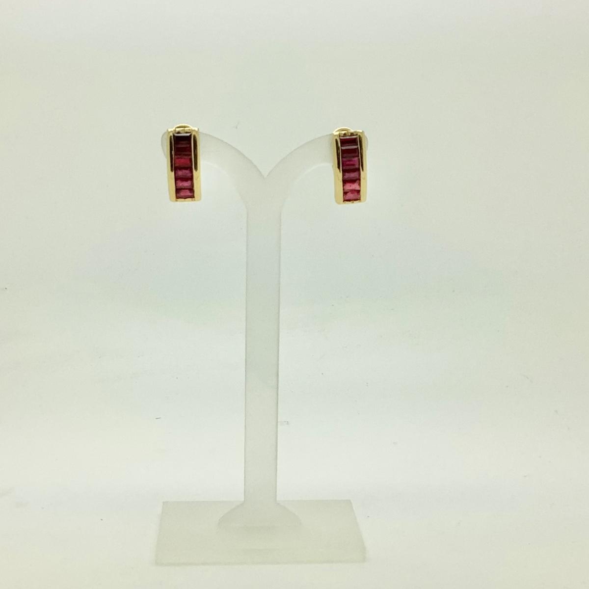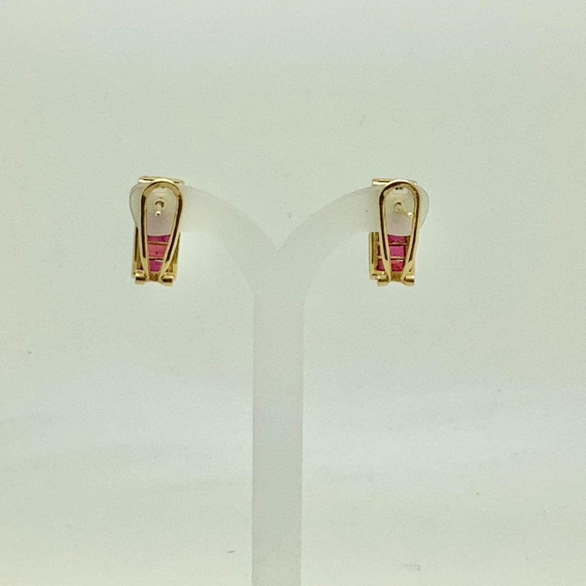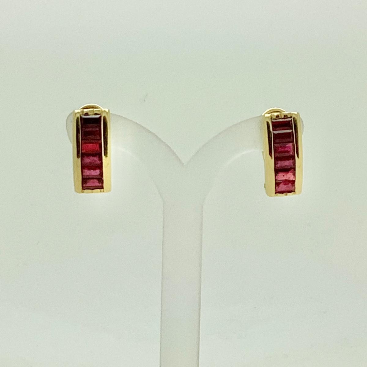 18k yellow gold band hoop earrings with collapsable post and lever backs. There are 12 channel set rectangular rubies weighing approx 2ct total. Measuring approx 5/8" long x 1/4" wide, weighing 7.7gr.