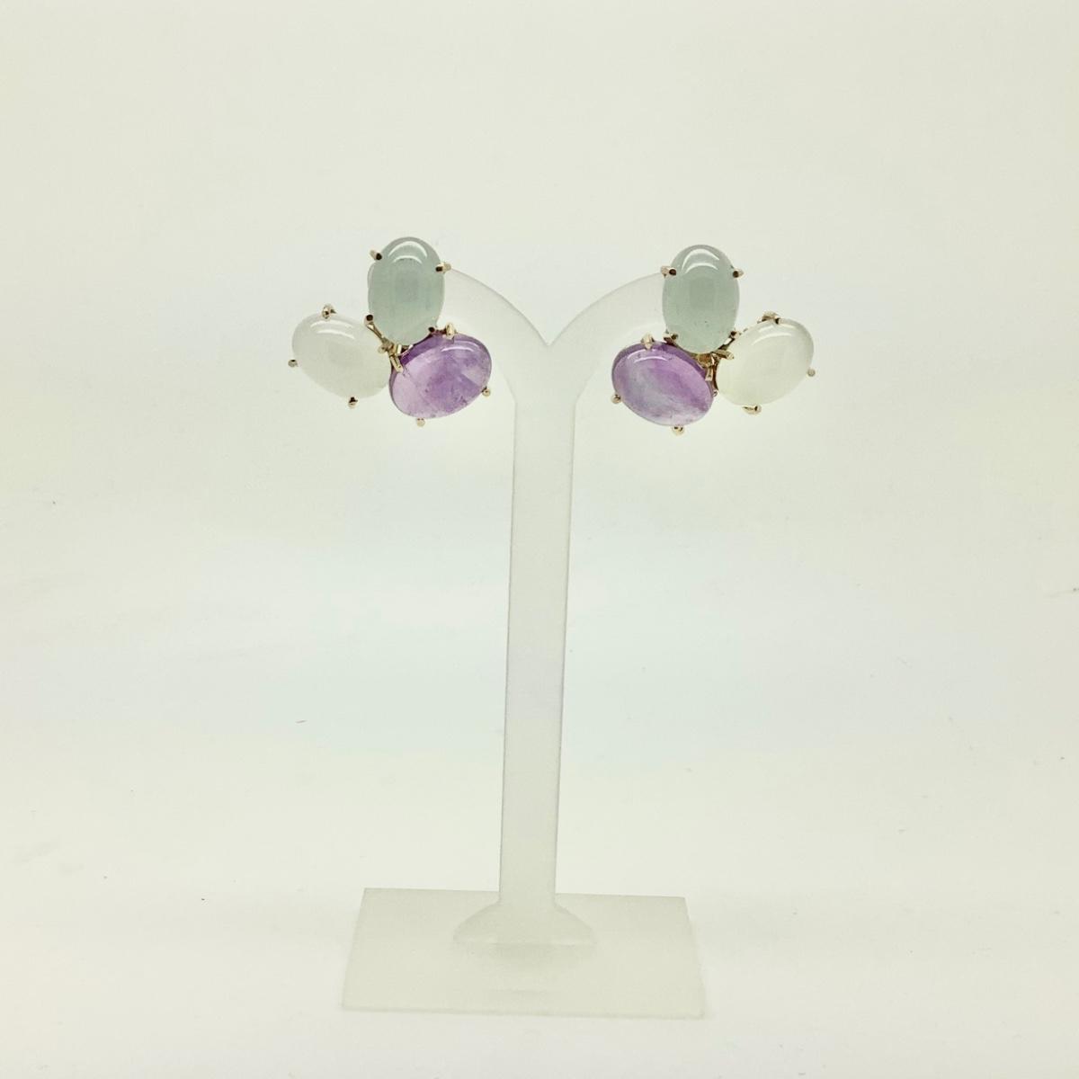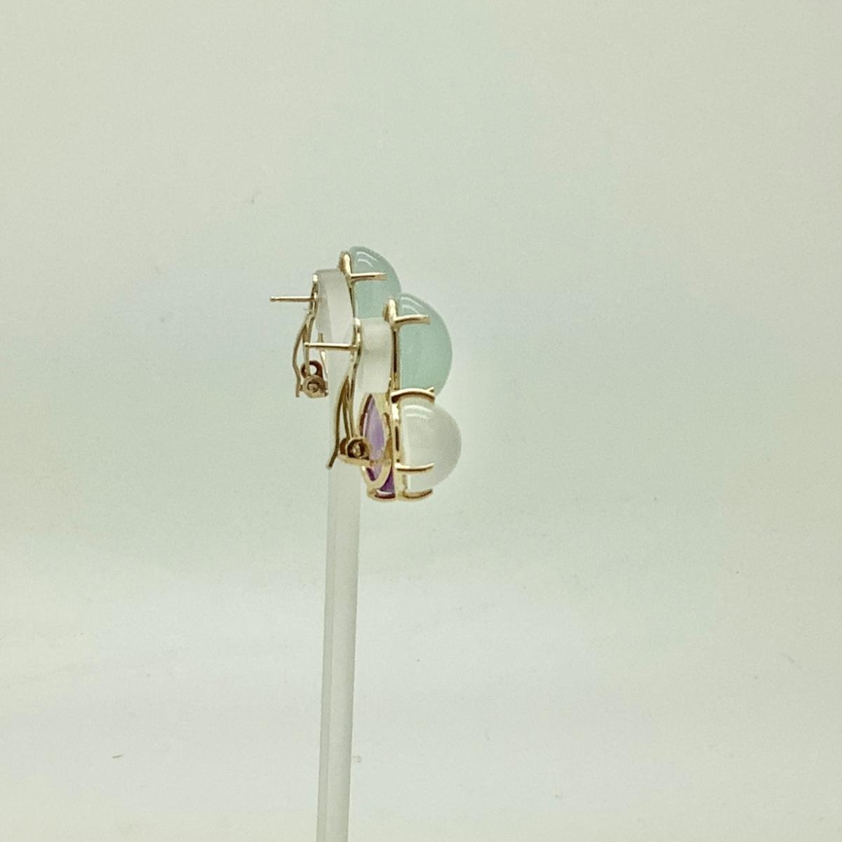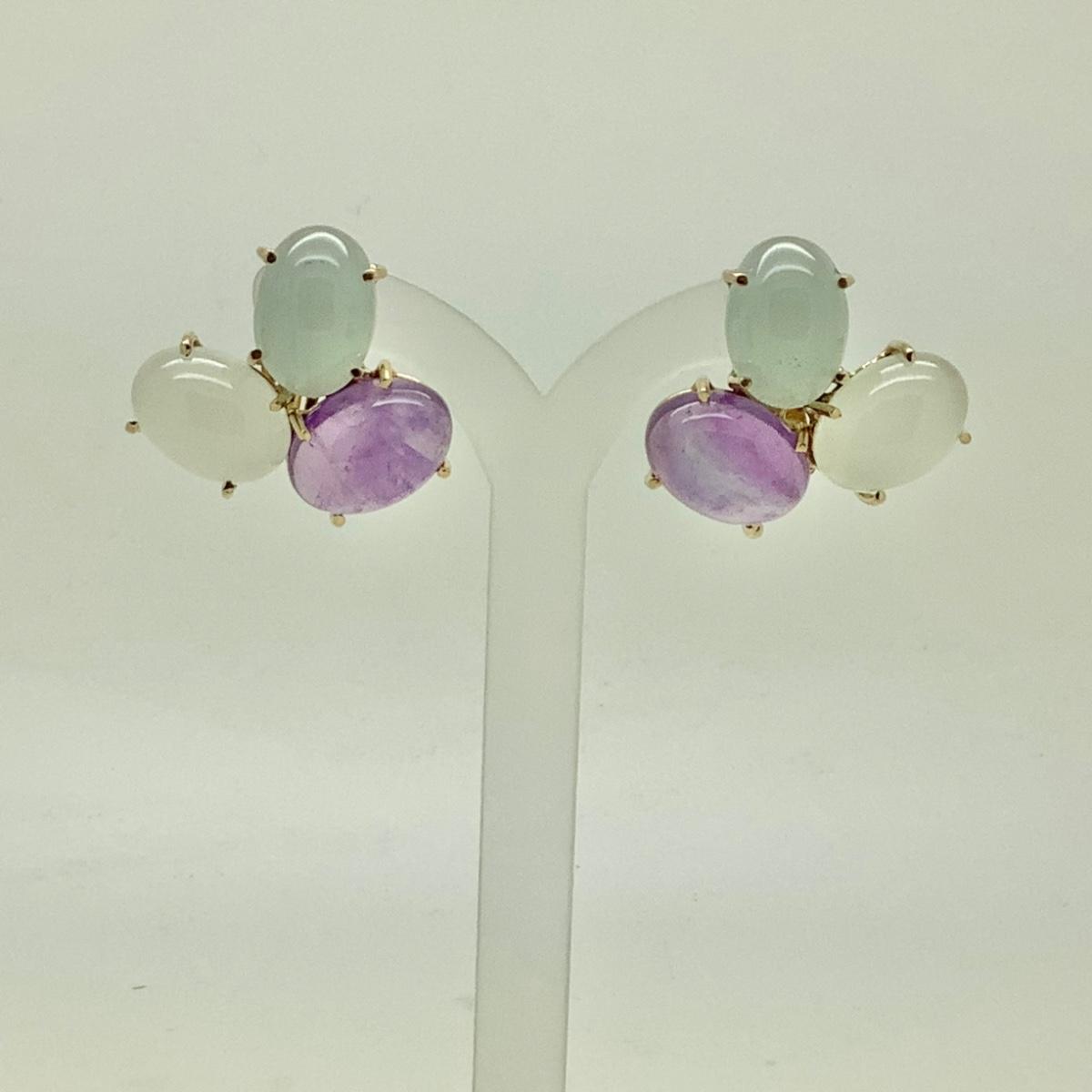 14k yellow gold post/lever back cluster earrings with purple, green and white cabachon jade stones, prong set. Measuring approx 1" diameter, weighing 13.3gr.