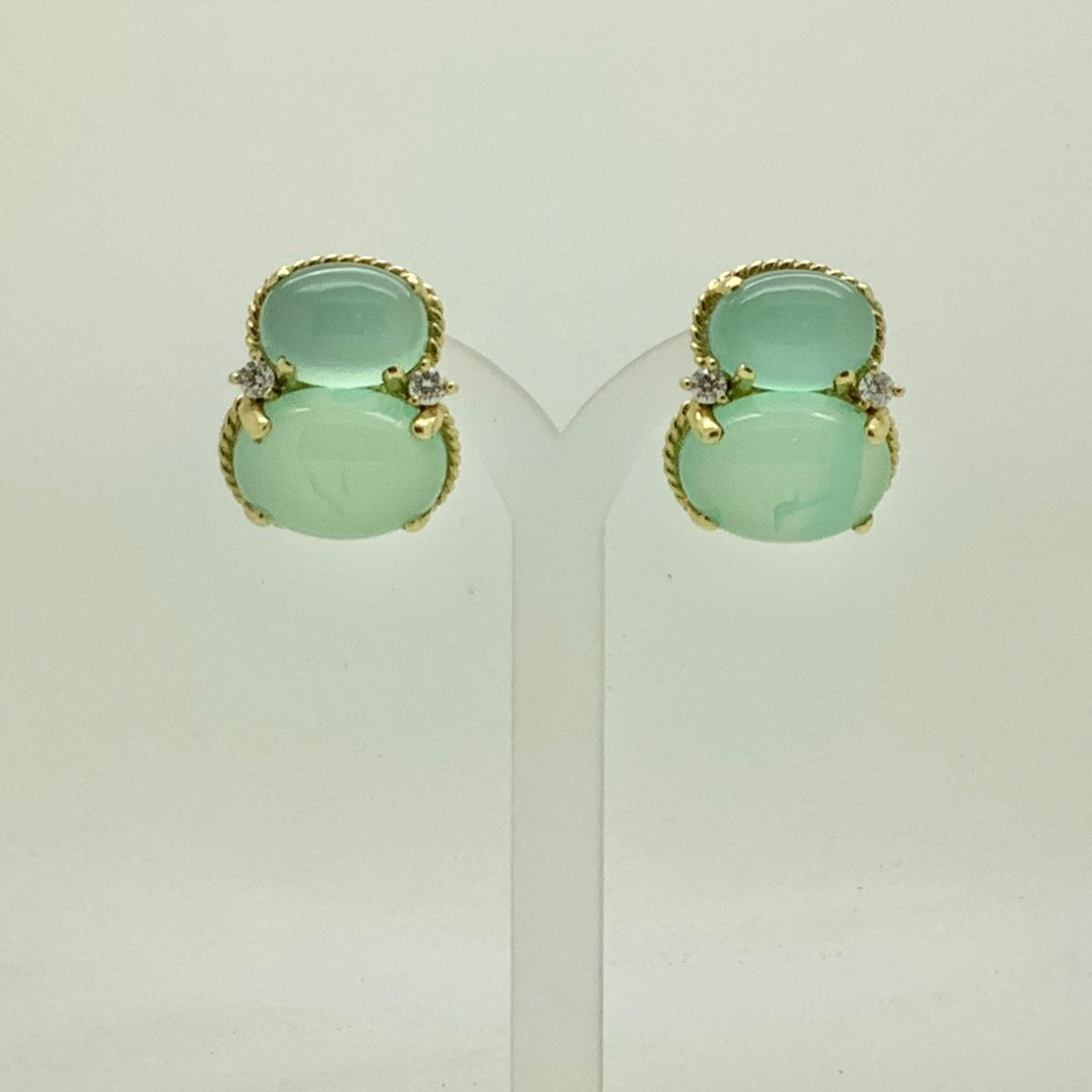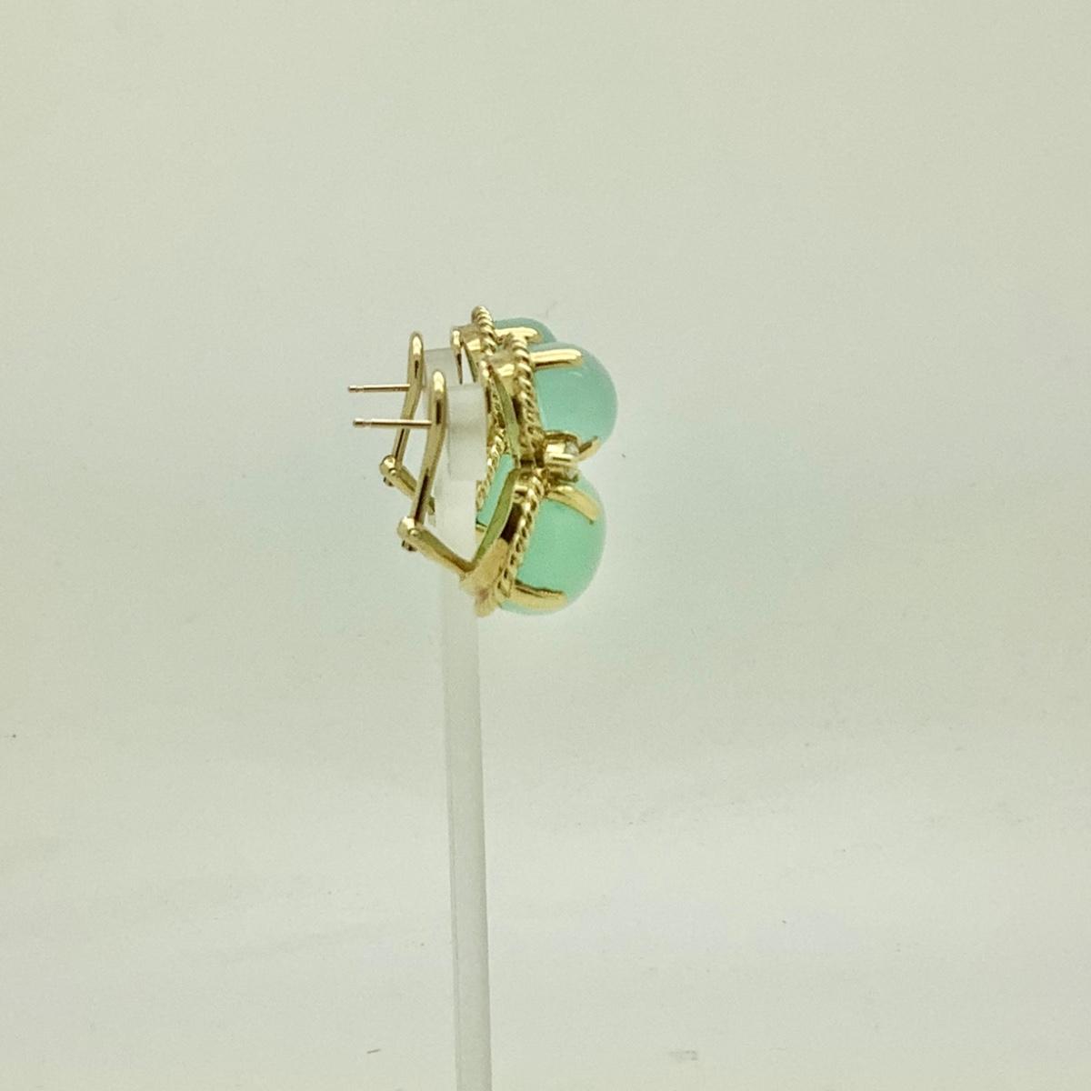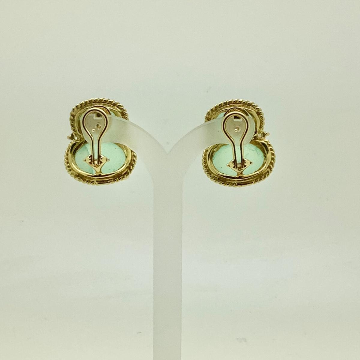 18k yellow gold post/ lever back earrings with 4 oval cabachon jade and 4 round diamonds (approx .50ct total weight), all prong set. The earrings measure approx 1" long x 3/4" wide, weighing 25gr.