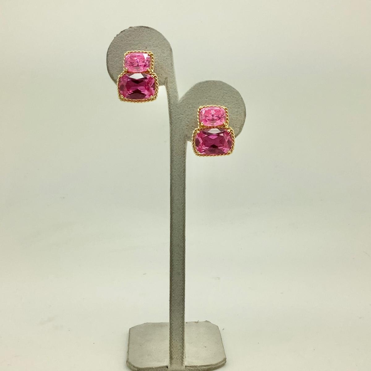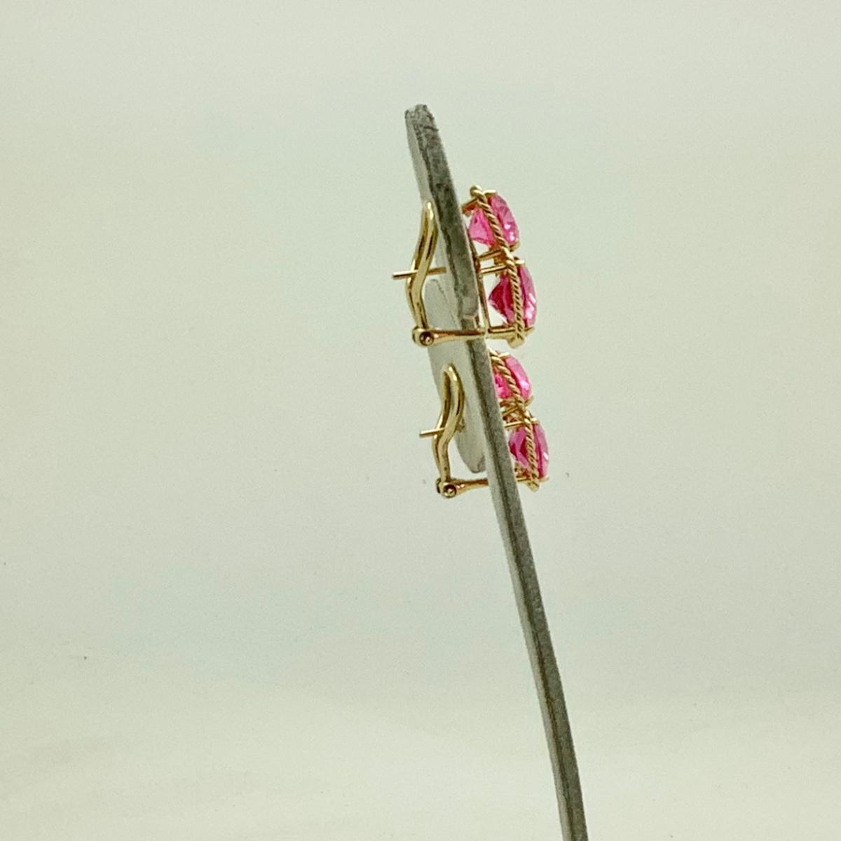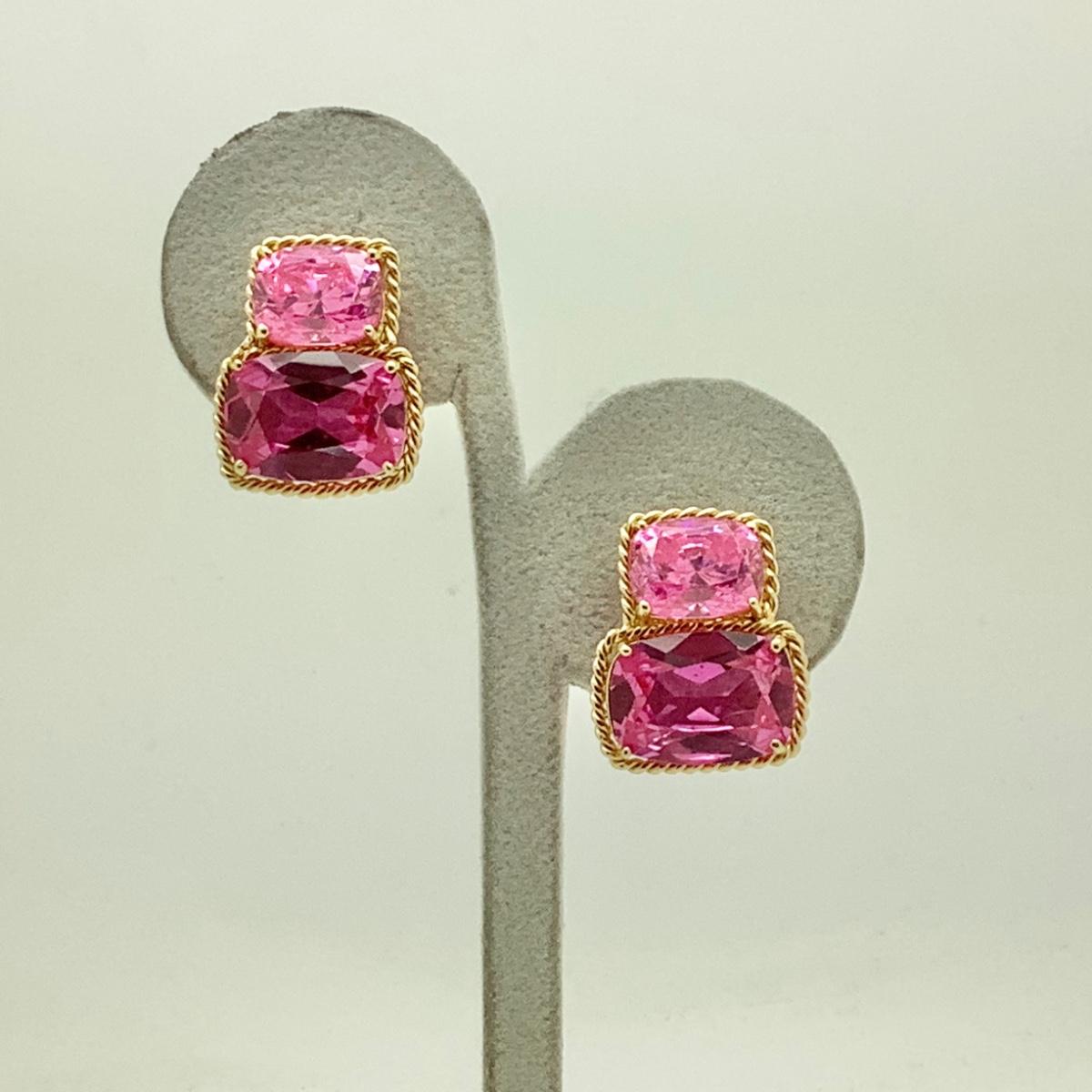 14k yellow gold post/lever back earrings with 2 oval pink sapphire corundum (weighing approx 12ct total) and 2 oval pink quartz (weighing approx 5-6ct total). The stones are prong set in a twist double frame, measuring approx 3/4" long x 5/8" wide, weighing 12.4gr.
