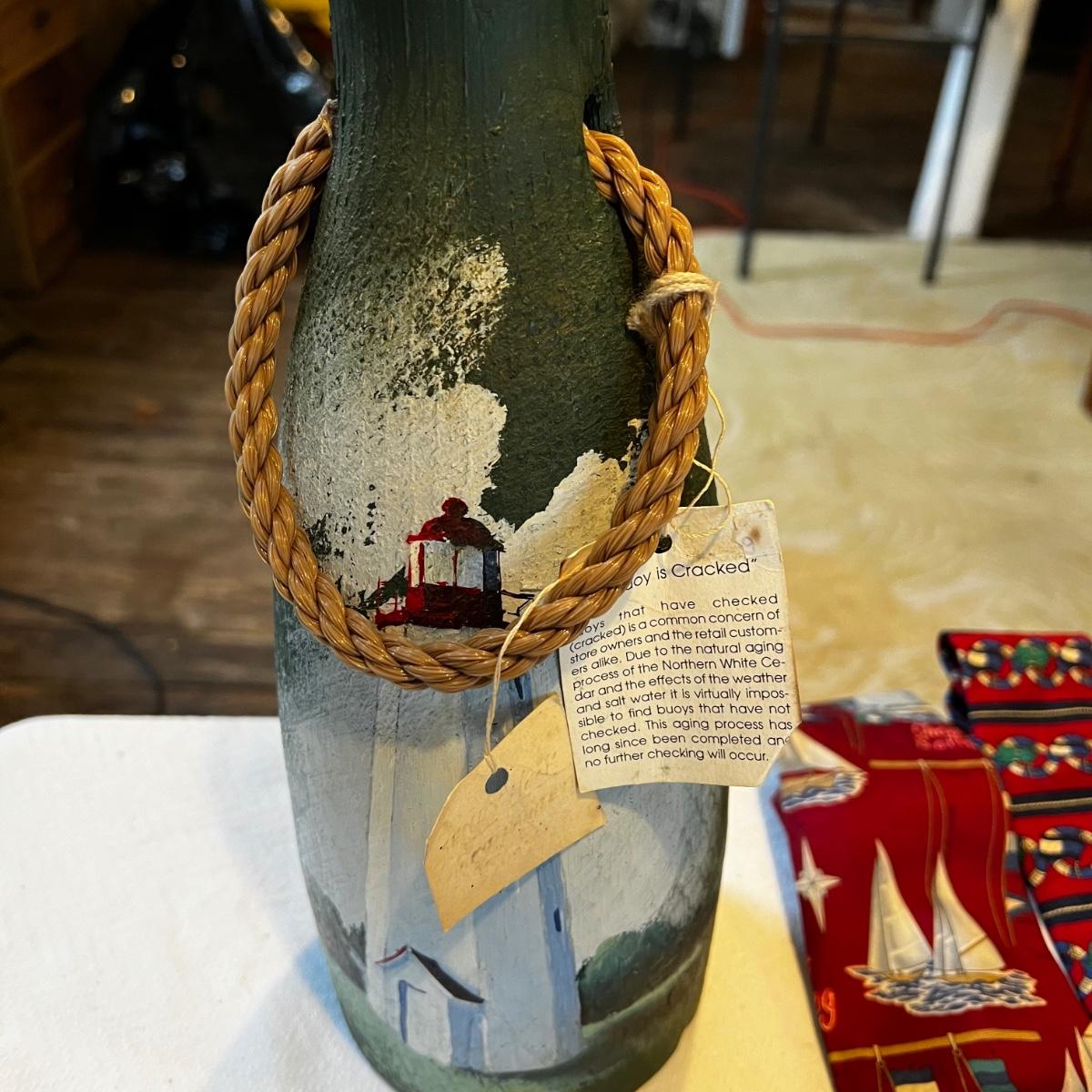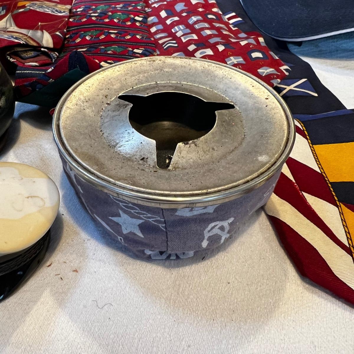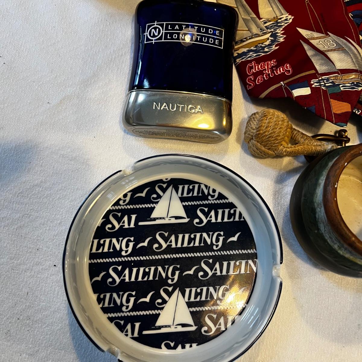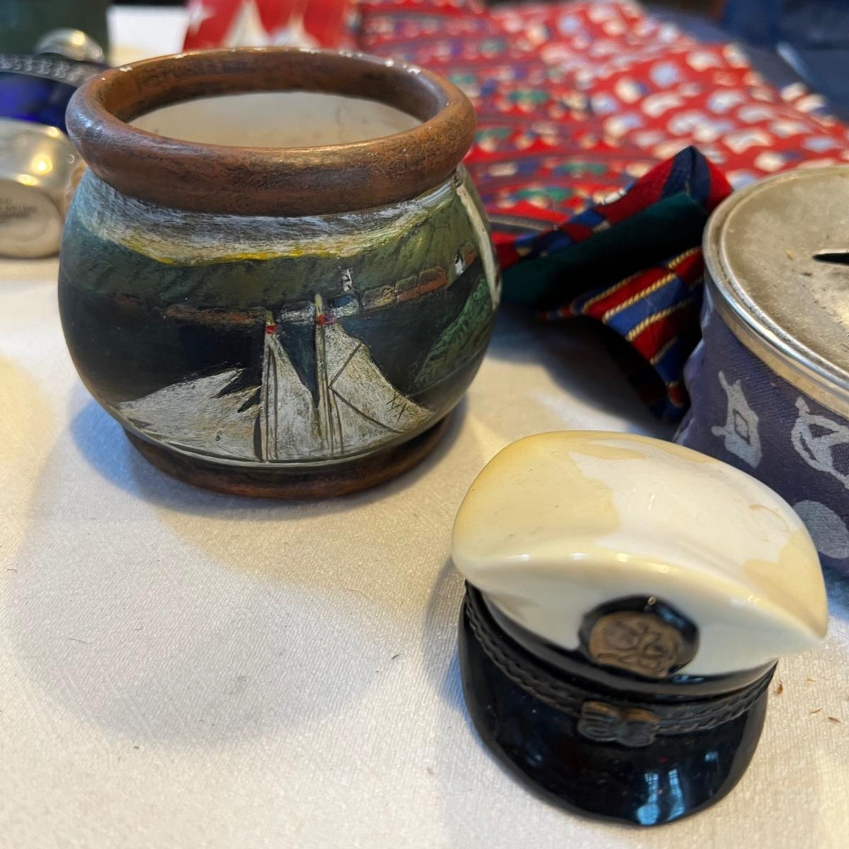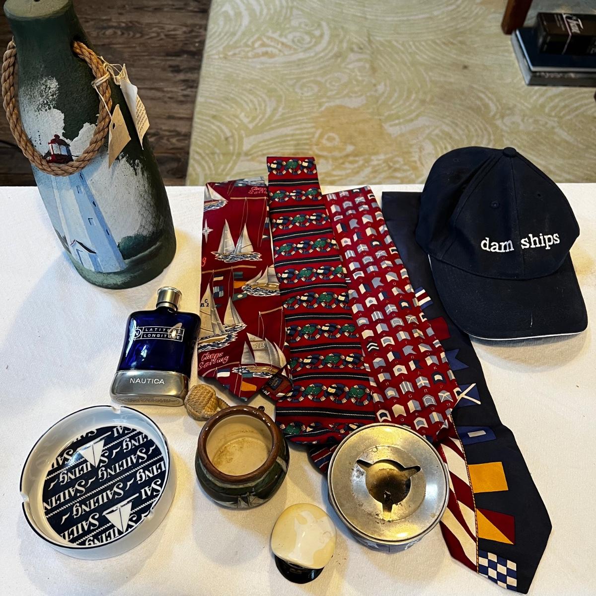 Ashtrays, pottery, vintage hand painted buoy, ties, and hat.