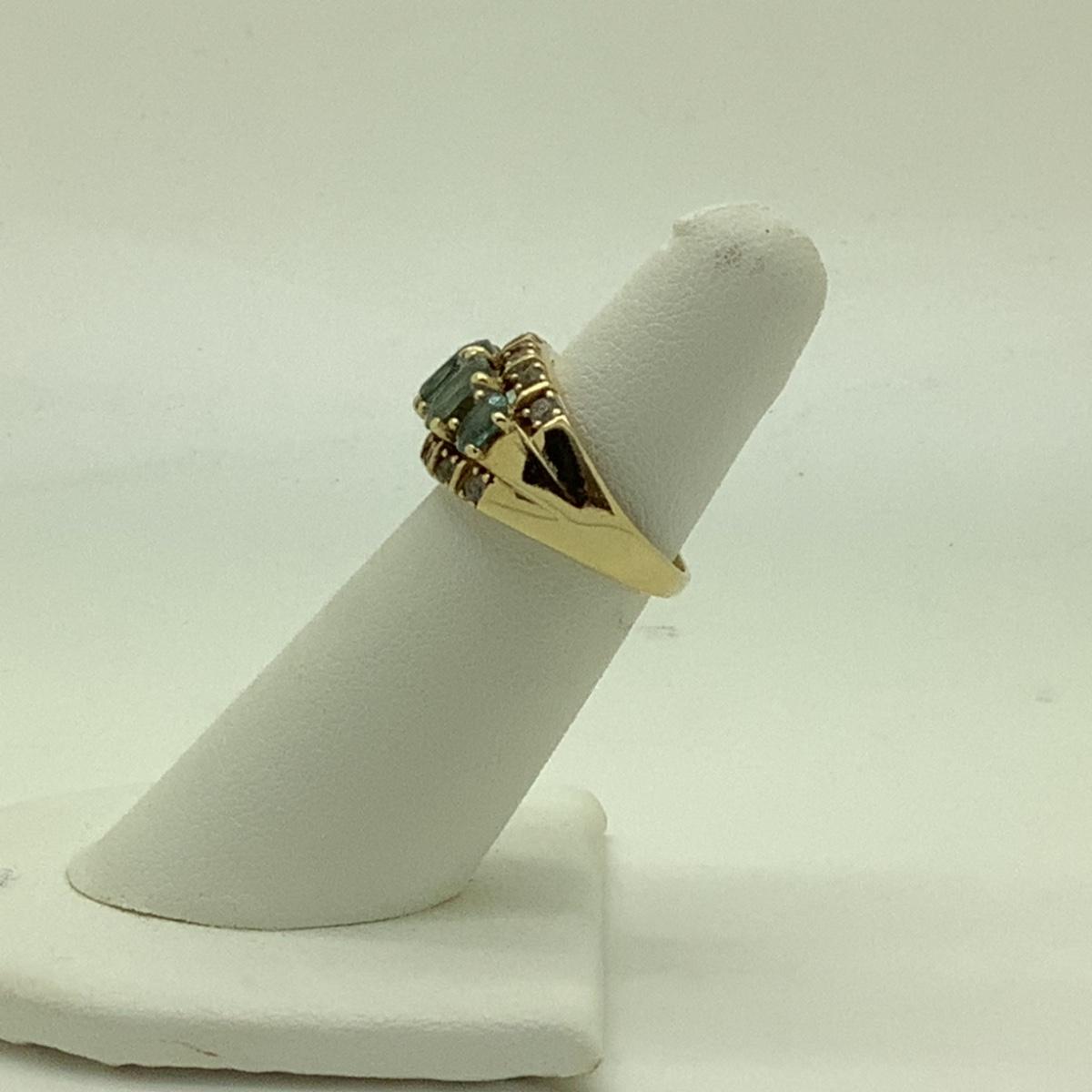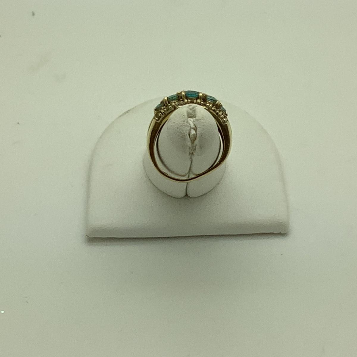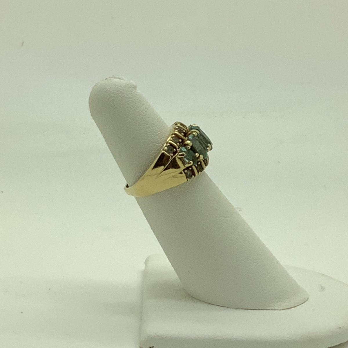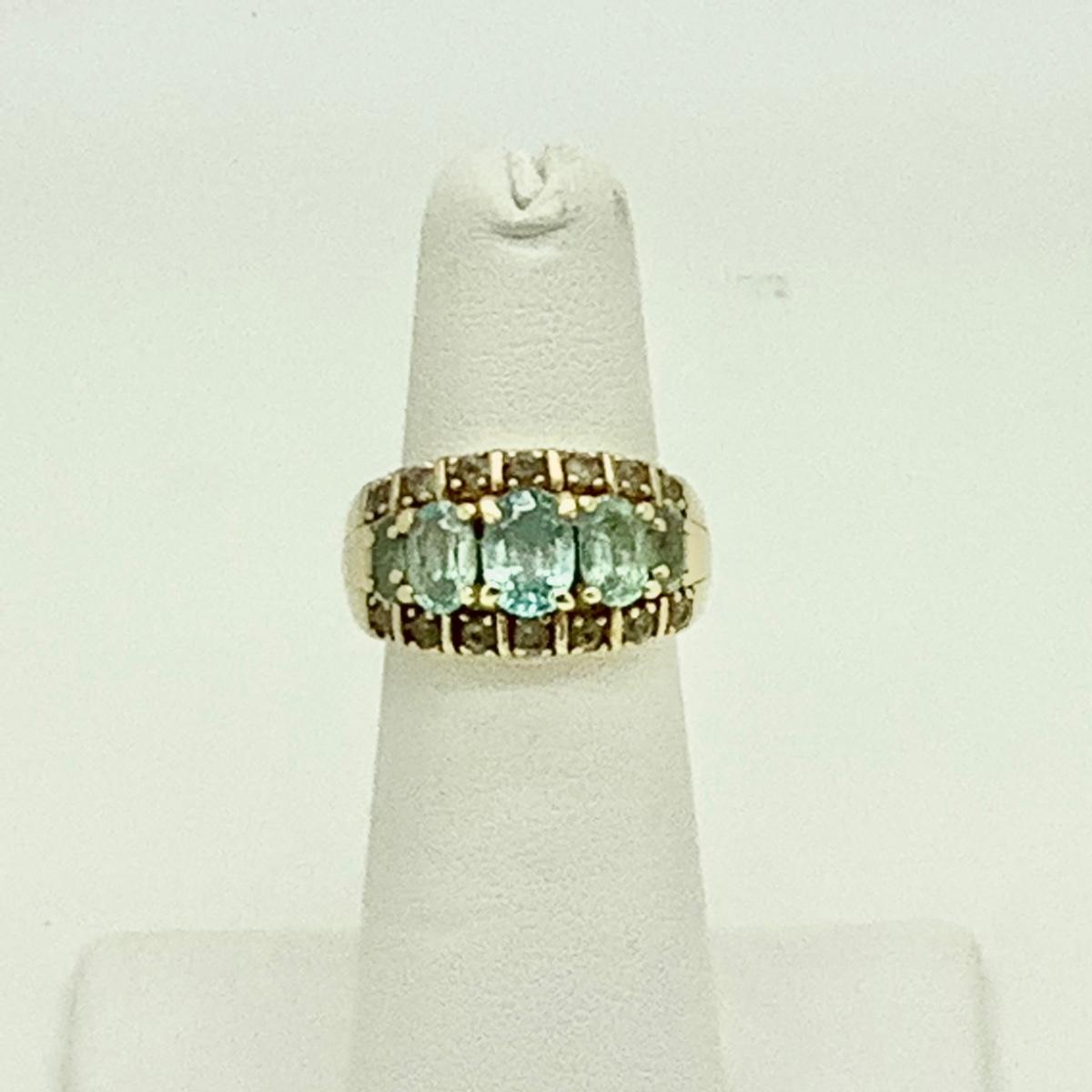 14k yellow gold ladies ring with 3 oval blue topaz (prong set) in the center and 14 small round white topaz (bar/prong set) on outside. The ring is approx 1/2" wide and weighs 4.8gr. Ring size is approx 5 3/4