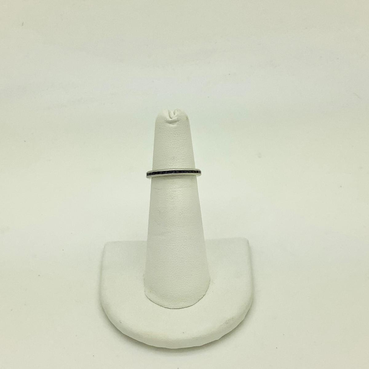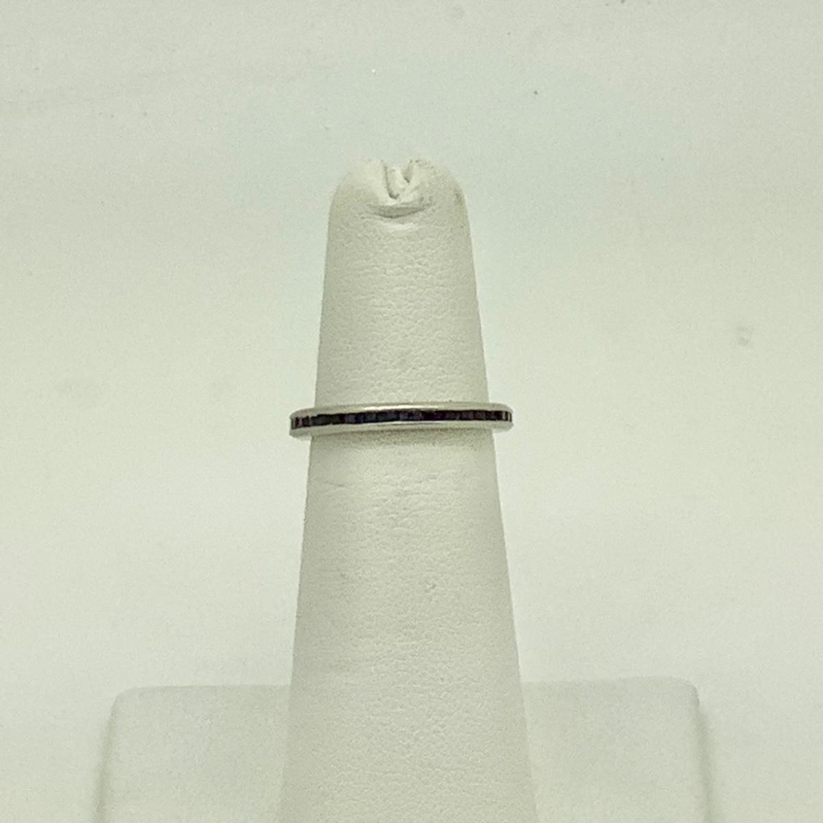 Platinum ladies eternity band with channel set square cut sapphires, 3mm wide, ring size 4 1/4, weighing 1.9gr.