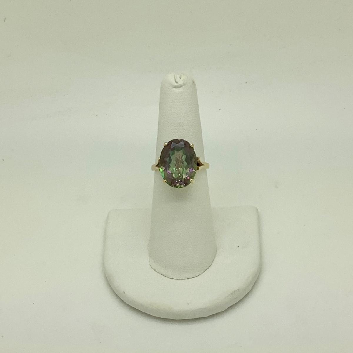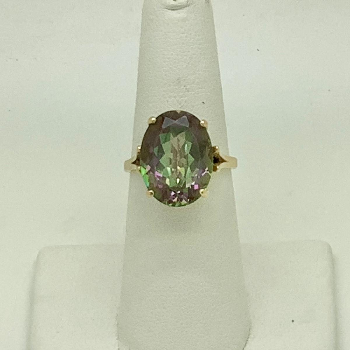 14k yellow gold ladies ring with oval mystic topaz (approx 9-10ct) set in 4 prongs, ring size 6 1/2, weighs 5.3gr.