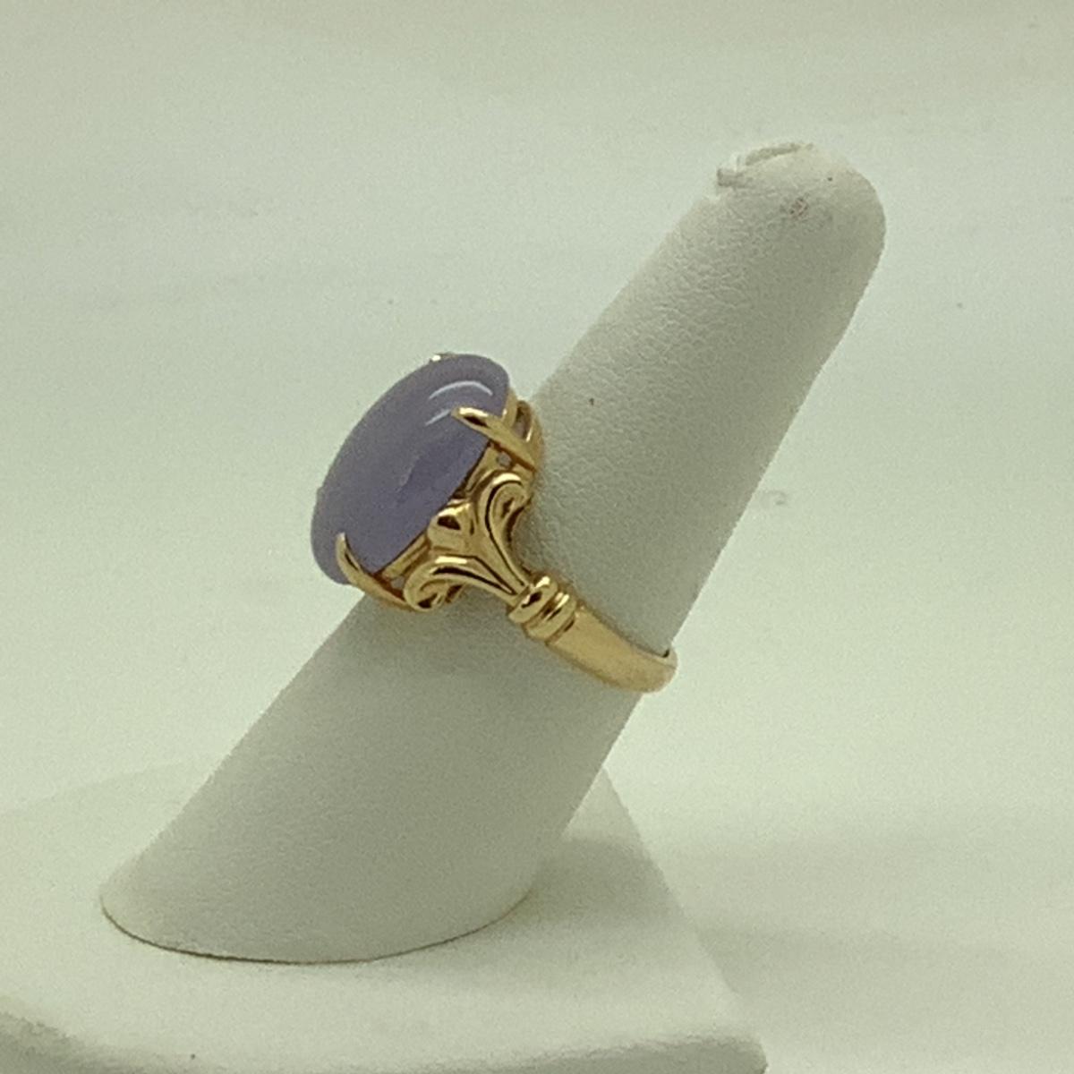 14k yellow gold ladies ring with oval purple jade set in 4 prongs, ring size 7, weighing 6.4gr.