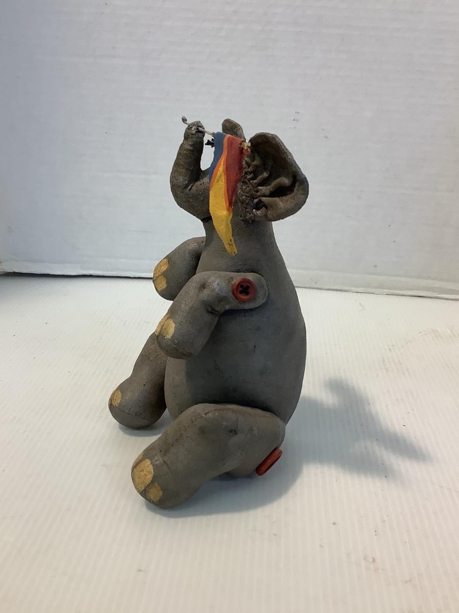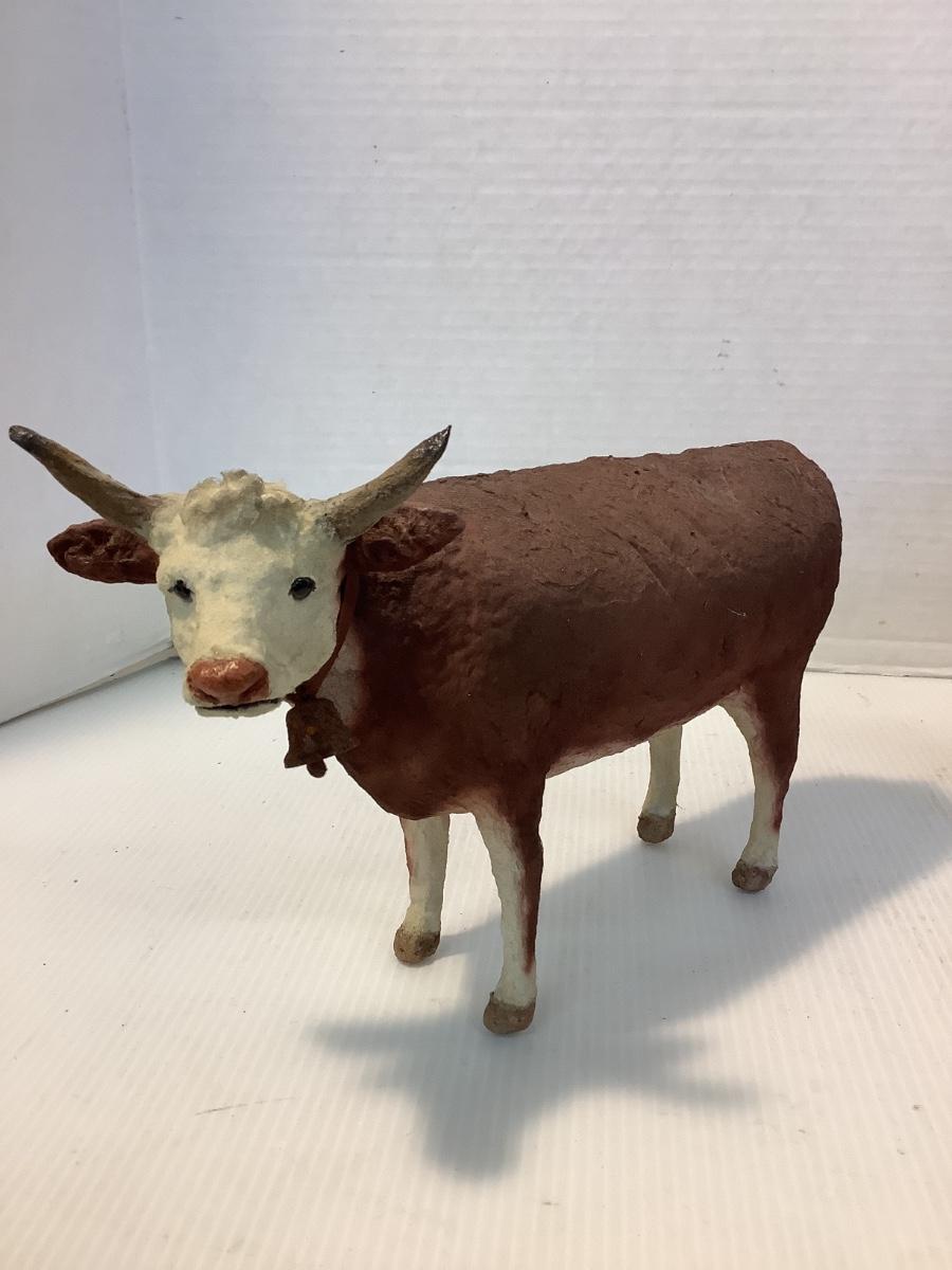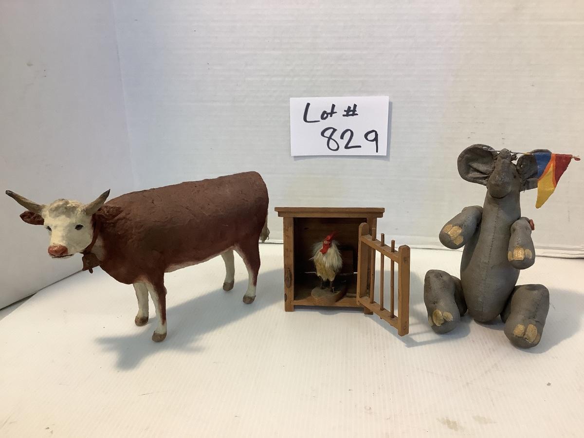 Original Craig Yenke Cow, handmade using wire, paper mache & cotton. Chicken in coop & hand painted stuffed elephant