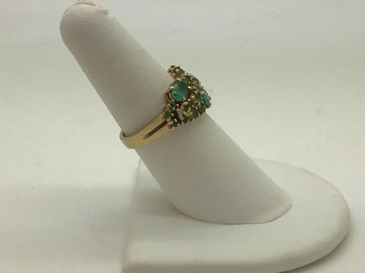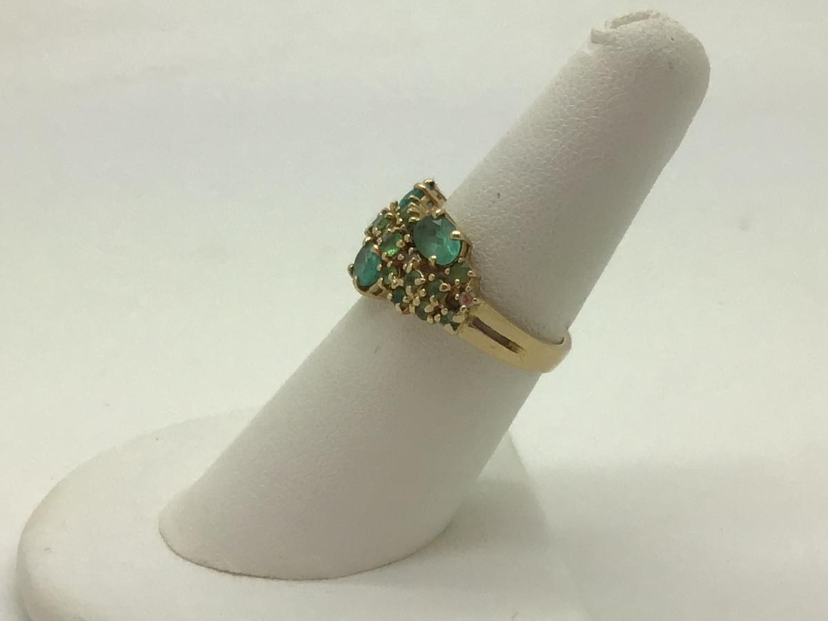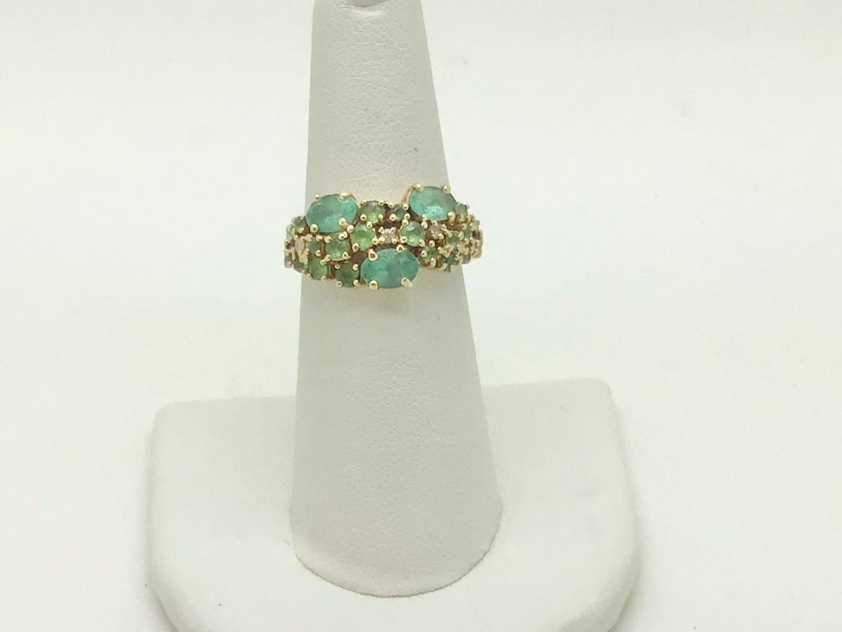 14k yellow gold cluster ladies ring with 3 oval emeralds (approx 1ct total weight), 19 round peridots and 4 round diamonds (weighing approx .05ct total). The stones are prong set, ring size 6 1/2, weighing 4.3gr.
