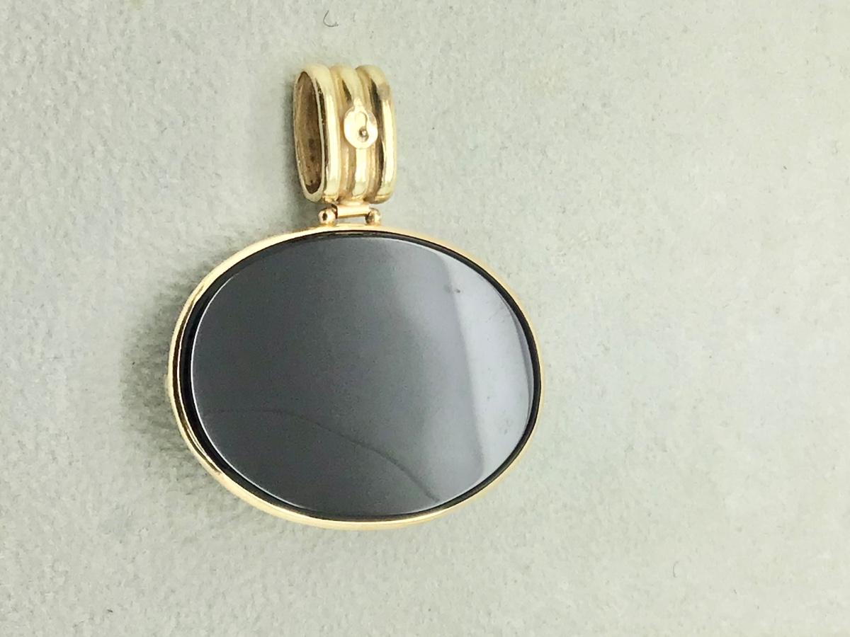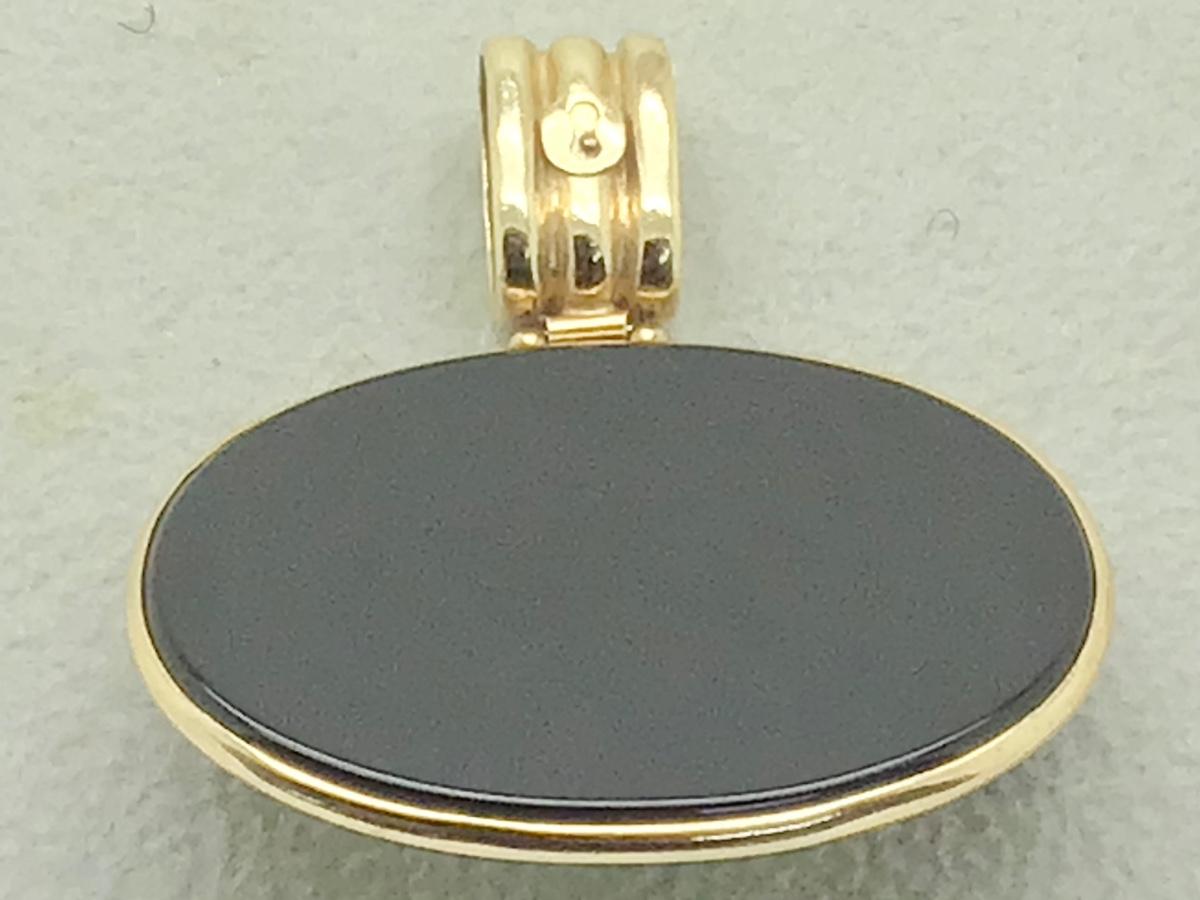 14k yellow gold large oval pendant with oval turquoise bezel set in center (approx 18 x 13mm) and onyx inlaid around edge. The pendant measures approx 1 1/4” long (including bail) and 1 1/2” wide and weighs 14.1gr.