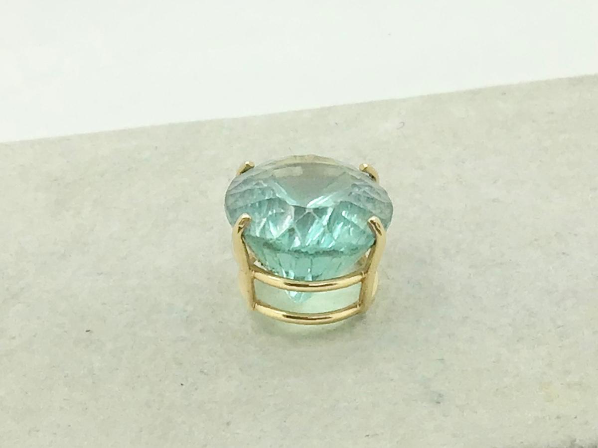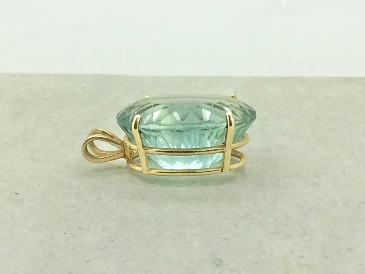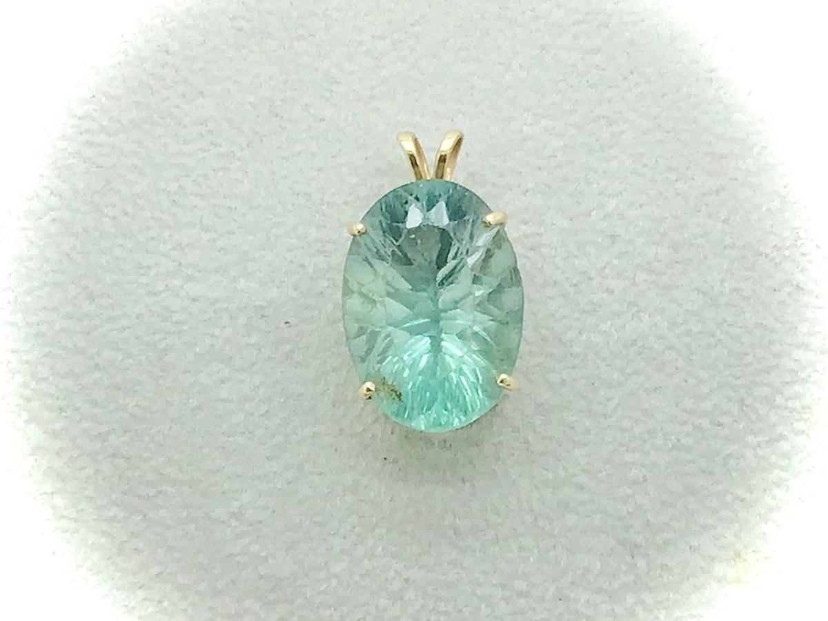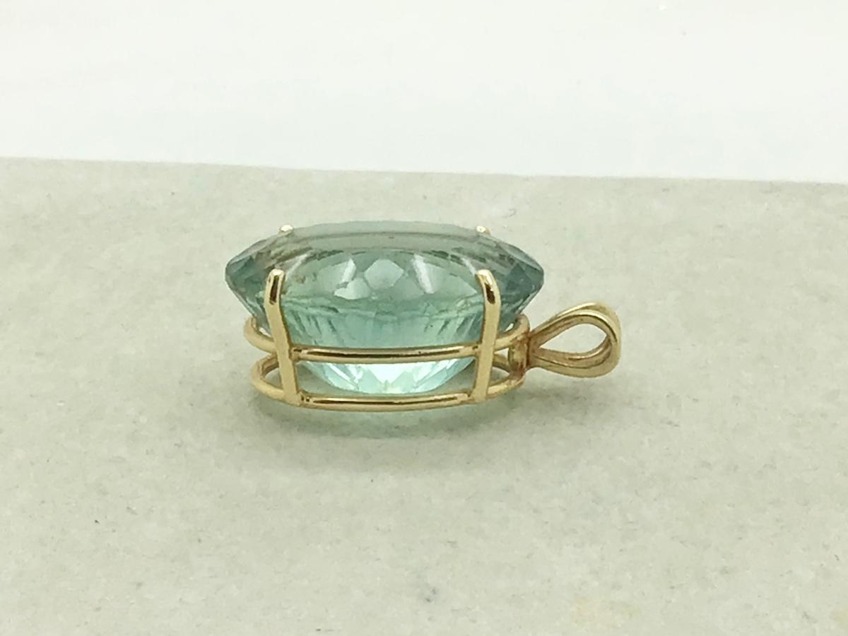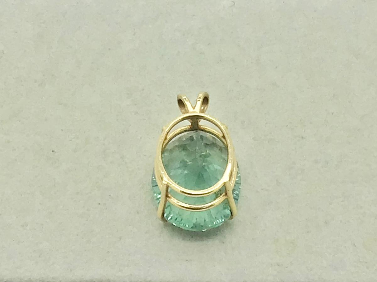 14k yellow gold 4 prong pendant with approx 25-30ct oval blue/green starburst faceted topaz measuring 18 x 24mm. The pendant measures approx 1 1/4” long (including bail) and 5/16” wide and weighs 10.5gr.