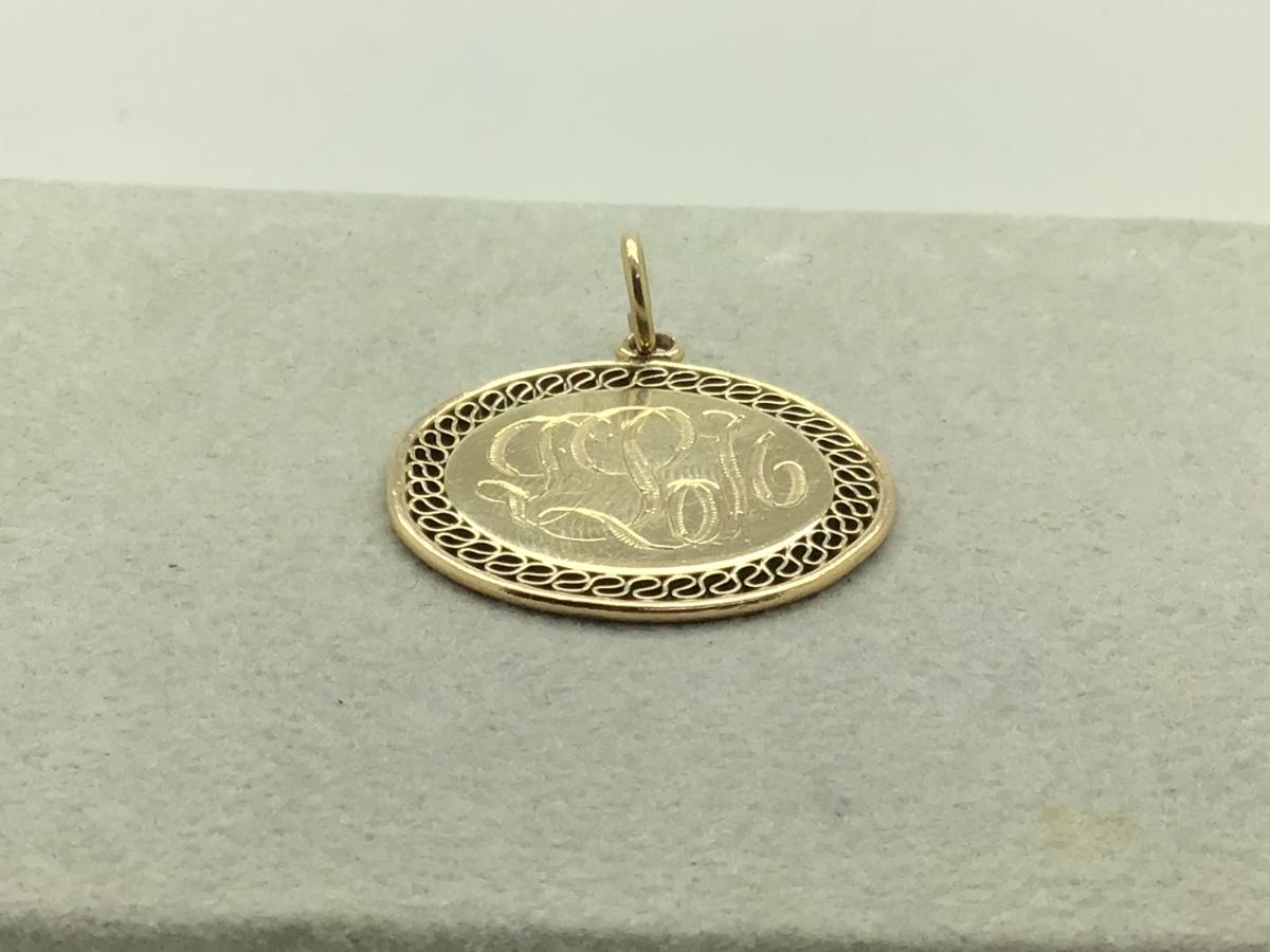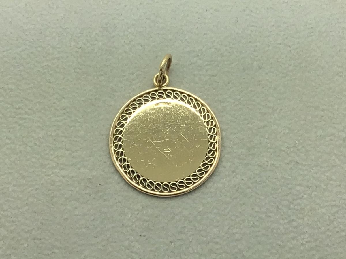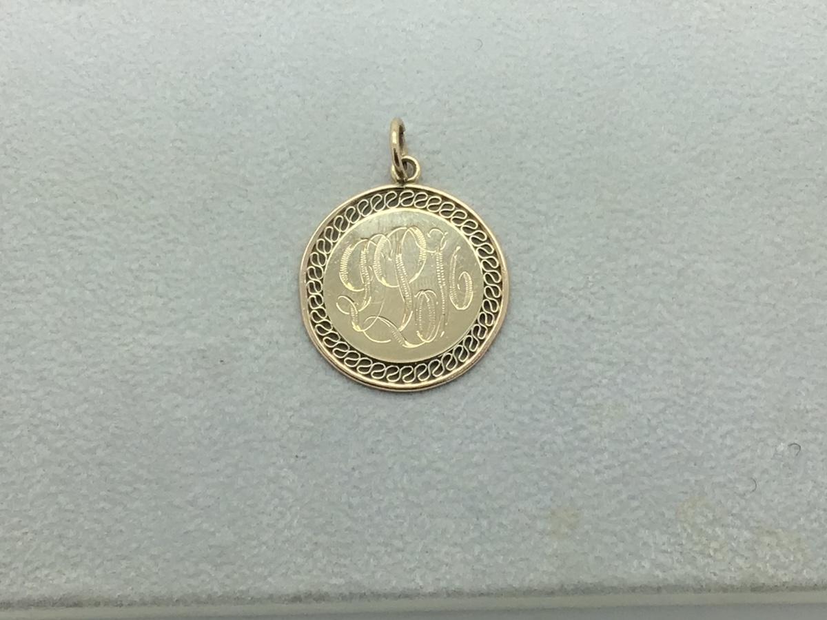 14k yellow gold round disc pendant with thick ring bail, “DLM” engraving, measuring 1 1/8” diameter x 1 1/2” long (including bail) and weighs 8.7gr.