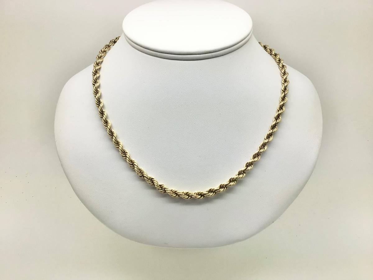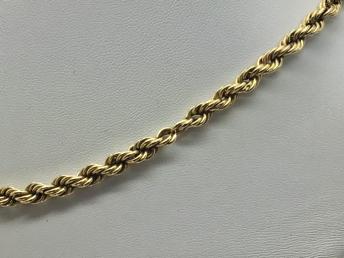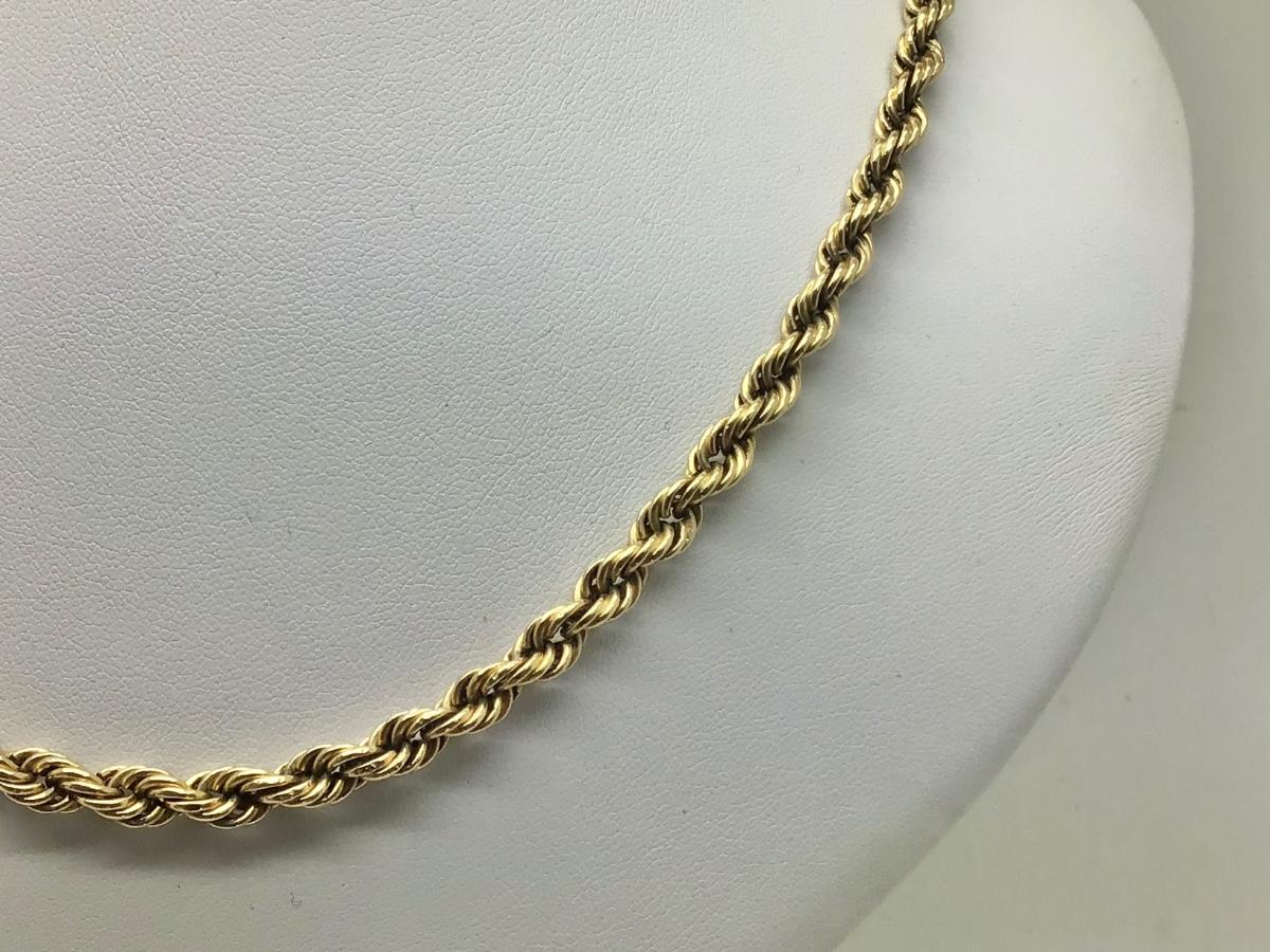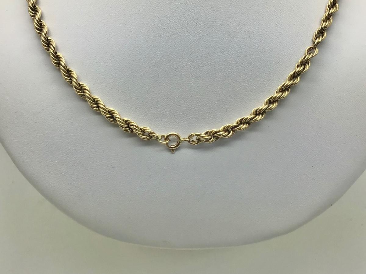 14k yellow gold rope chain, 18” long and 5mm width with spring ring clasp, weighing 14.1gr. NOTE: There is a “thinner” small section 2” from the clasp where a few small links are missing- shown in close up picture.