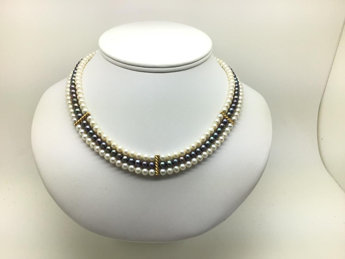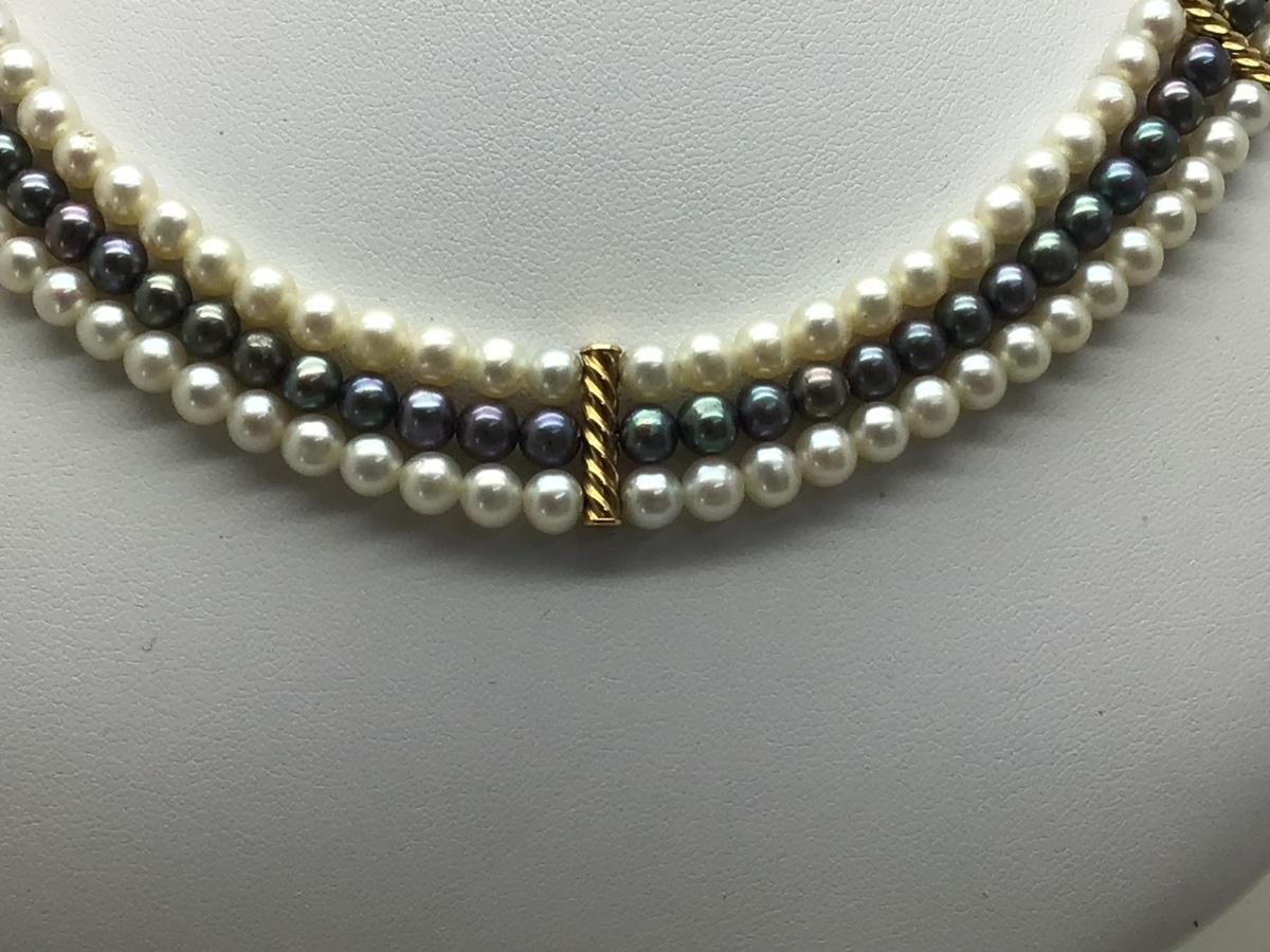 18” triple strand of 5mm black and white pearls with 18K yellow gold clasp and 3 accent bars each measuring approx 1/2” long.