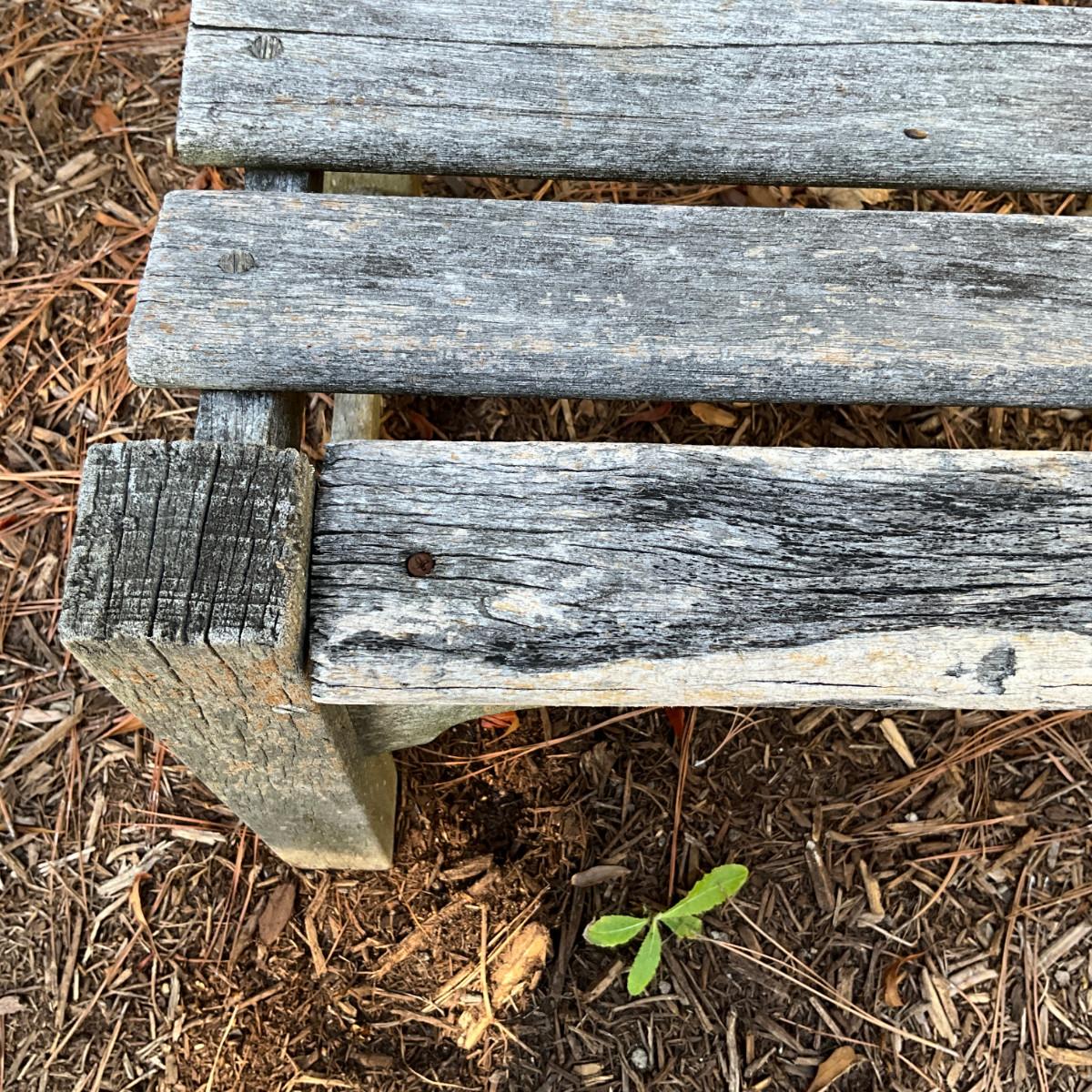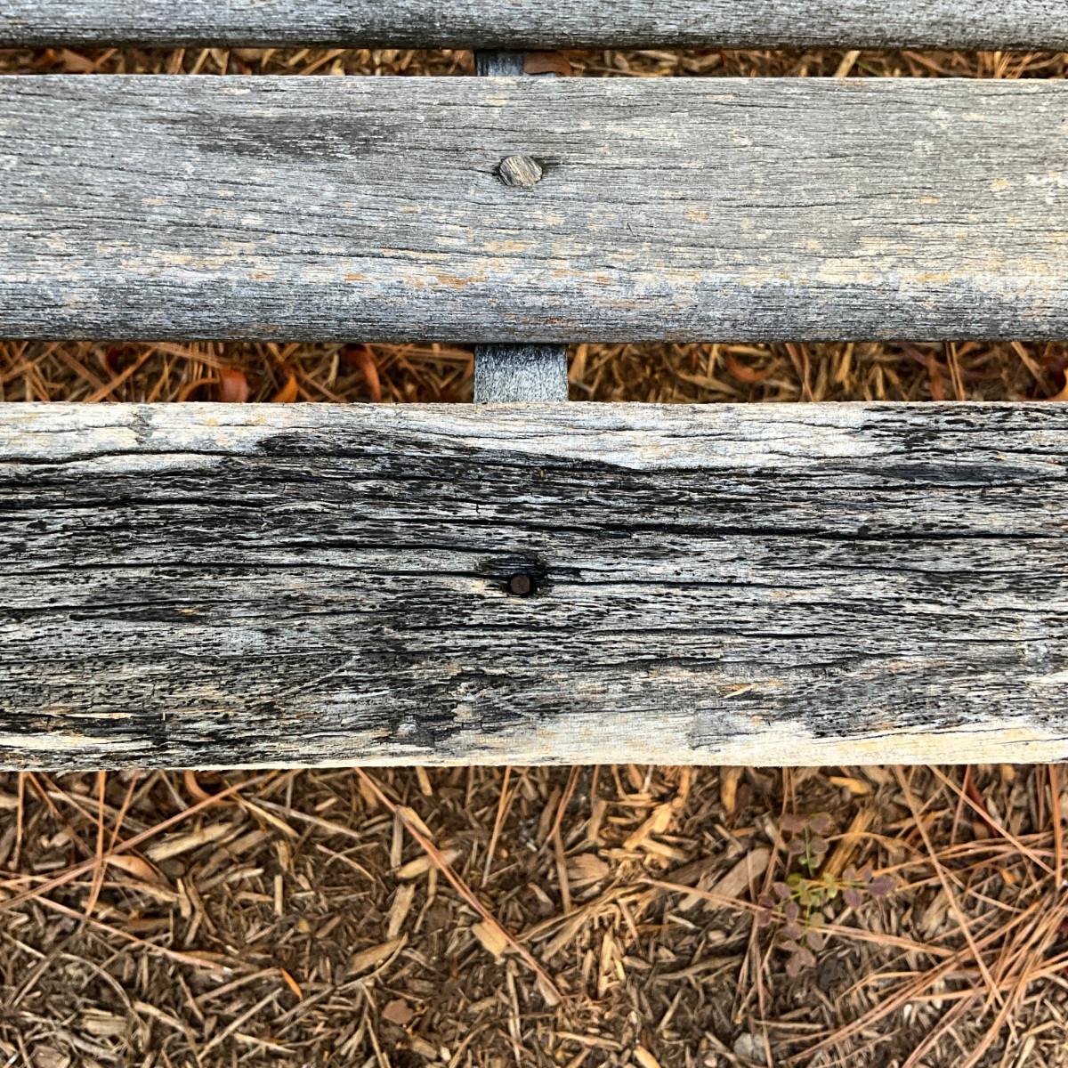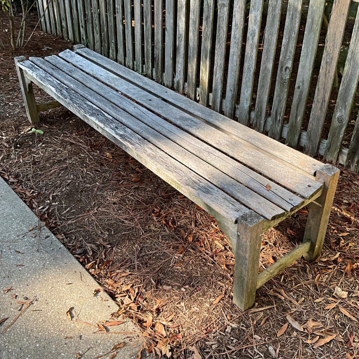Bench is very weathered and a few areas have been replaced with screws/nails
