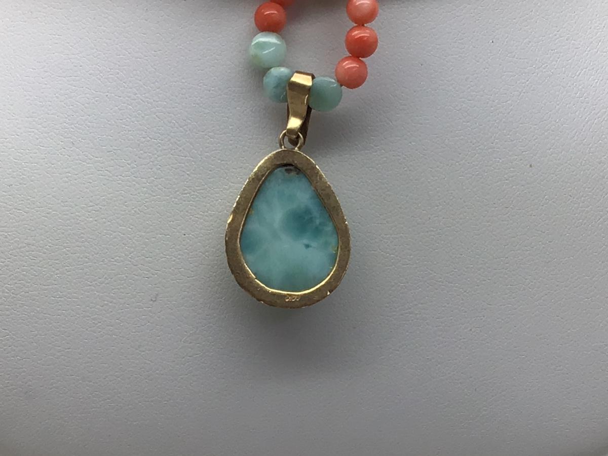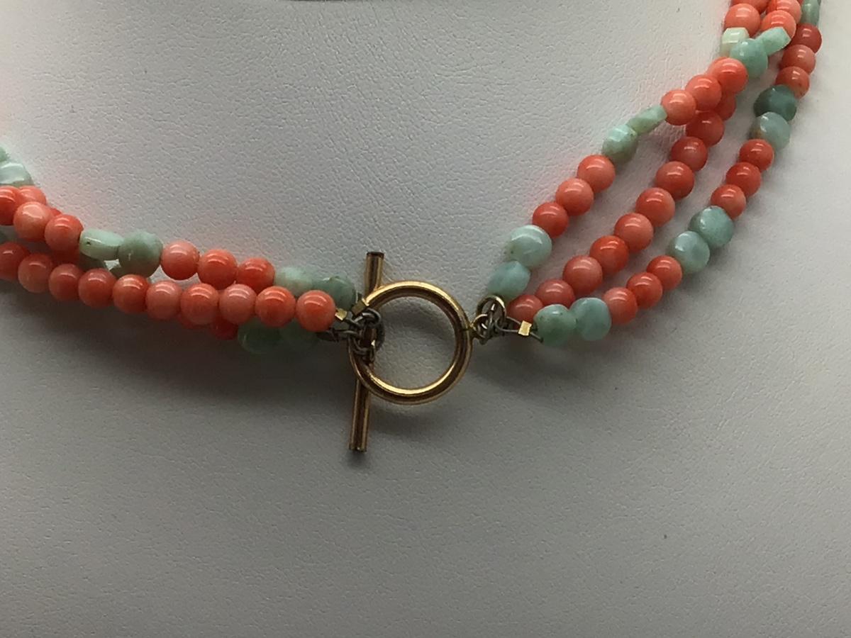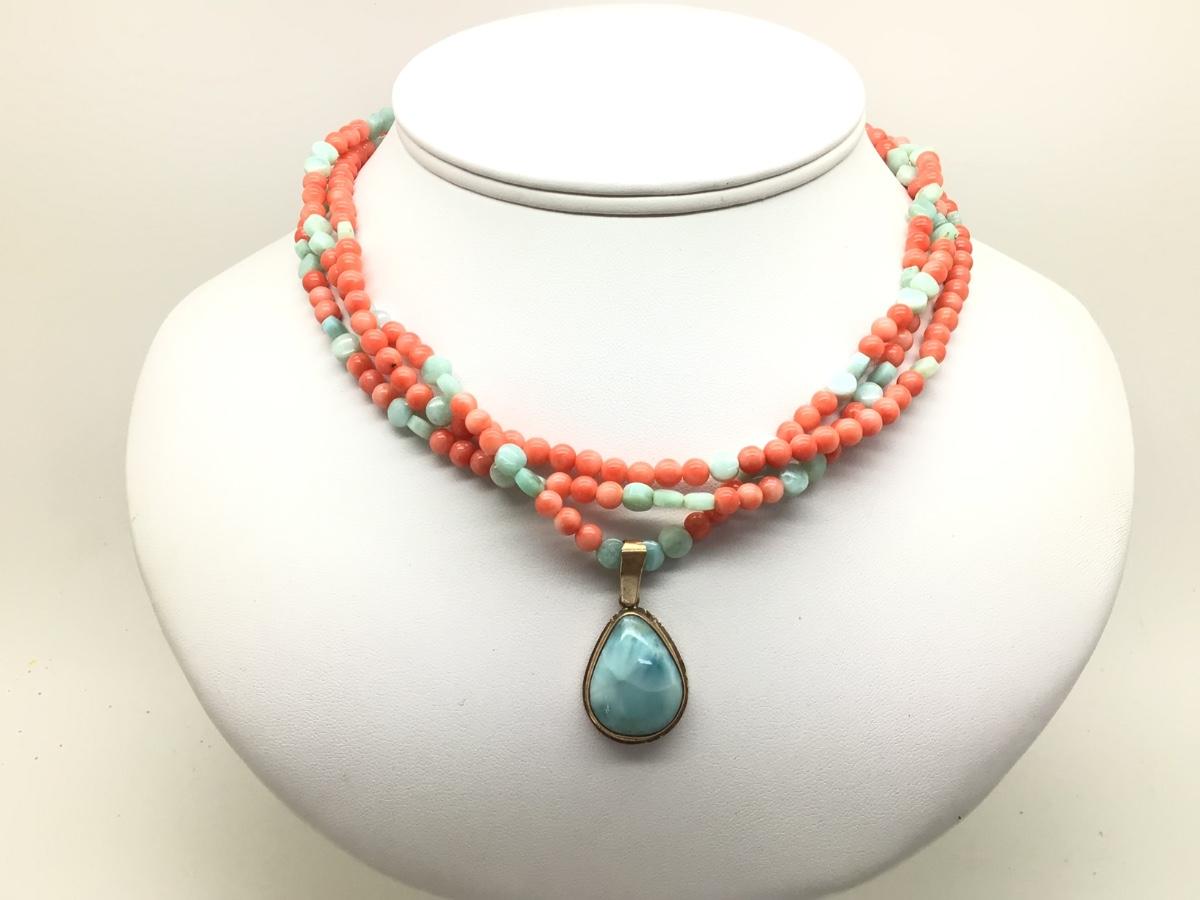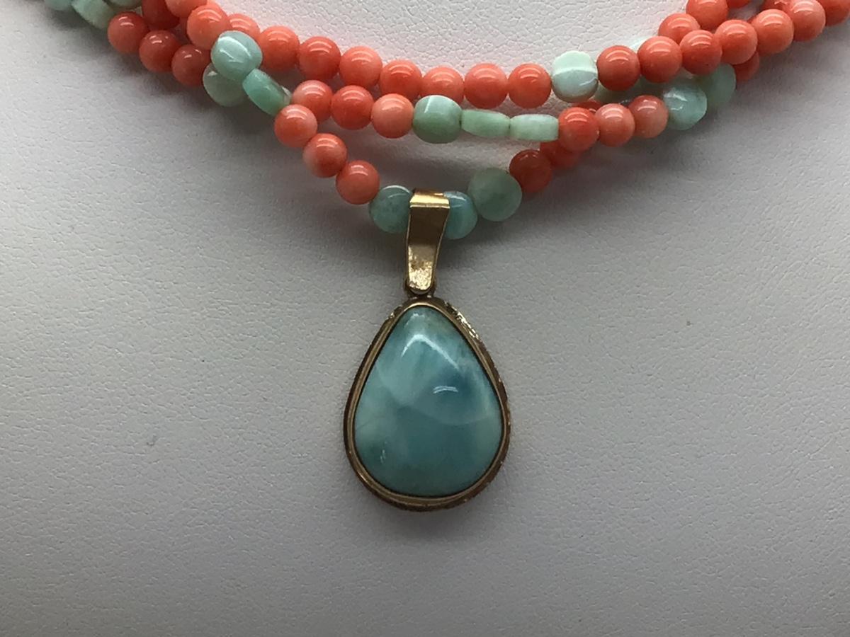 16” 3 strand Jade and coral necklace, 14k yellow gold pendant with bezel set pear shaped Jade (measuring 1 1/4” long x 3/4” wide) and 1/20 14k gold filled clasp.