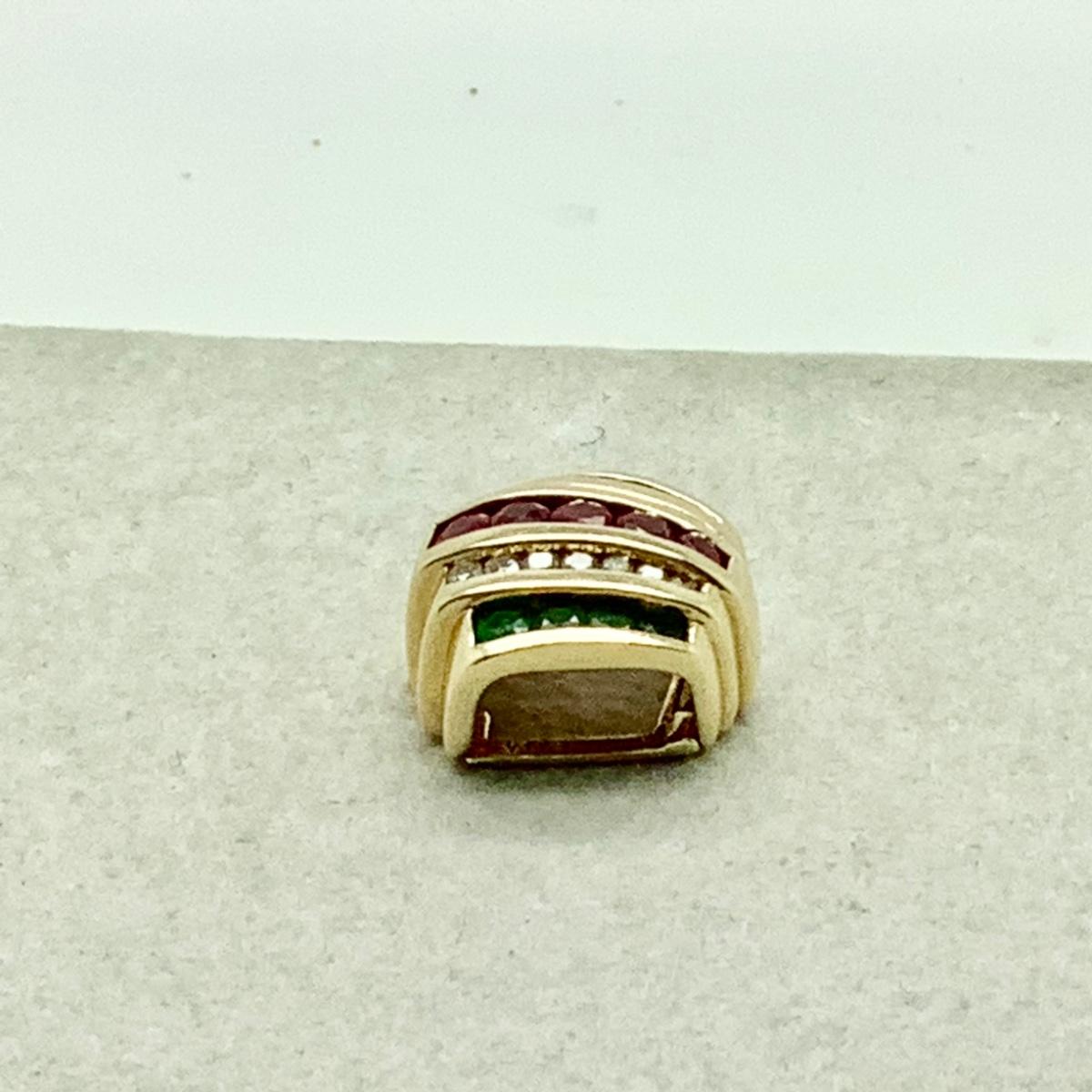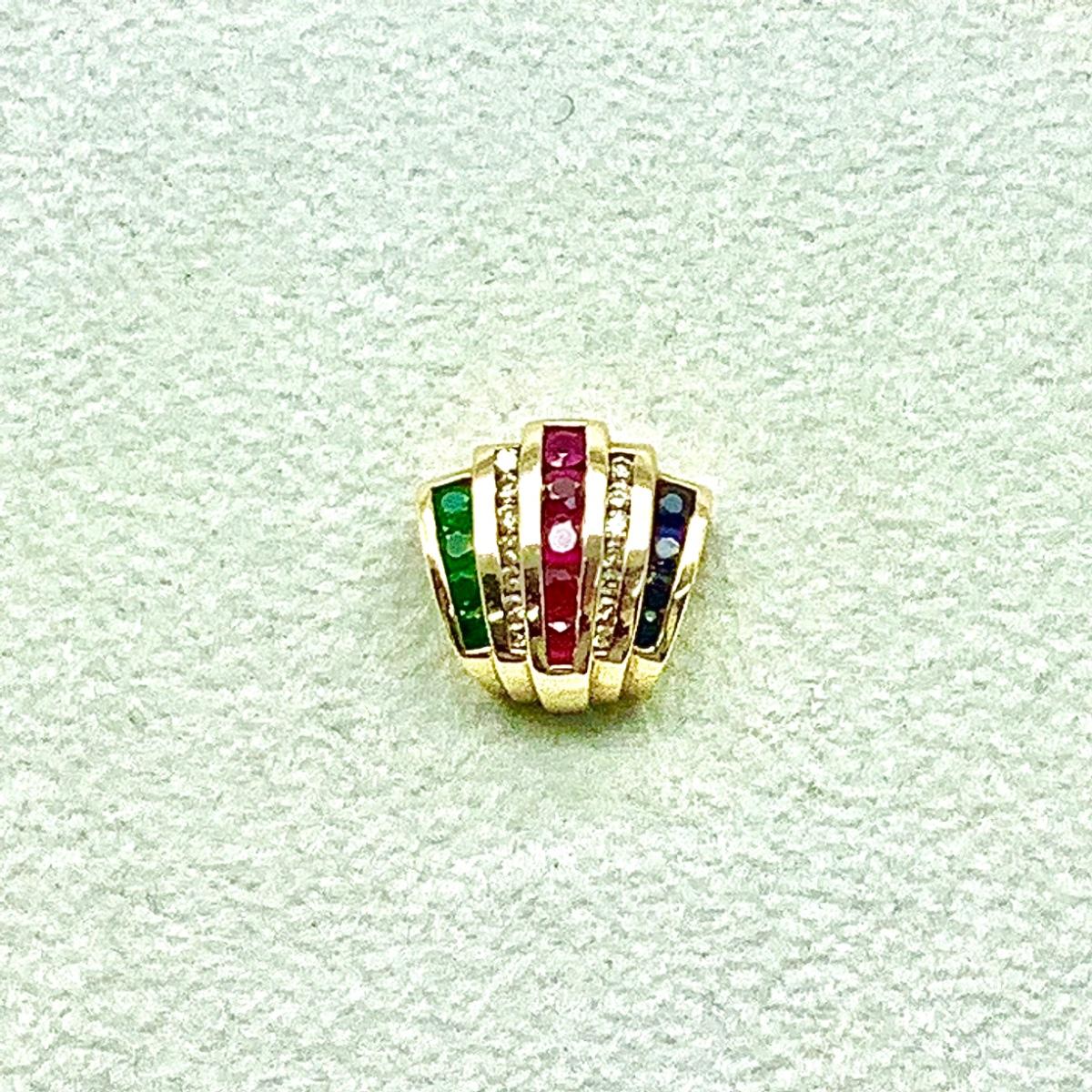 Approximately .33 ct. total weight Diamonds (14) with approximately .25 ct. total weight ruby (5) , .15 ct. total weight emeralds ( 4) , and approximately .15 ct. total weight sapphires (4). Measuring 5/8" long x 5/8" wide and weighing 4.7 grams