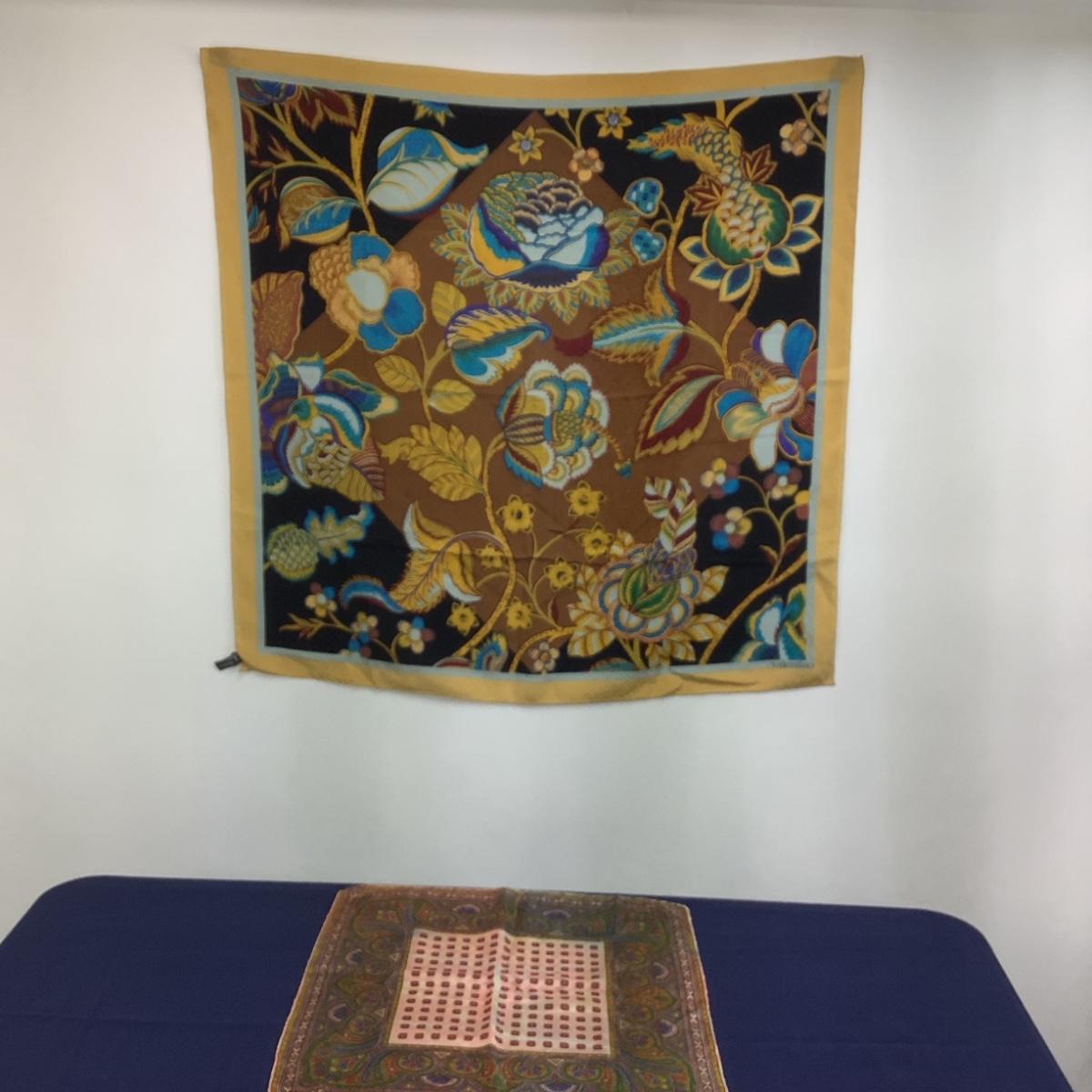 There are 2 scarves in this lot, they are both silk with hand rolled edges.