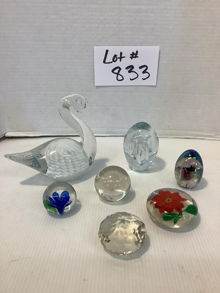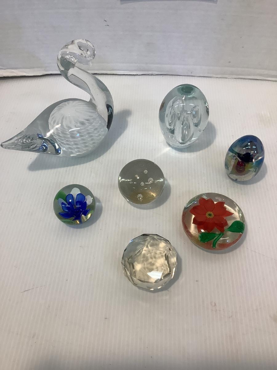 Assorted paperweights. The Swan 5 1/2" x 6" is made by FN Ronneby Konstglas, Sweden.