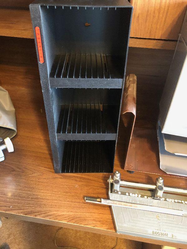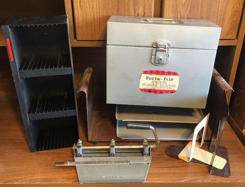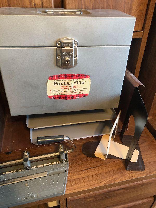 #834 Grouping of Metal Office Items: File holder, paper punch