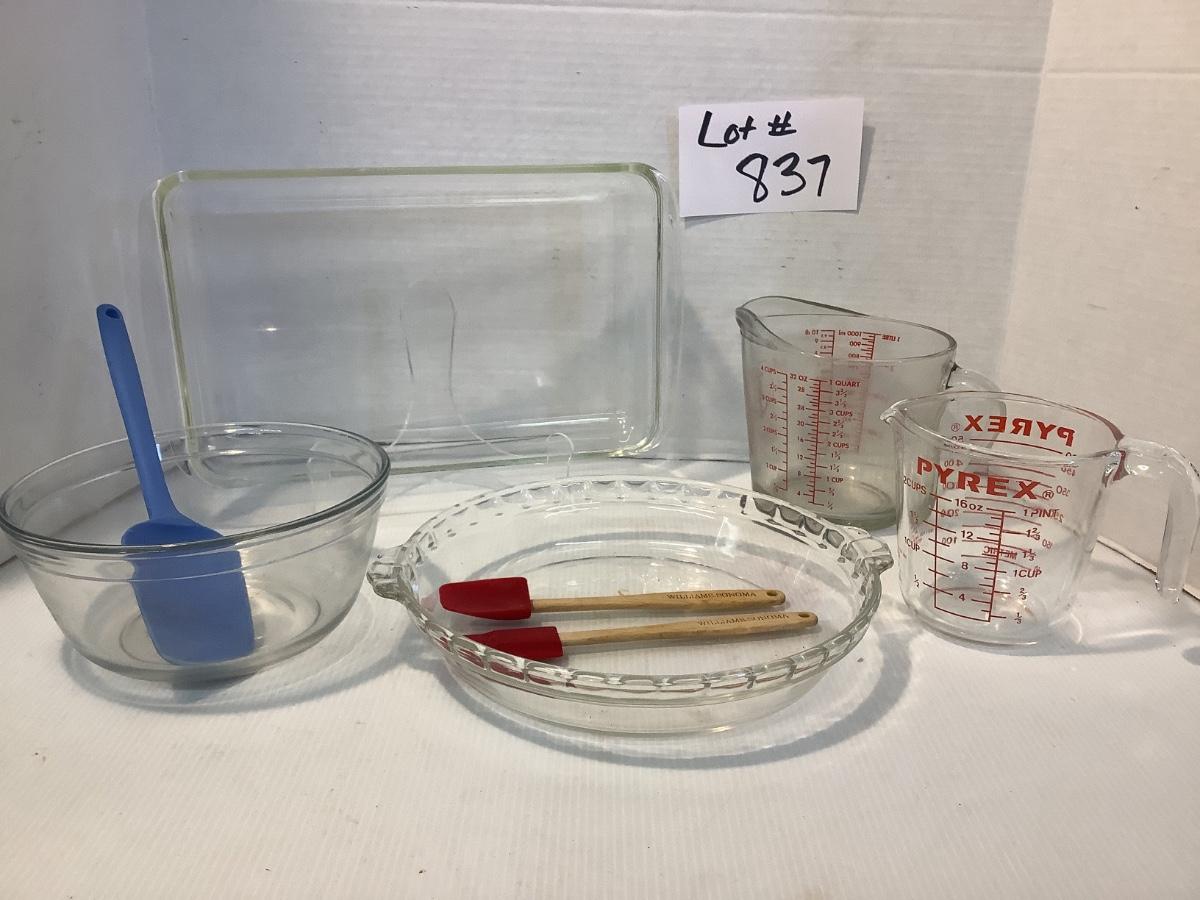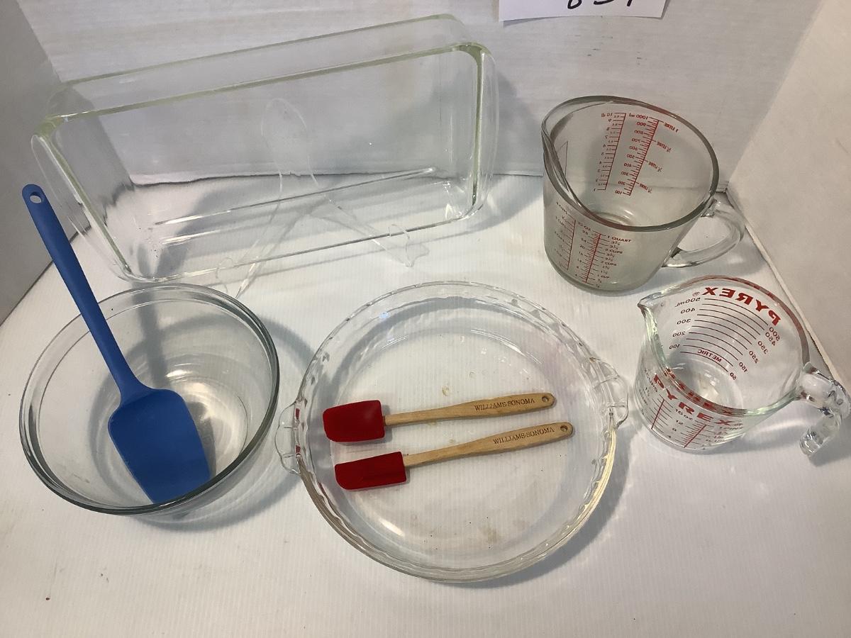 2 measuring cups, pie dish, mixing bowls, pan, & utensils