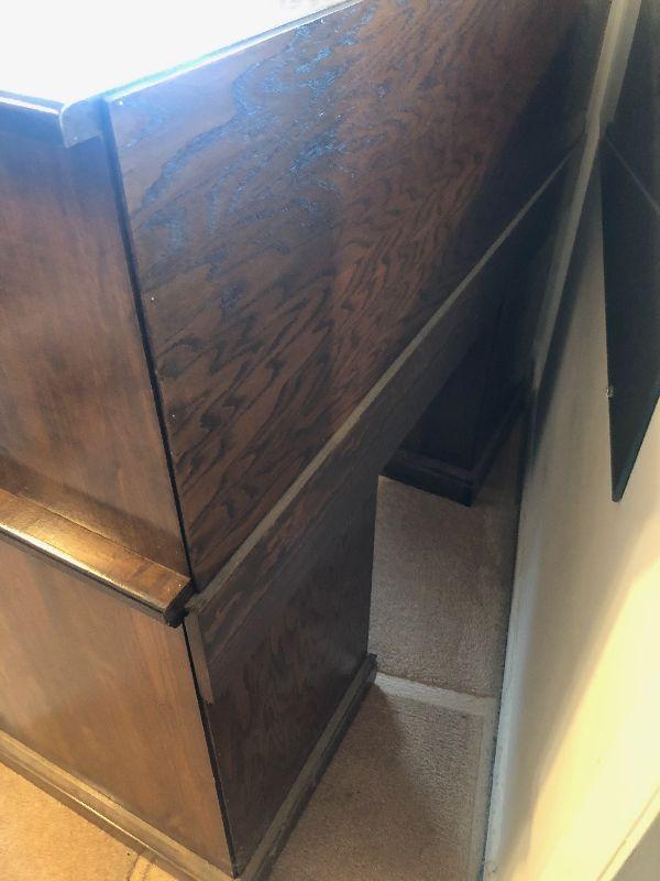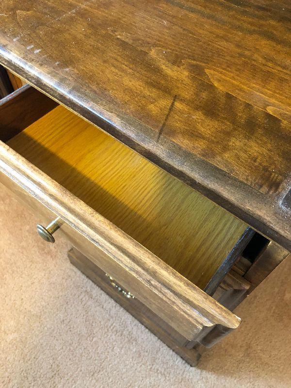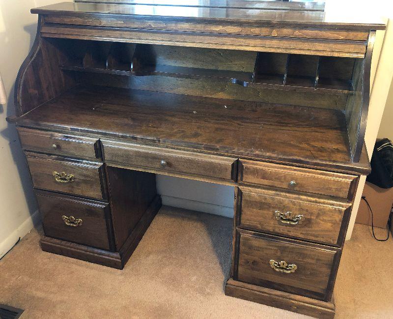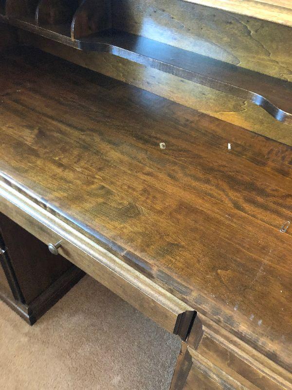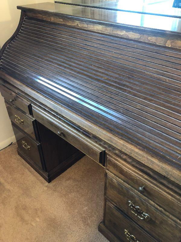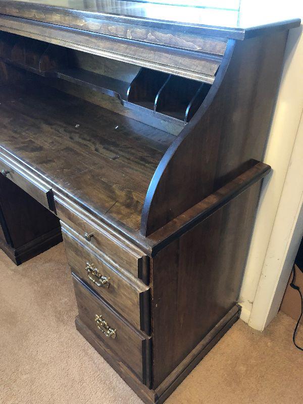Great for home office. Used 54 x 20 x 44 Good Condition Real Wood Walnut Stained Pine . Good Condition.