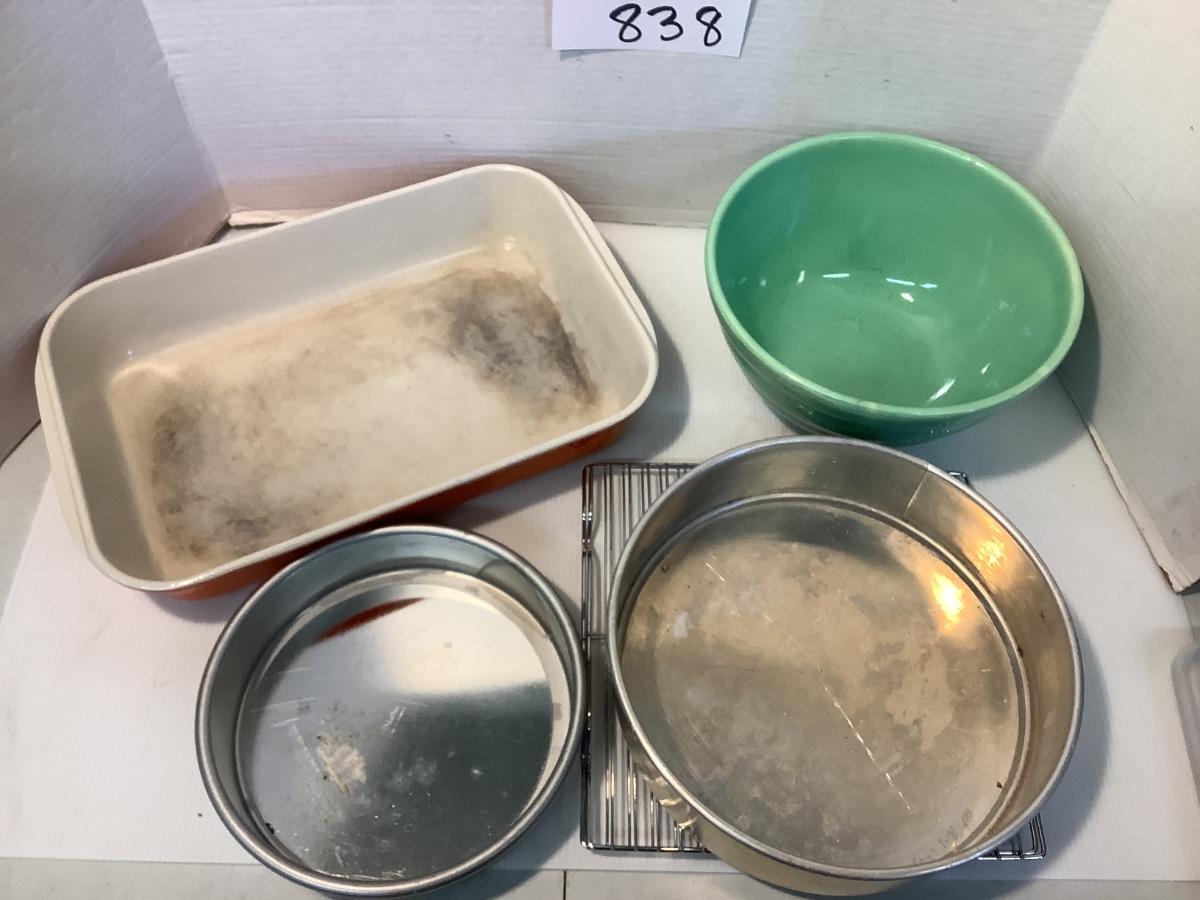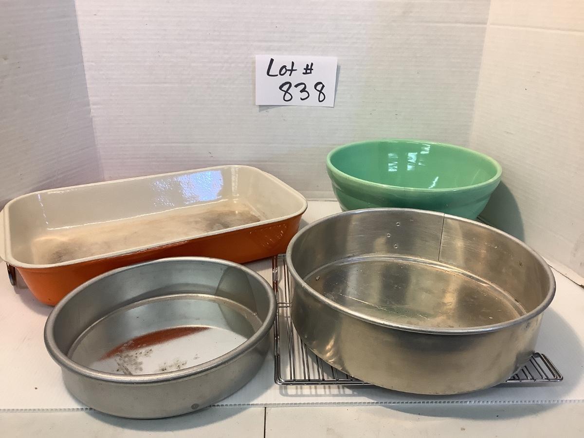 Includes Le Crueset baking pan, green mixing bowls & aluminum baking pans